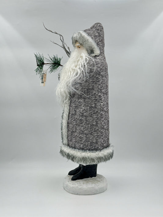 17" Gray Santa Figurine – Faux Fur Coat with Pine Branch