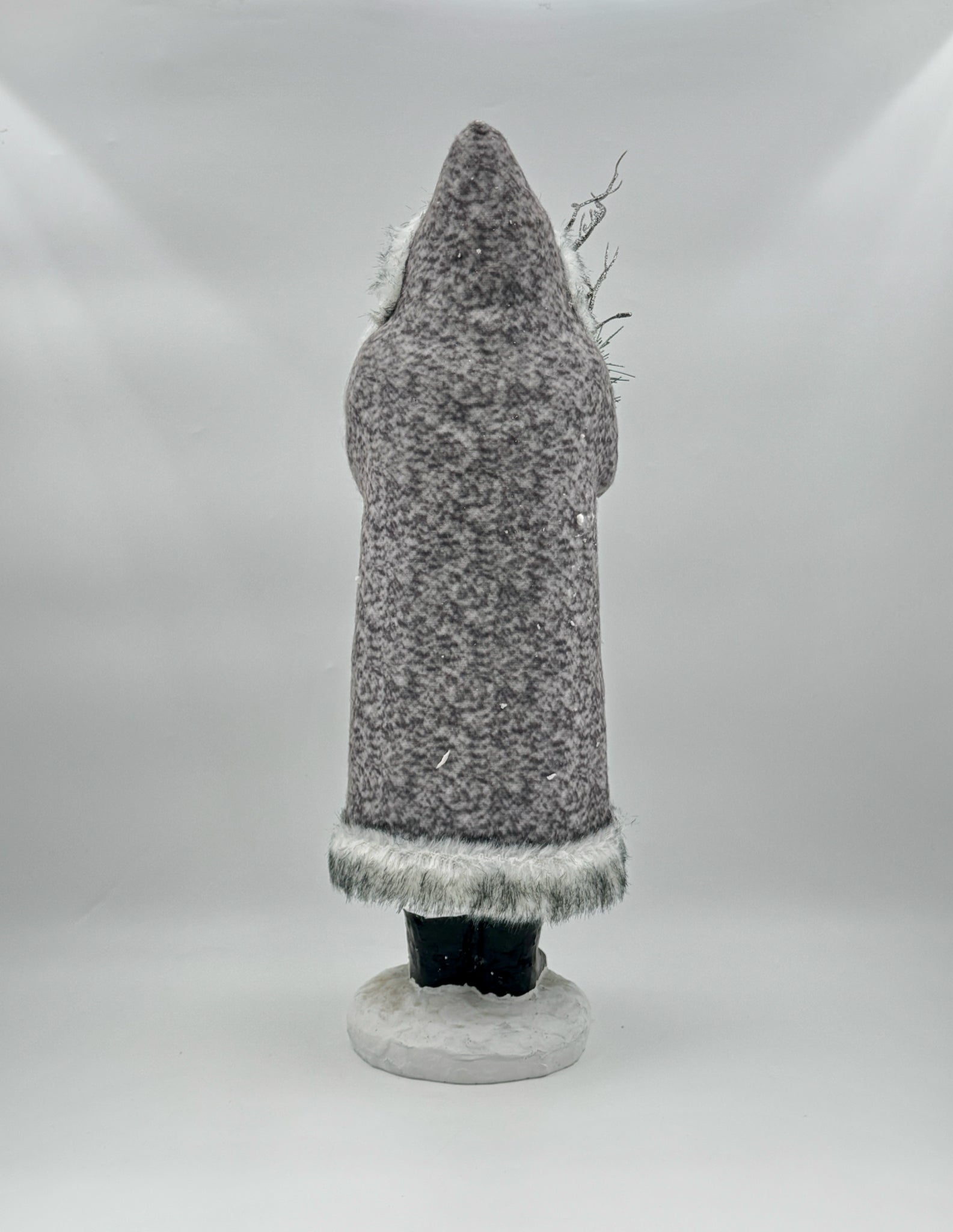 17" Gray Santa Figurine – Faux Fur Coat with Pine Branch