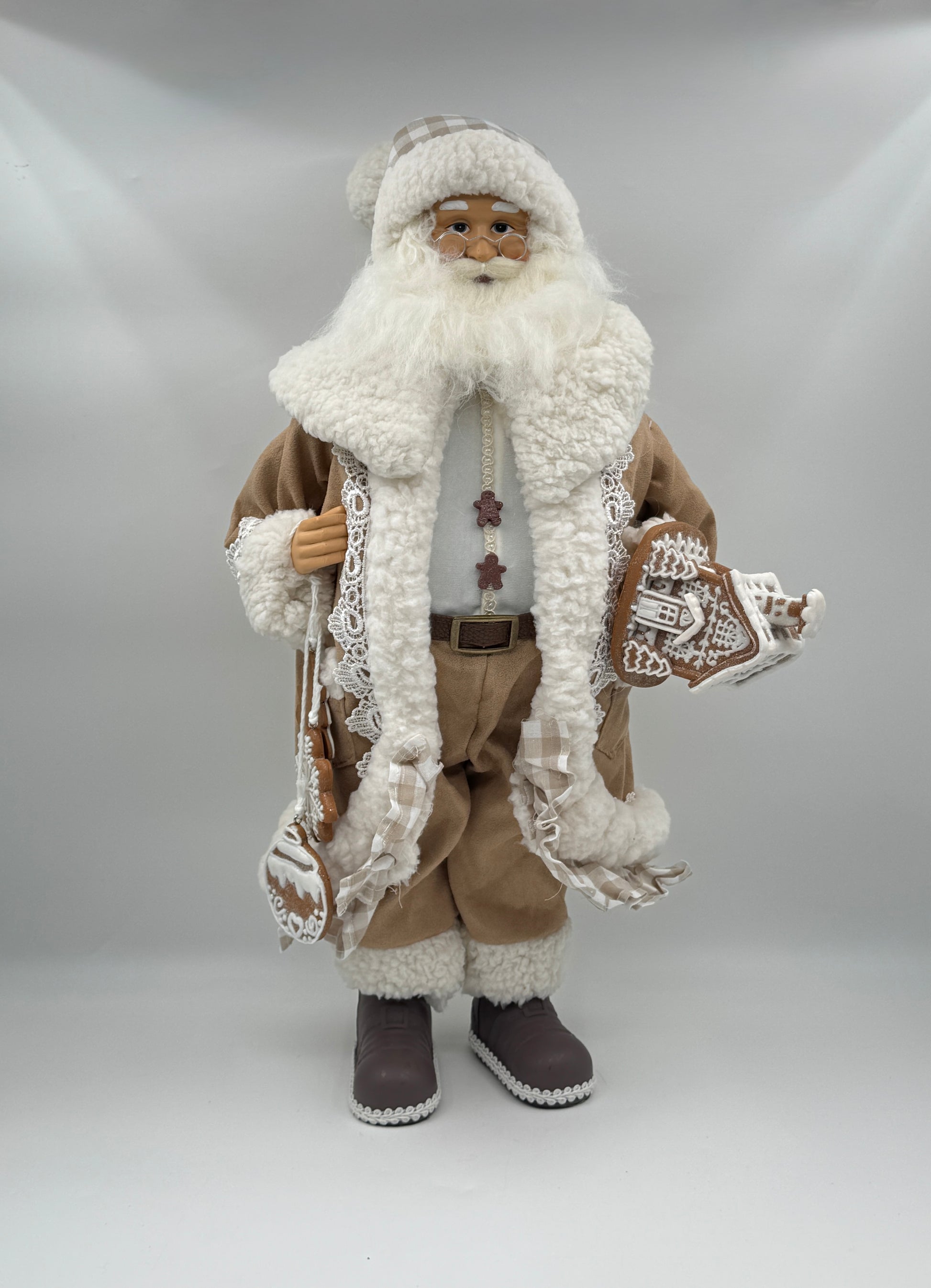 A cozy Santa dressed in warm beige and cream tones with lace trim and a gingham hat, holding a gingerbread house and cookies for a sweet holiday touch.