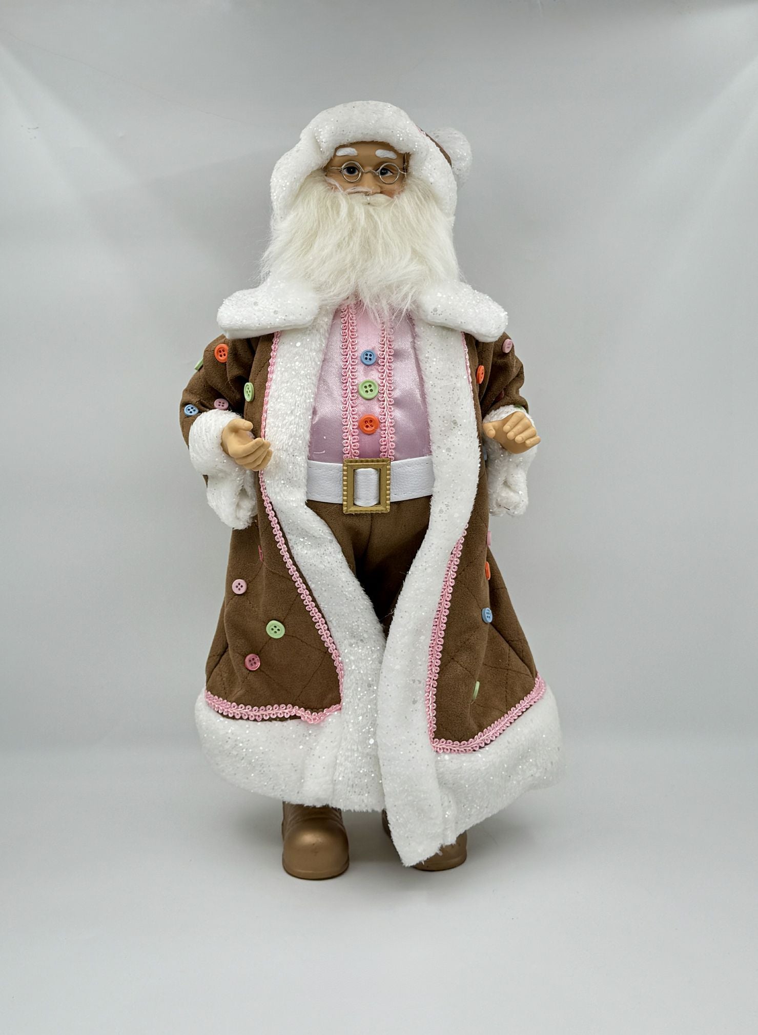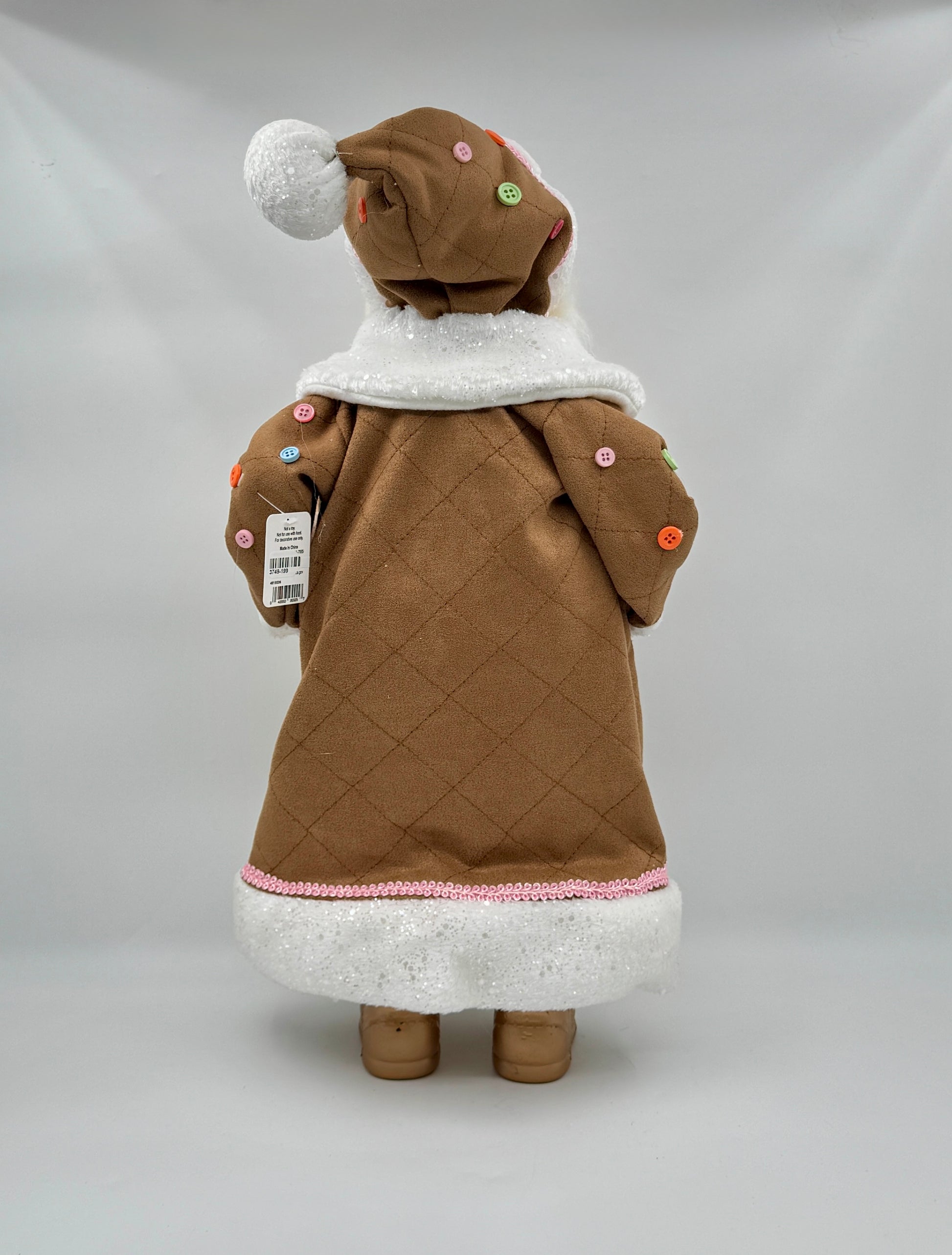A whimsical Raz Imports Santa dressed in a gingerbread-inspired brown coat trimmed with glittery white faux fur and colorful candy-like buttons for a sweet festive charm.