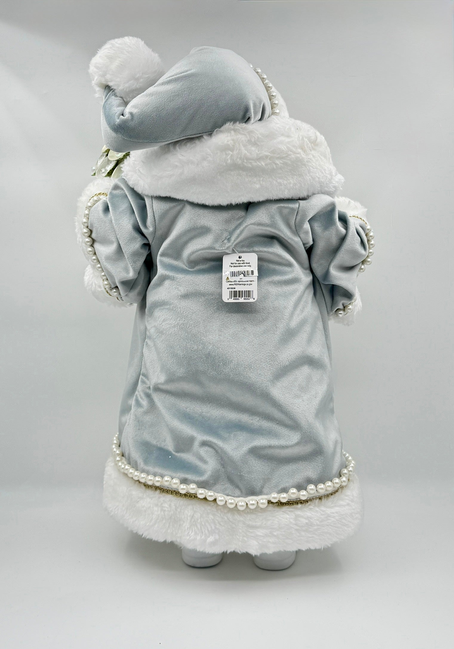 A serene coastal-inspired Santa dressed in pale blue velvet with white faux fur trim, holding a pearl-adorned tree for an elegant holiday touch.