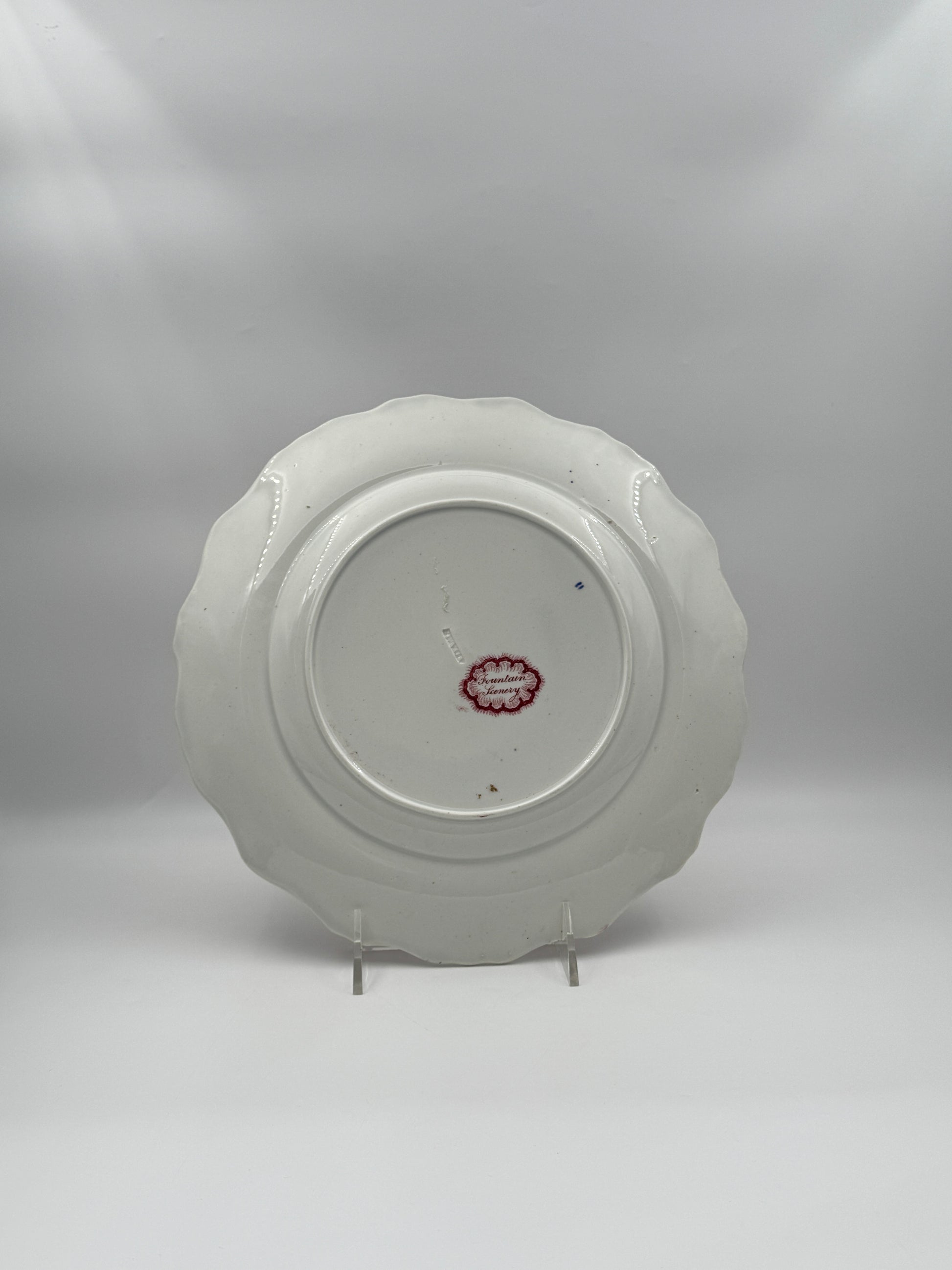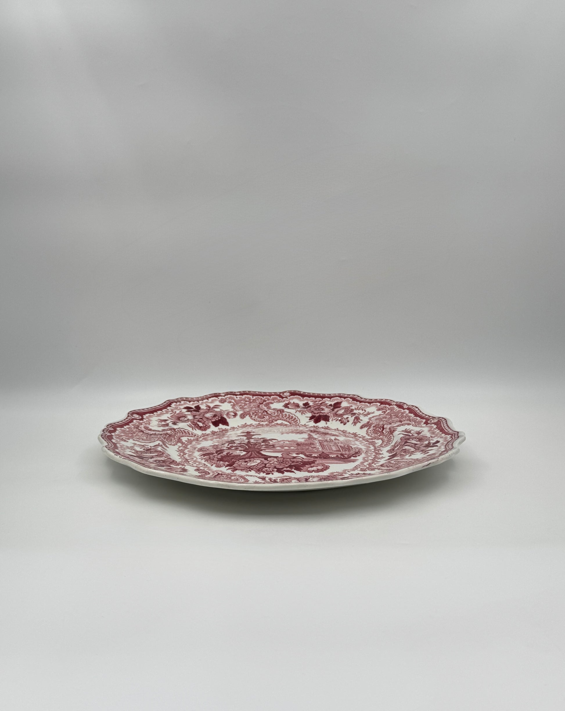 Antique English transferware plate by Adams, c.1850. Features scalloped edges and a rich red "Fountain Scenery" design with floral and architectural motifs.