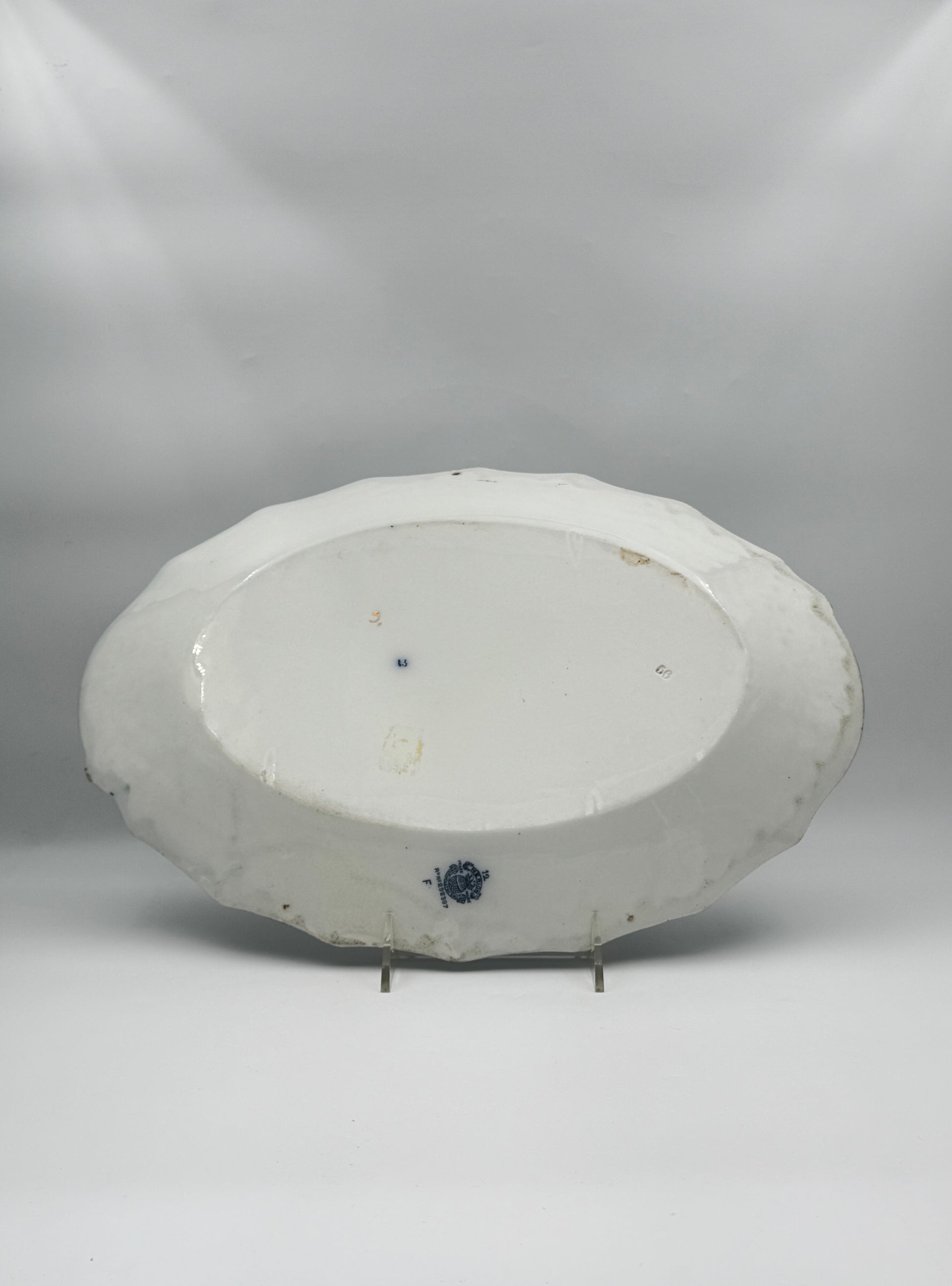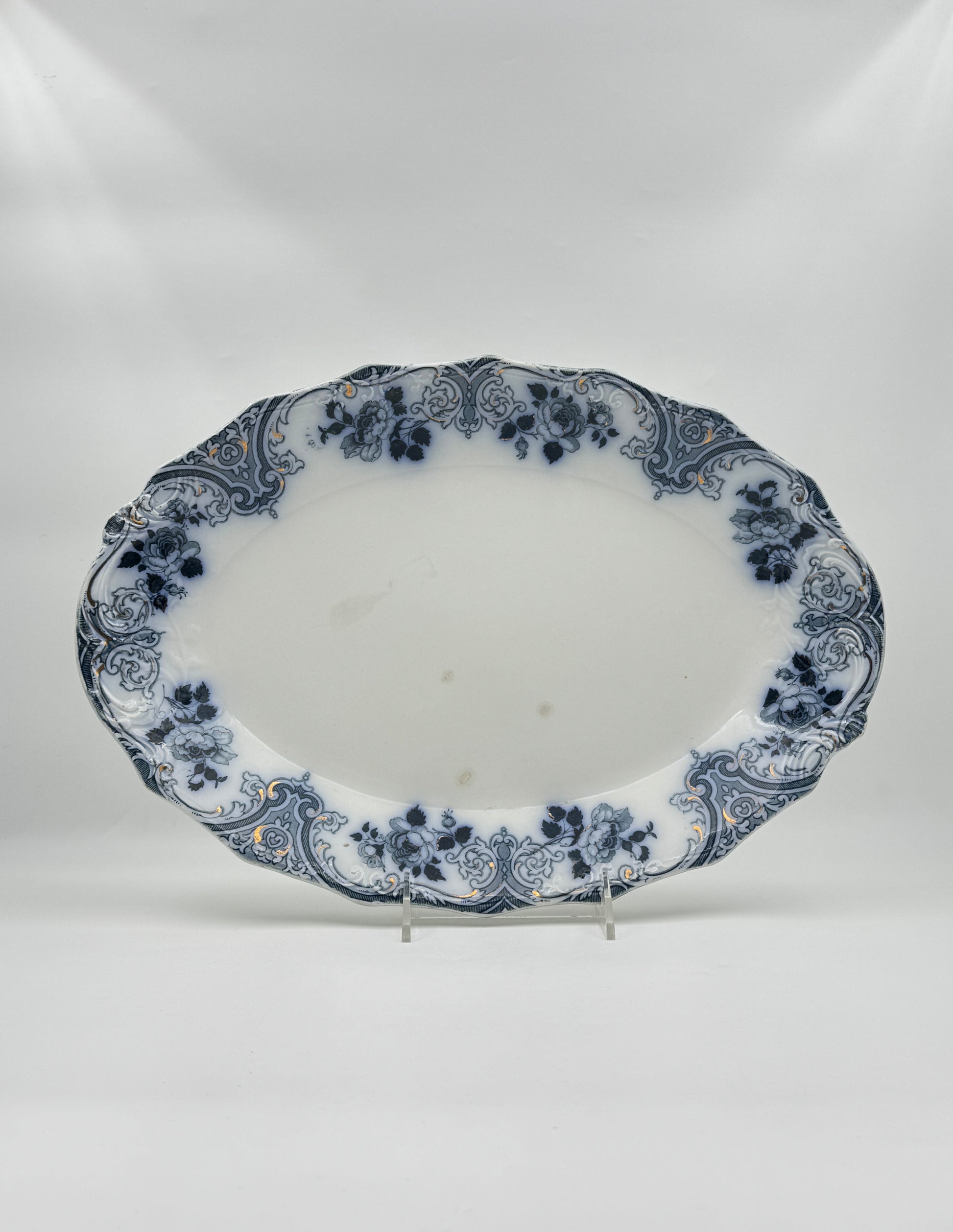 Elegant 19th-century English ironstone platter in the “Albion” pattern with blue floral scrolls, gilt accents, and a scalloped Victorian oval form.