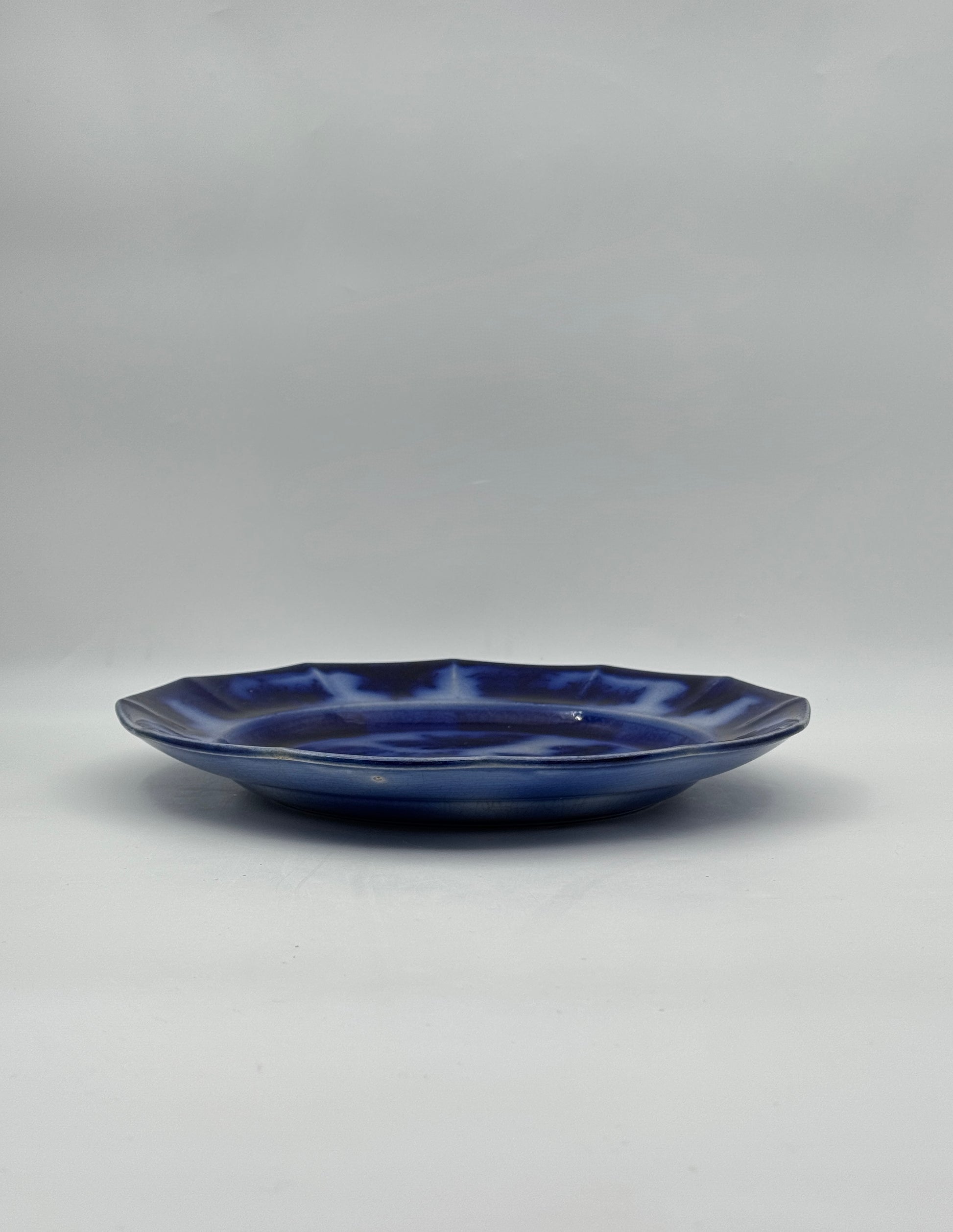 Charming 19th-century English Flow Blue “Chapoo” plate featuring a cobalt chinoiserie landscape with blurred edges and a scalloped rim.