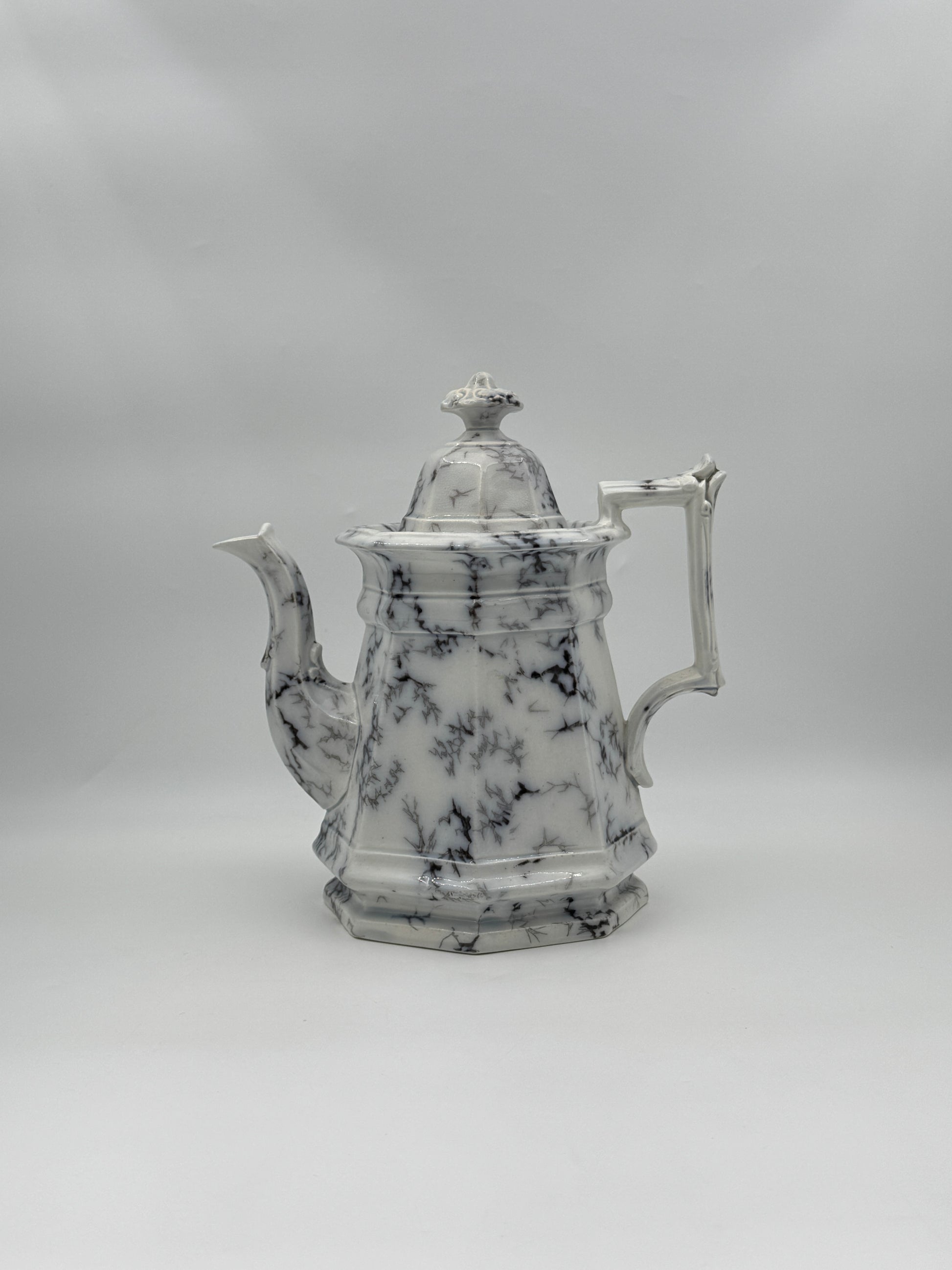 Elegant 19th-century English ironstone coffee pot by Pinder, featuring a mochaware marbled pattern.