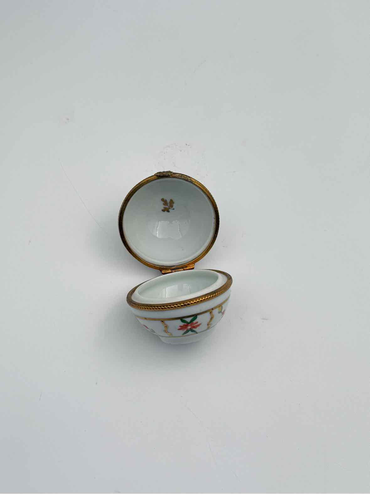 Limoges box, handpainted round ball shape, with gold and orange flowers, measures 2" tall, pre-owned in good condition