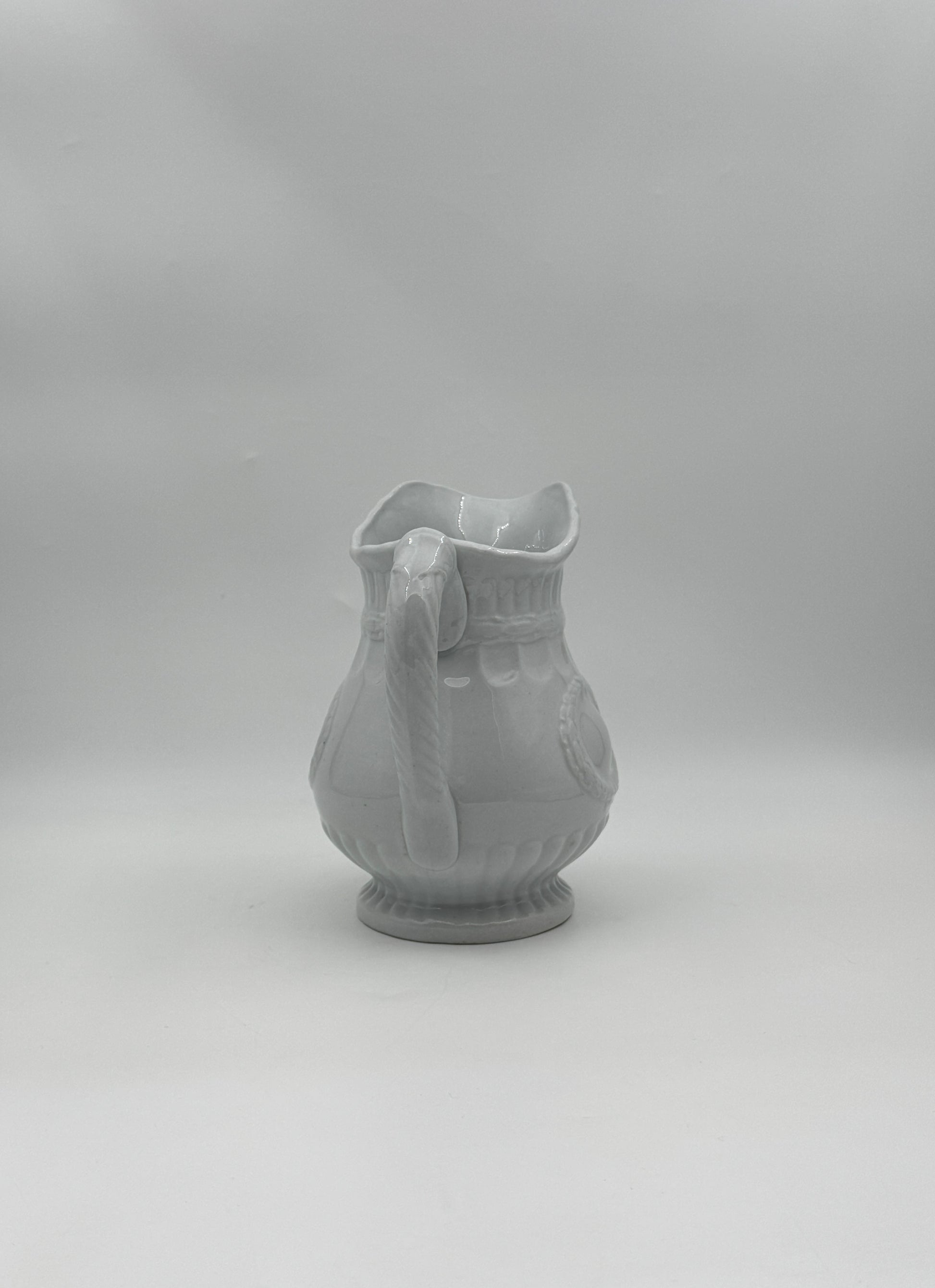 Charming 19th-century white ironstone creamer featuring an embossed wreath and star motif. Elegant molded details with a twisted handle and scalloped rim.