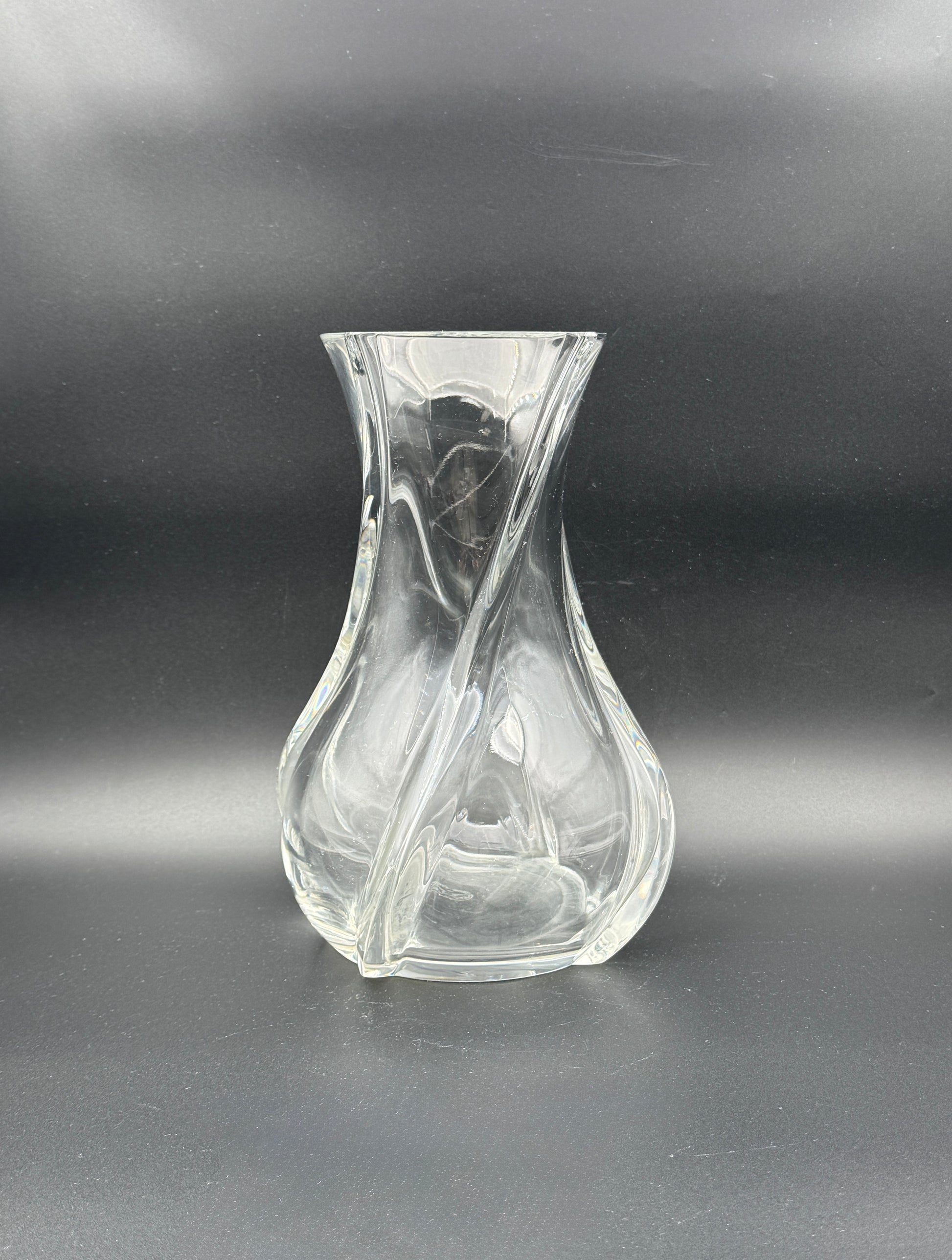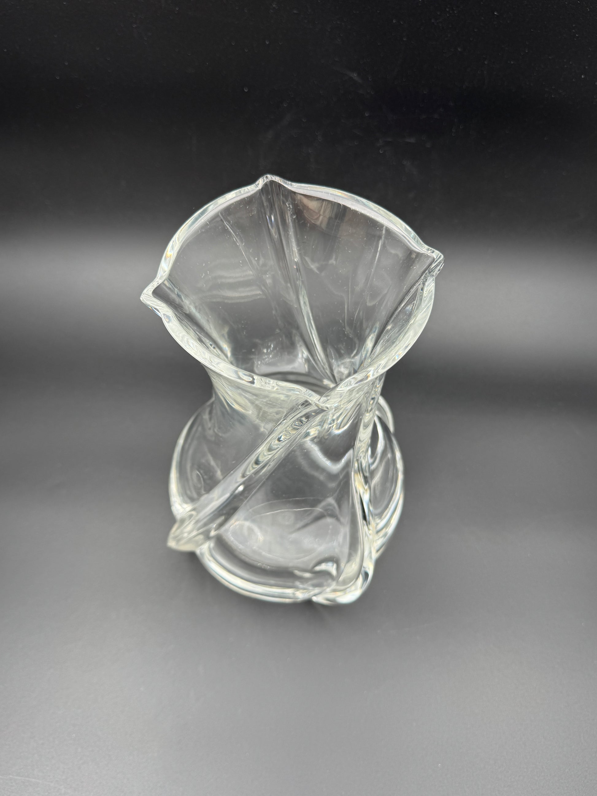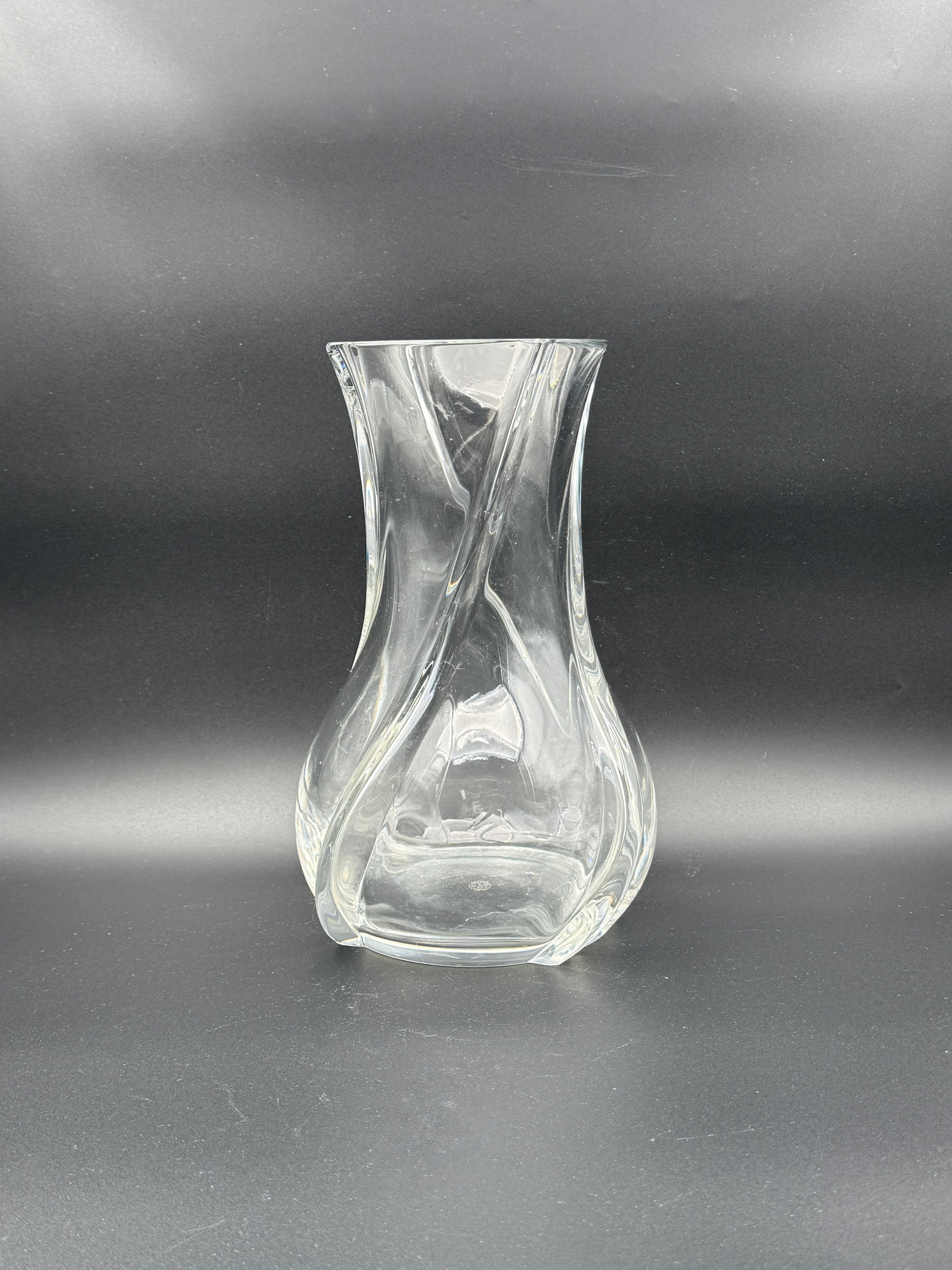 Elegant French Baccarat "Serpentin" crystal vase with twisted swirl design, showcasing timeless craftsmanship and clarity.