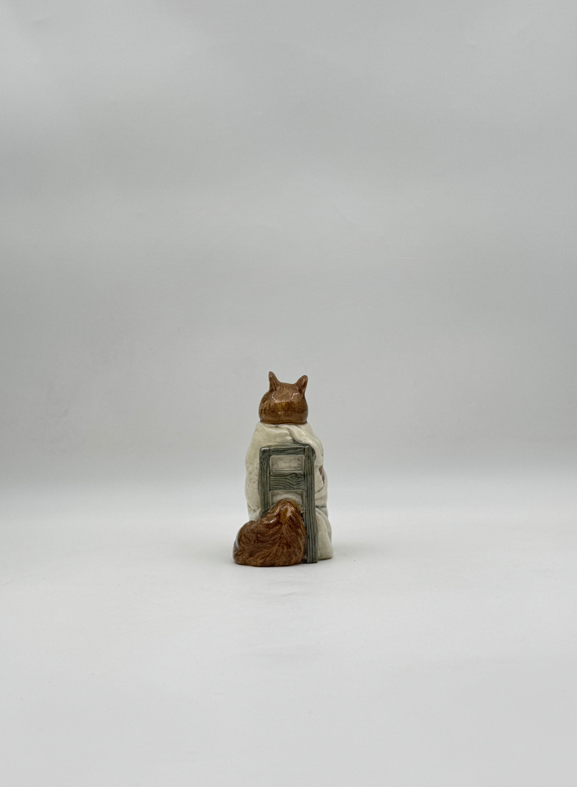 A charming porcelain figure of Chippy Hackee wrapped in a shawl, seated beside a small barrel, capturing the gentle woodland spirit of Beatrix Potter’s tales.