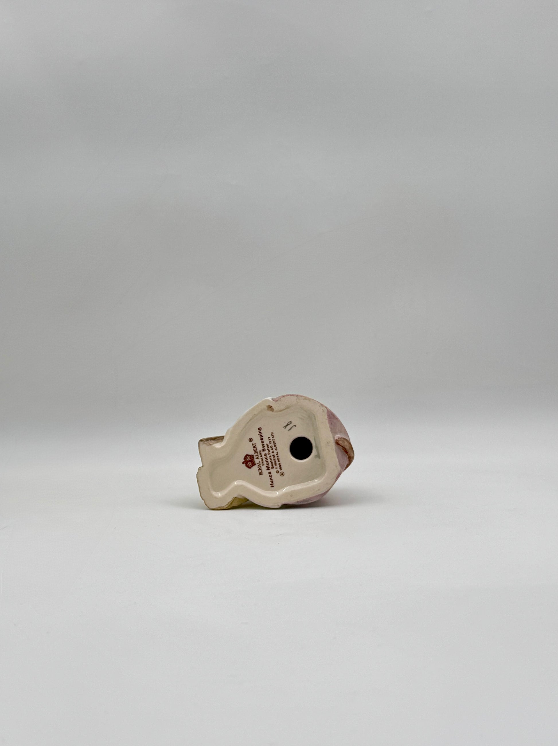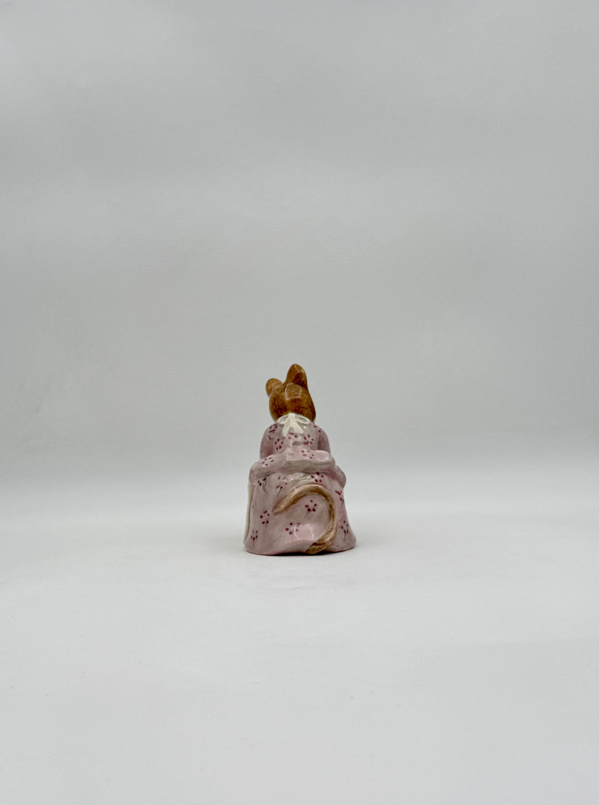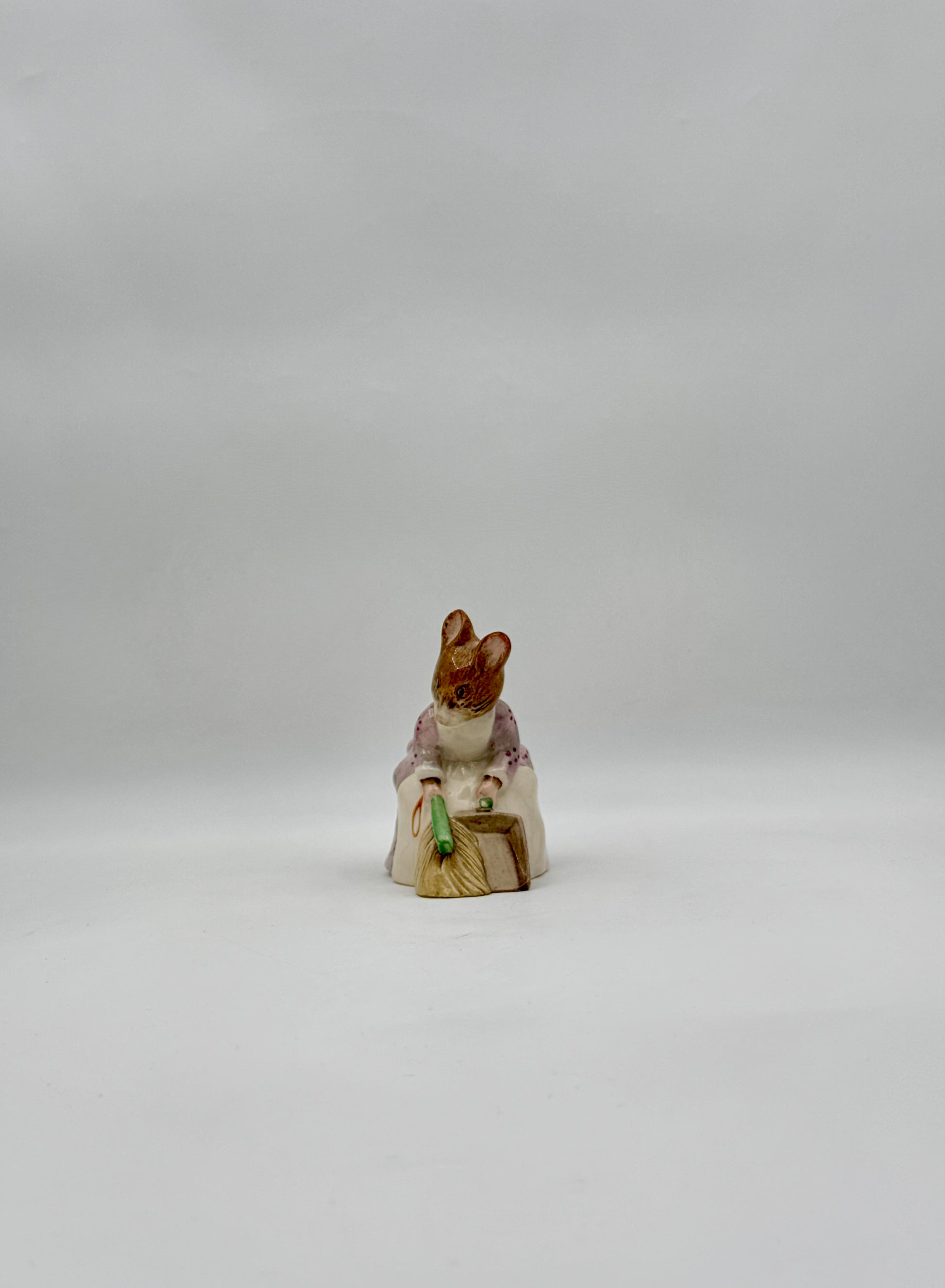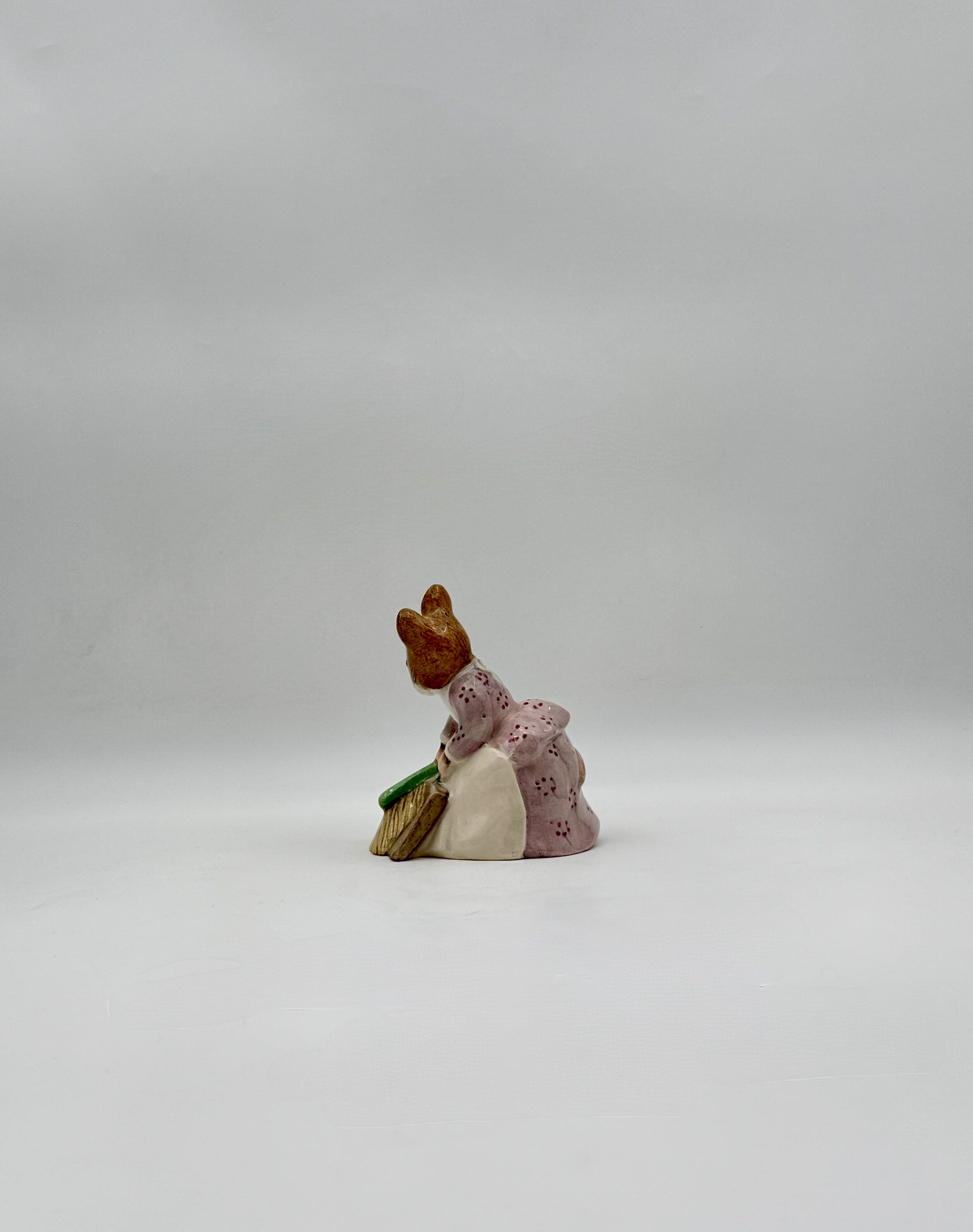 A delightful porcelain figure of Hunca Munca in her pink dress, captured mid-sweep with charming detail and storybook personality.