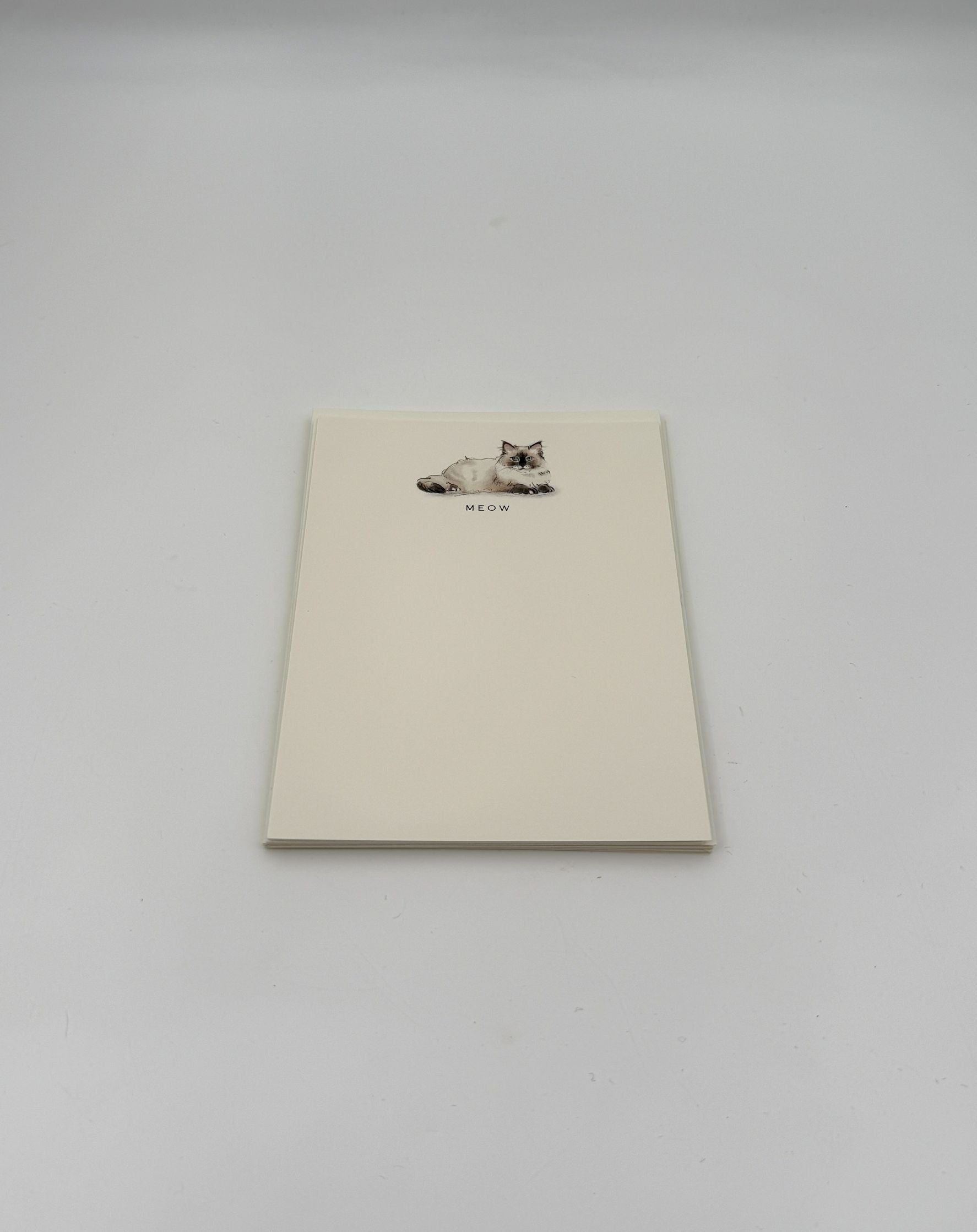 A charming set of flat notecards featuring a reclining blue-eyed cat with the caption “MEOW,” perfect for everyday notes, gifts, or correspondence.