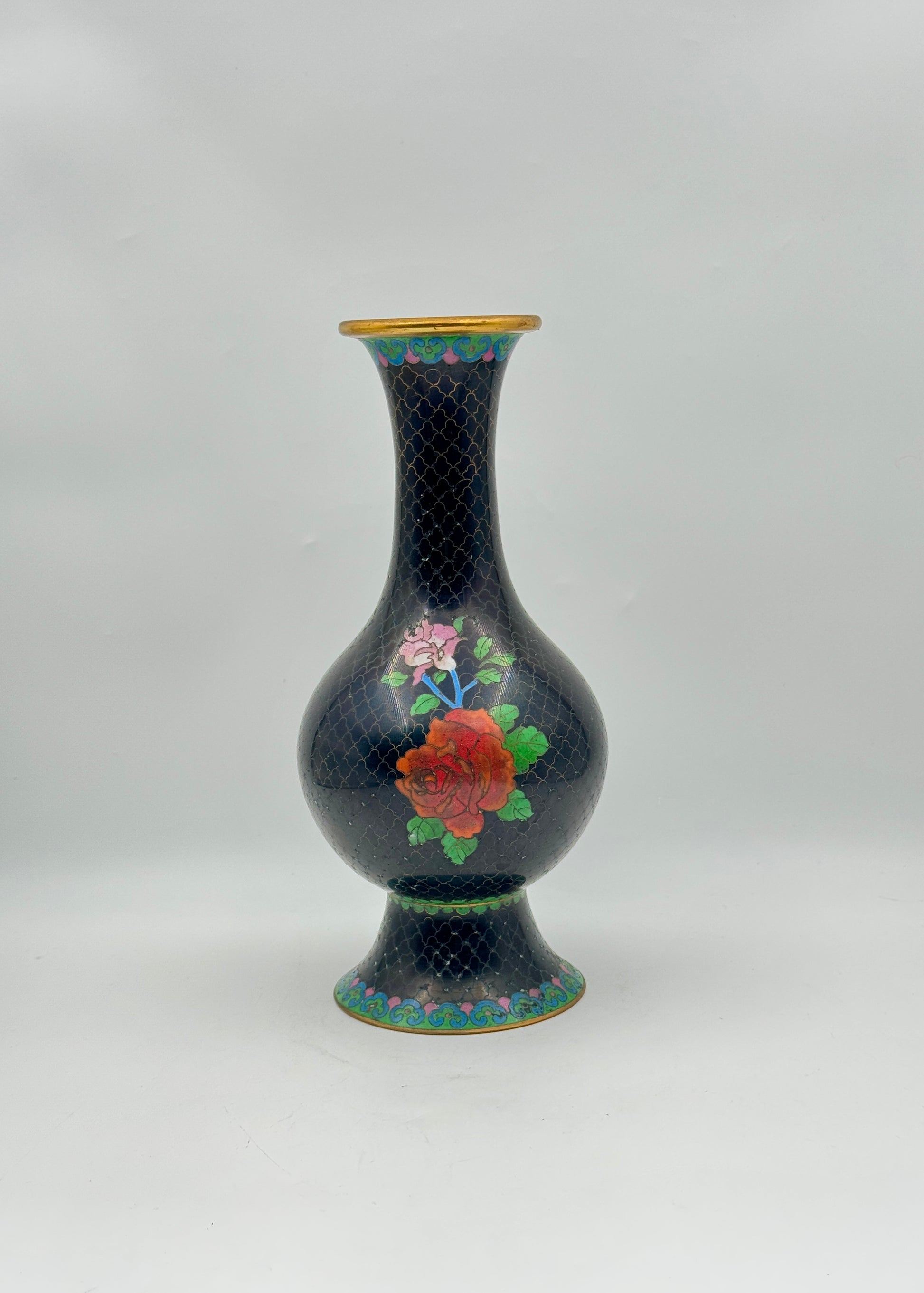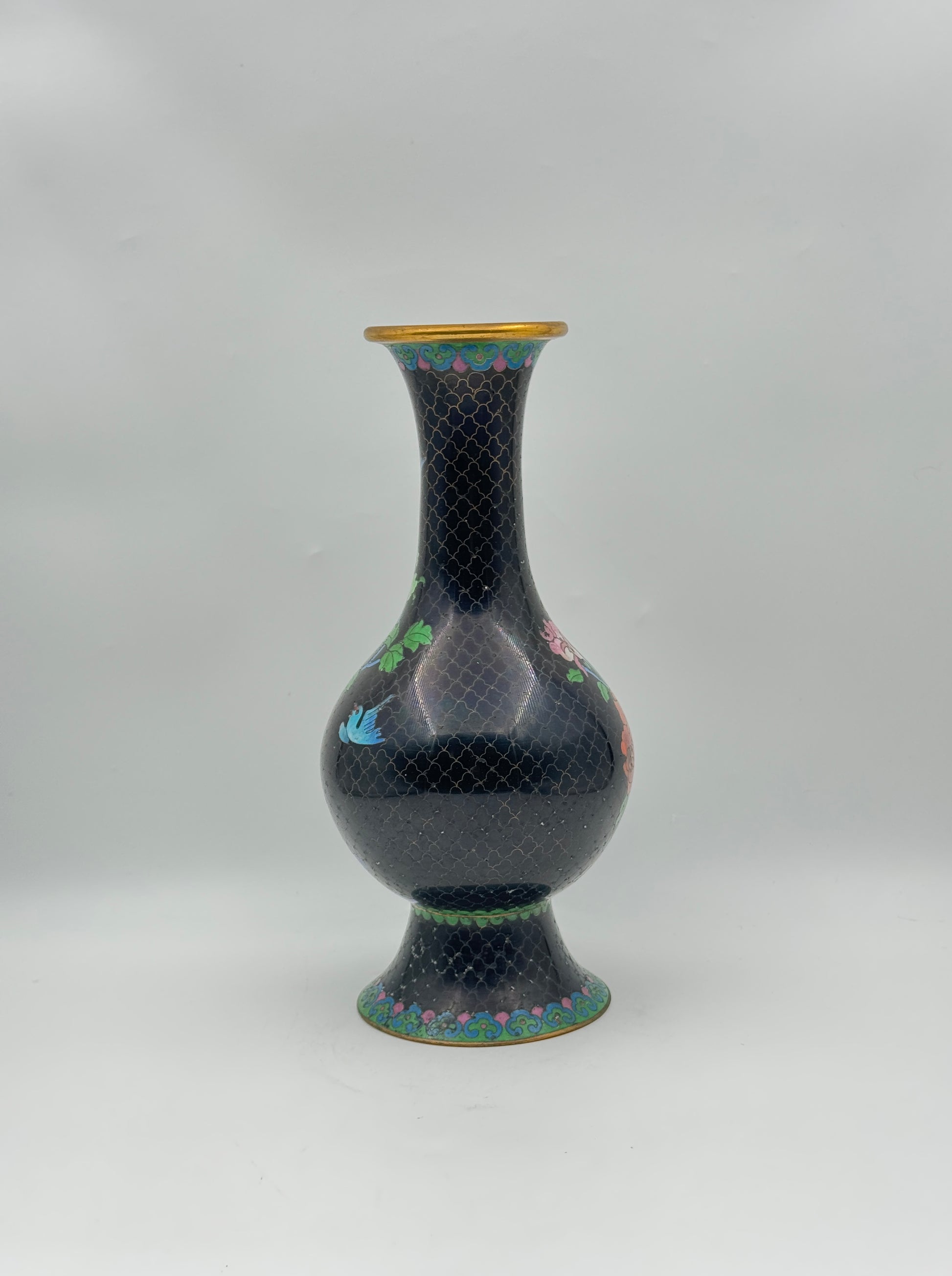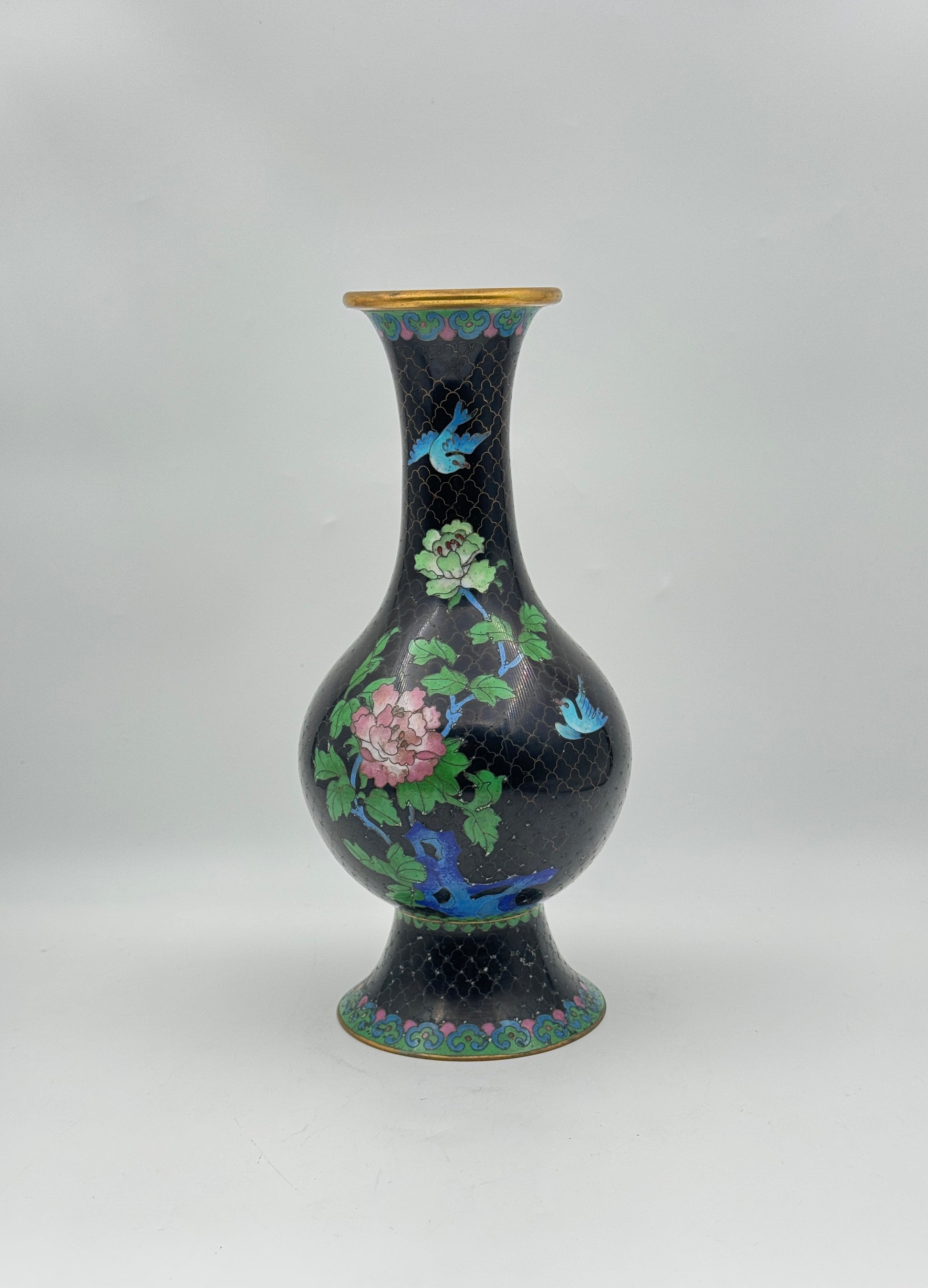Chinese Cloisonné Vase – Black Enamel with Floral & Bird Design, Gold Rim
