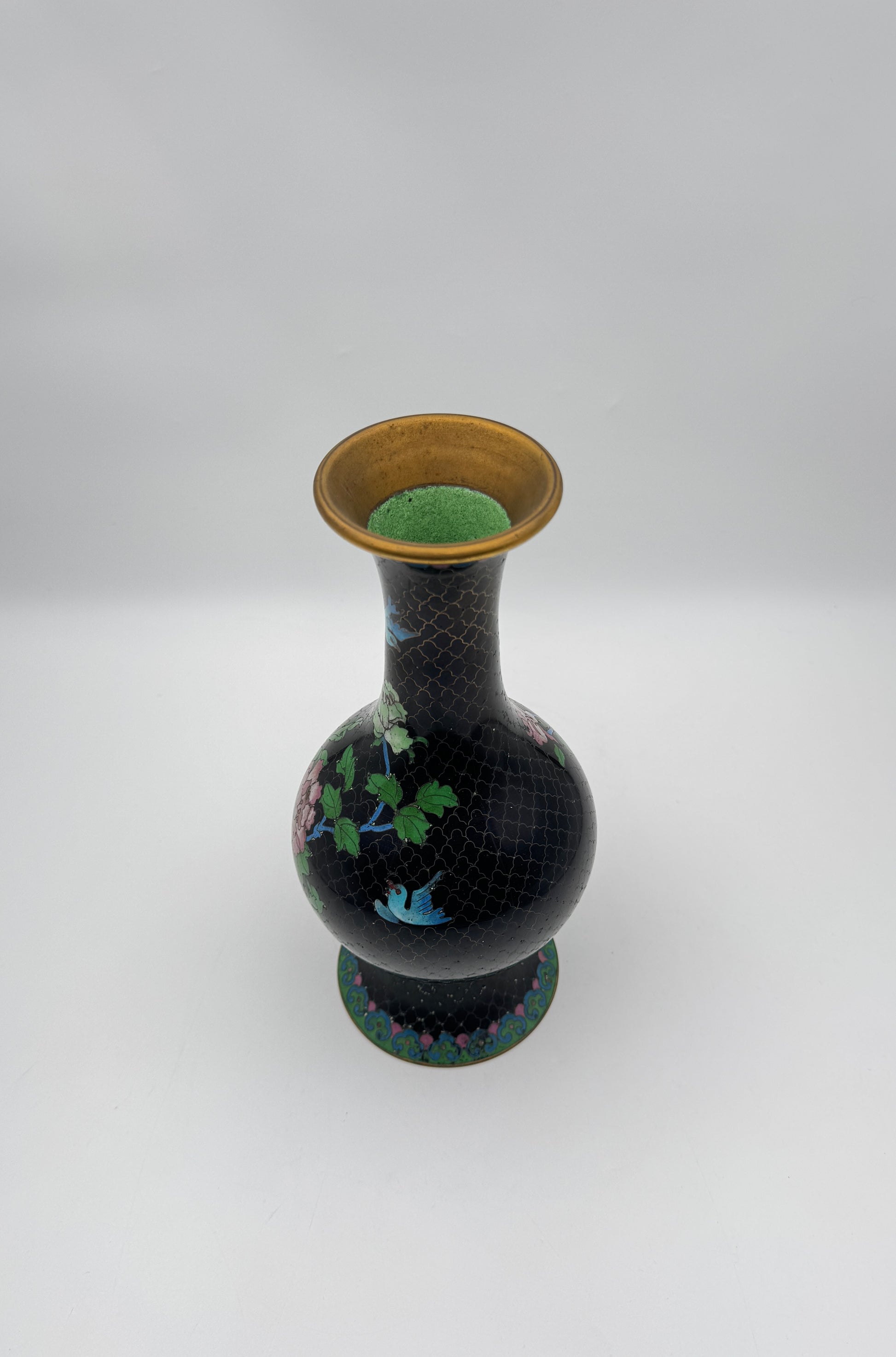 Striking cloisonné vase with a black enamel ground, decorated with colorful flowers, leafy branches, and bluebirds. Finished with a green enameled interior and base, and gold-tone rim and borders.