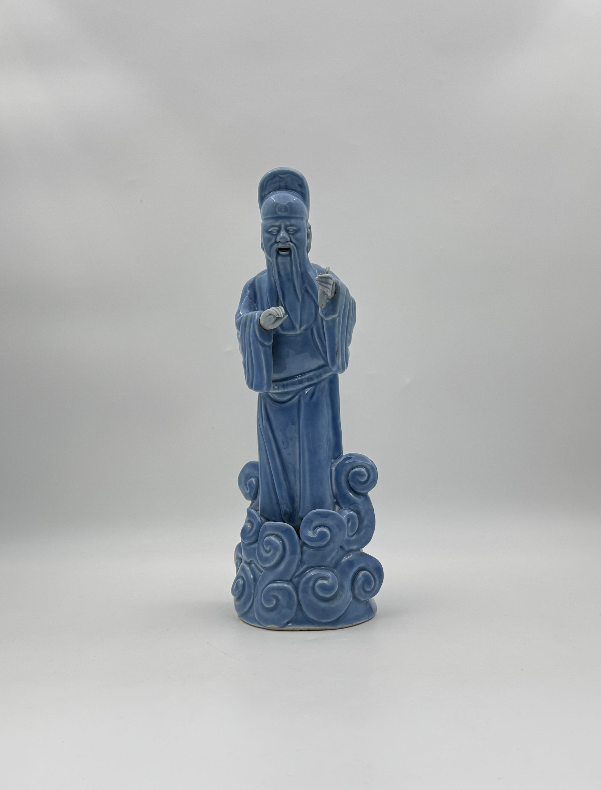 Elegant vintage Chinese porcelain figure in a soft blue glaze, depicting a robed man standing on swirling clouds.