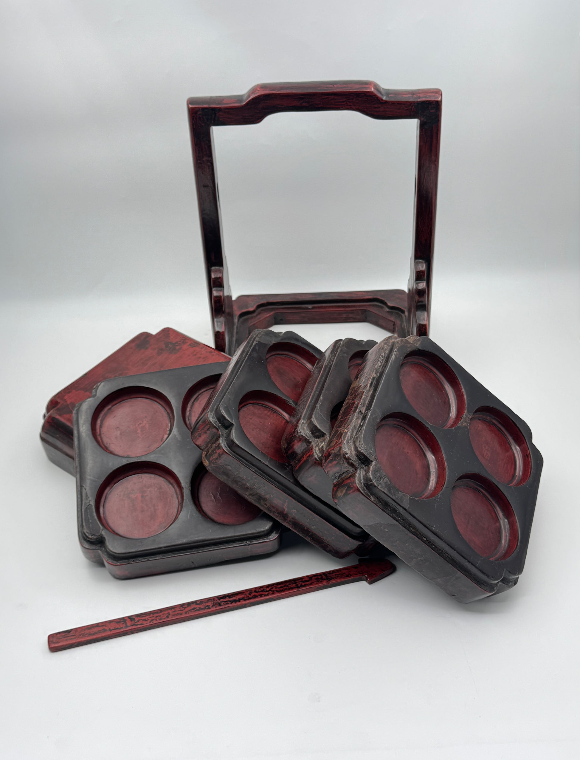 Antique Chinese red lacquered wooden tea box with four removable trays and carrying handle, showcasing aged patina and traditional joinery.