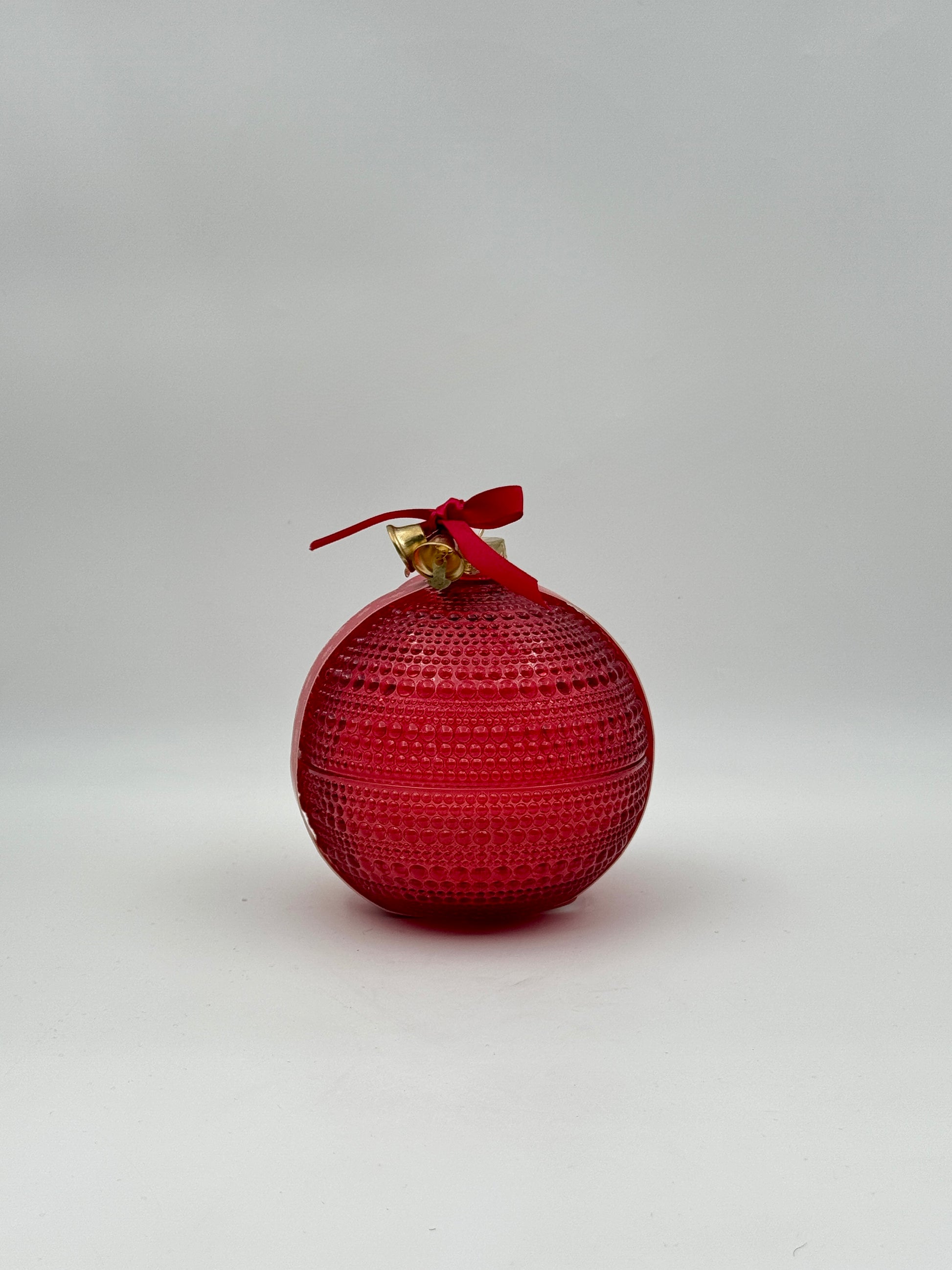 Festive round glass candle in a bright red hobnail ornament design. Lightly scented with wild berries, perfect for holiday décor or gifting.