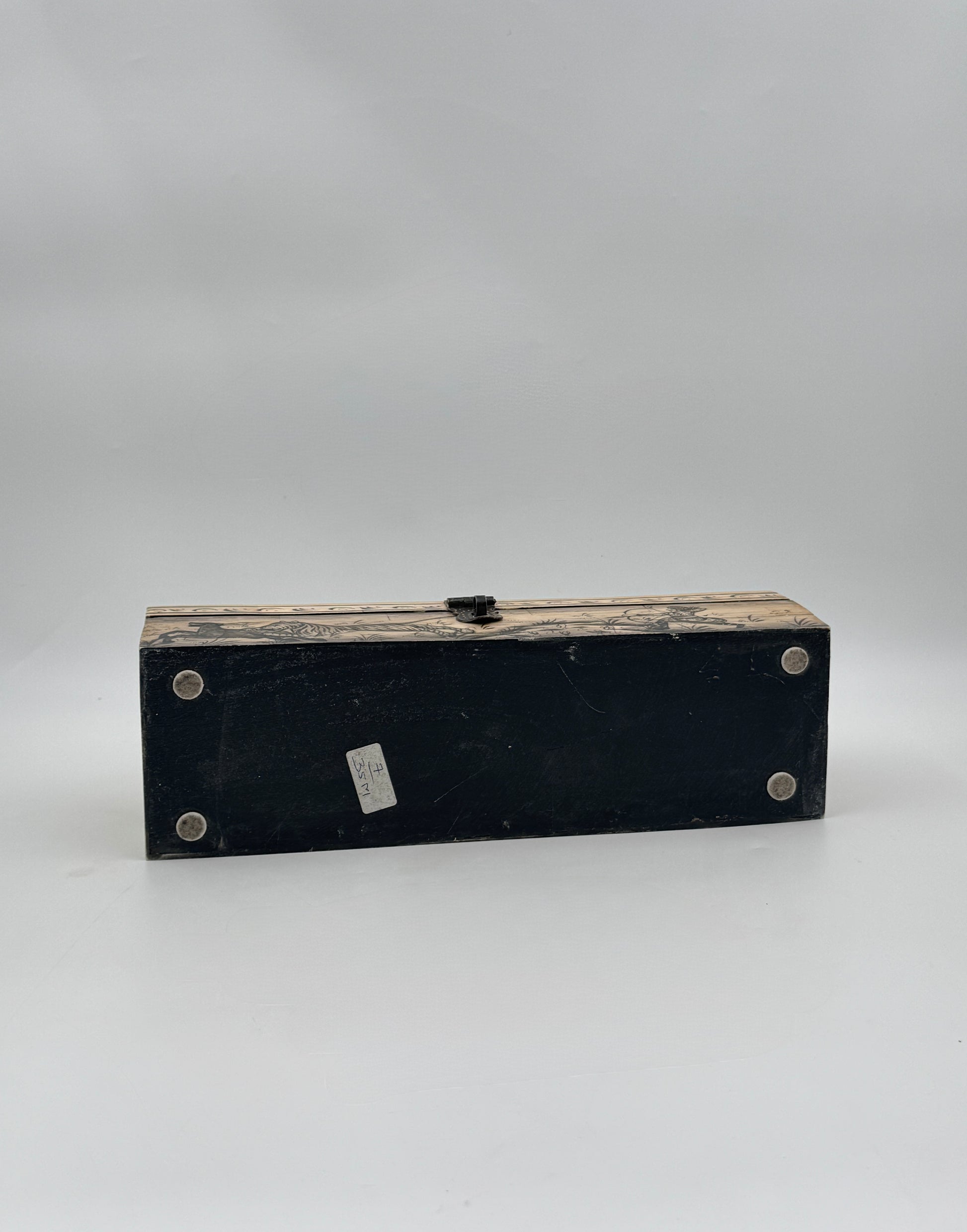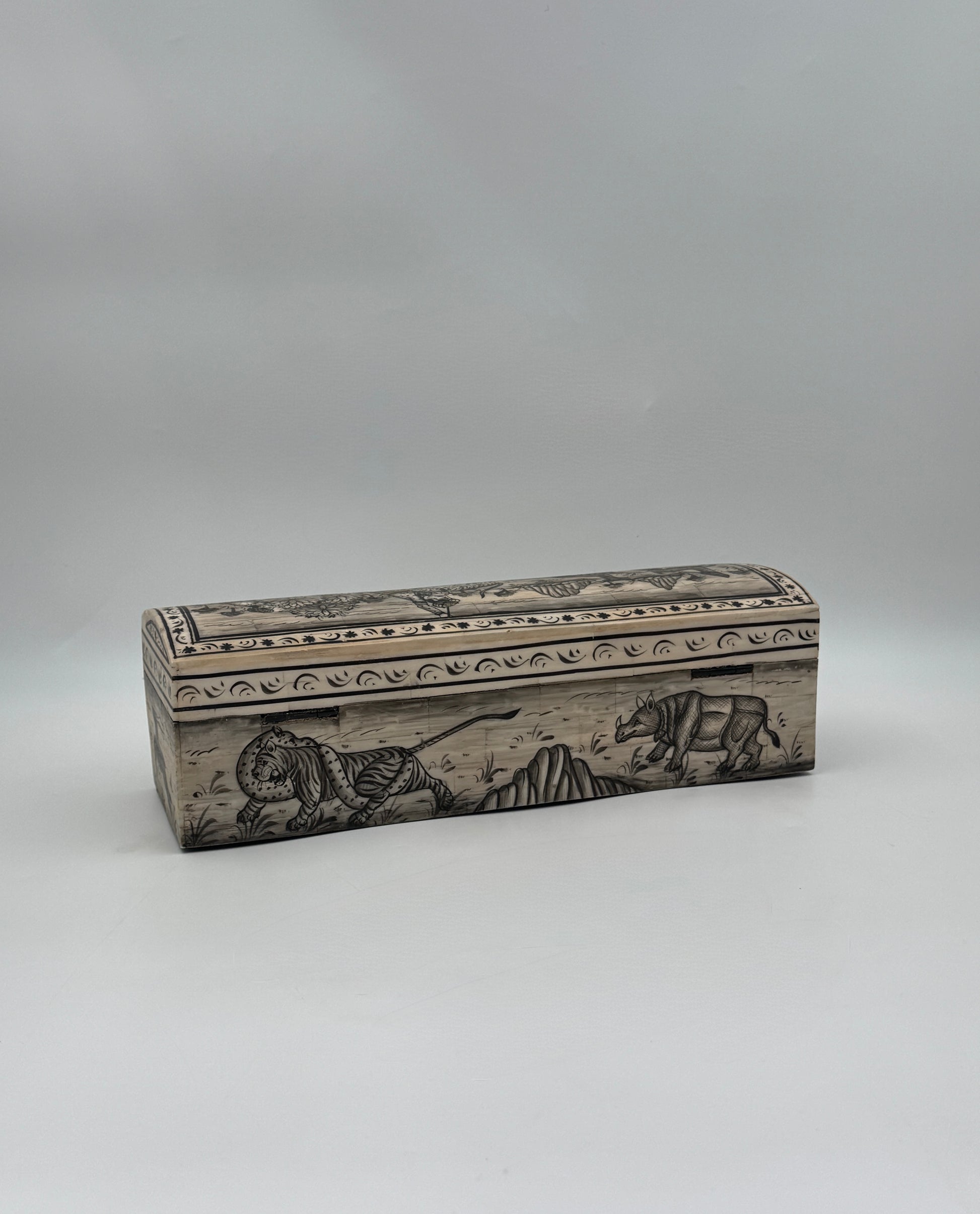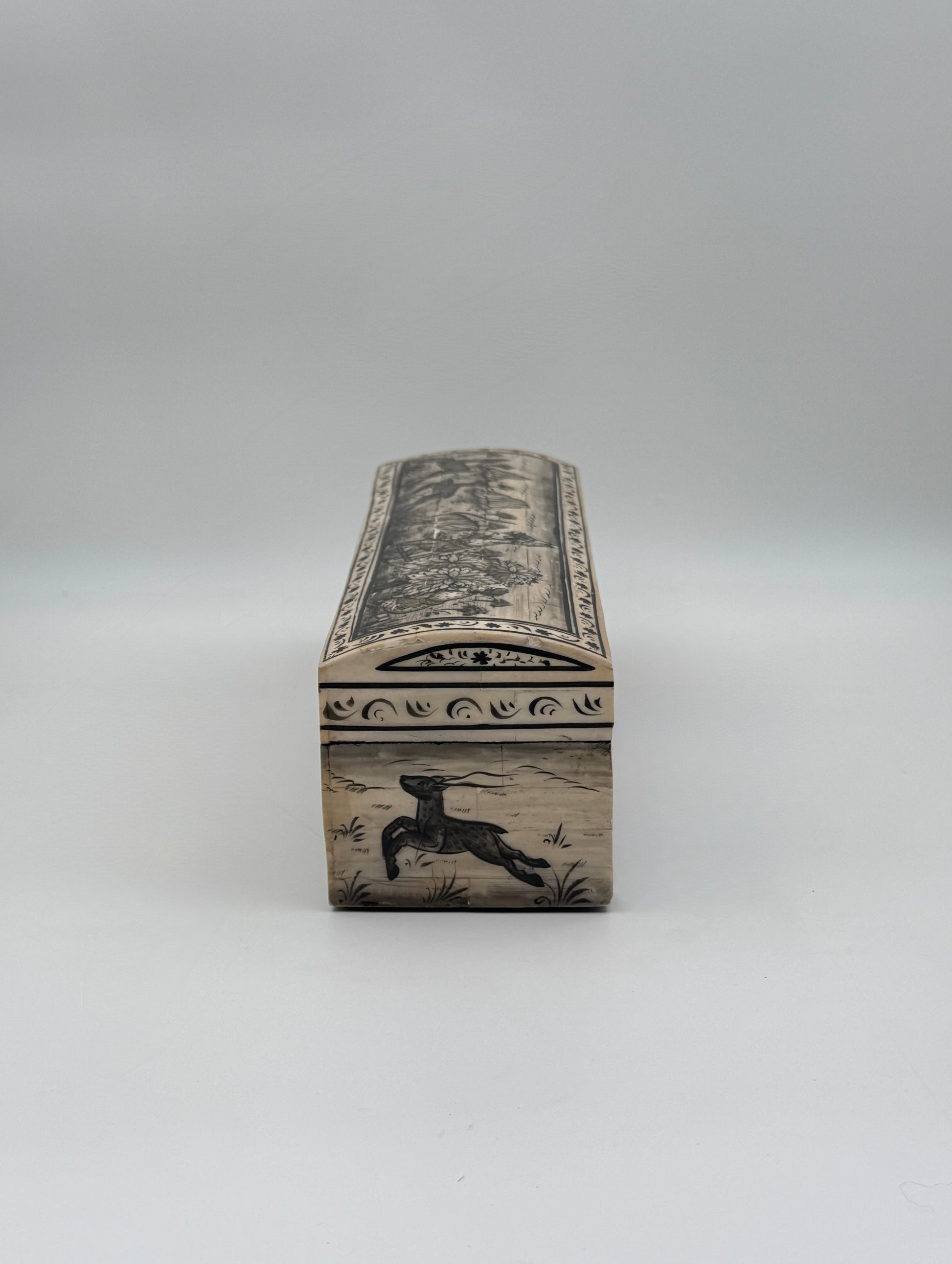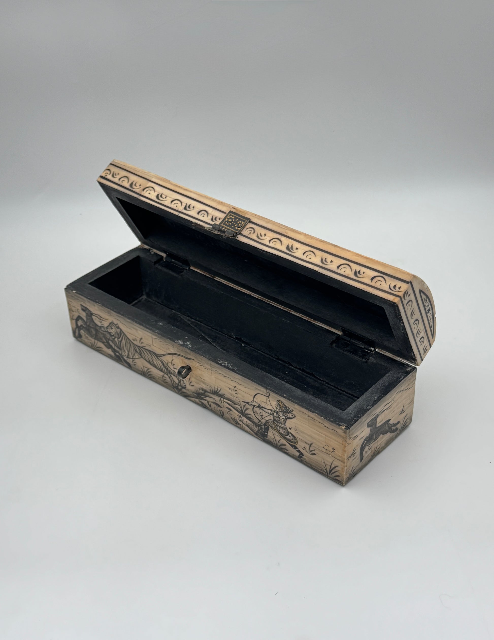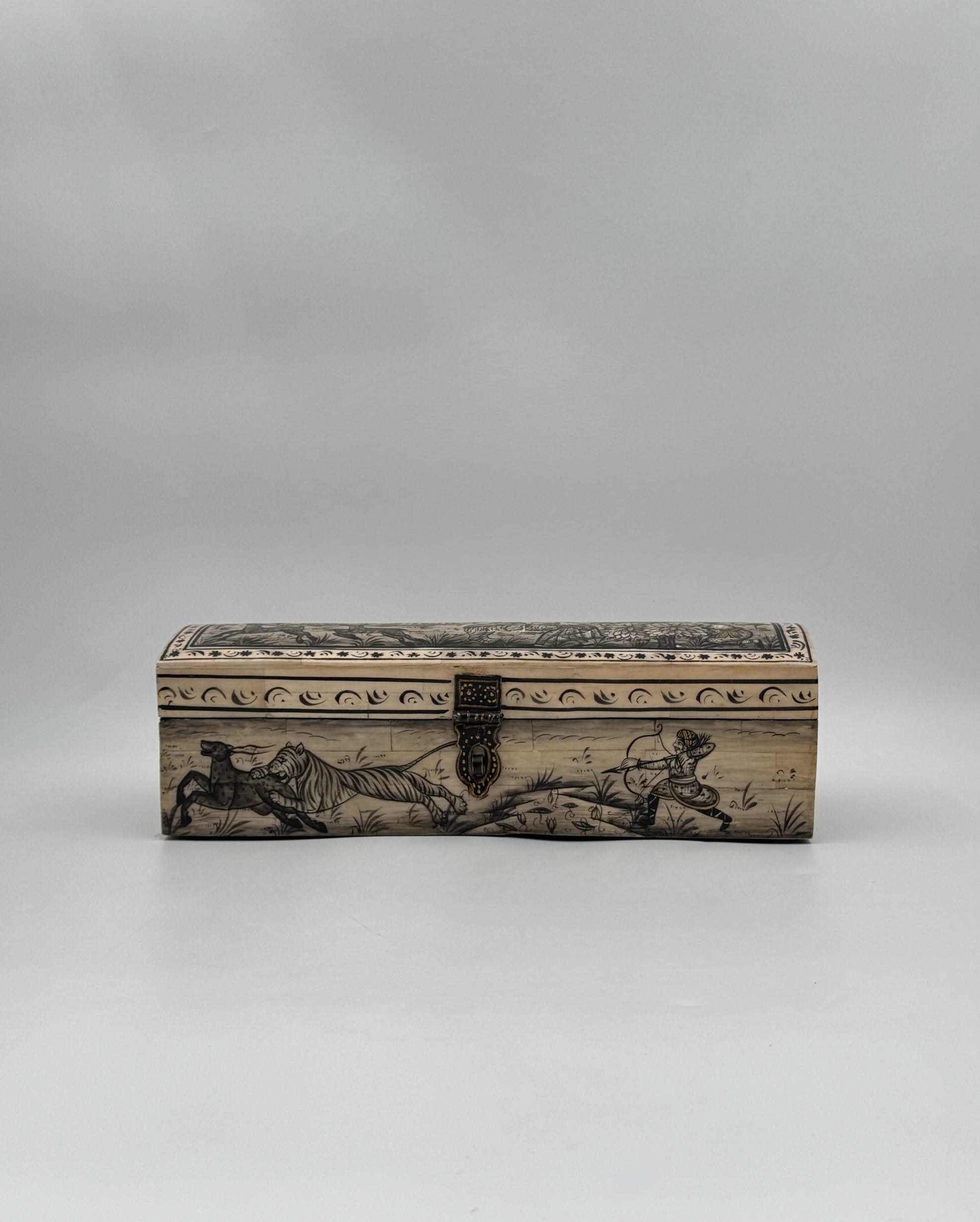 Hand-Painted Bone Pencil Box with Hunting Scene, India