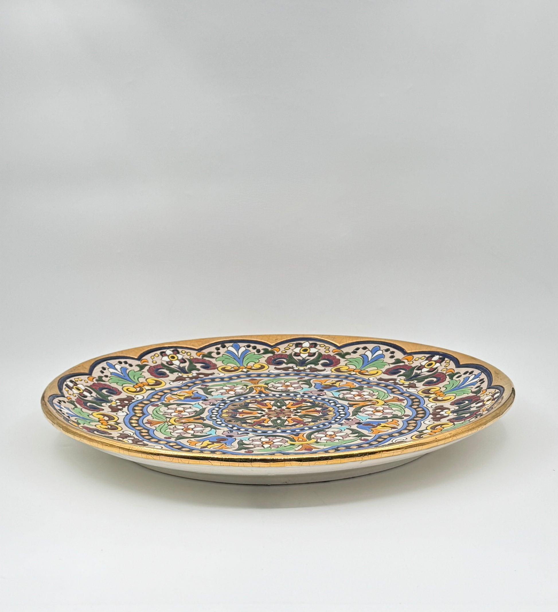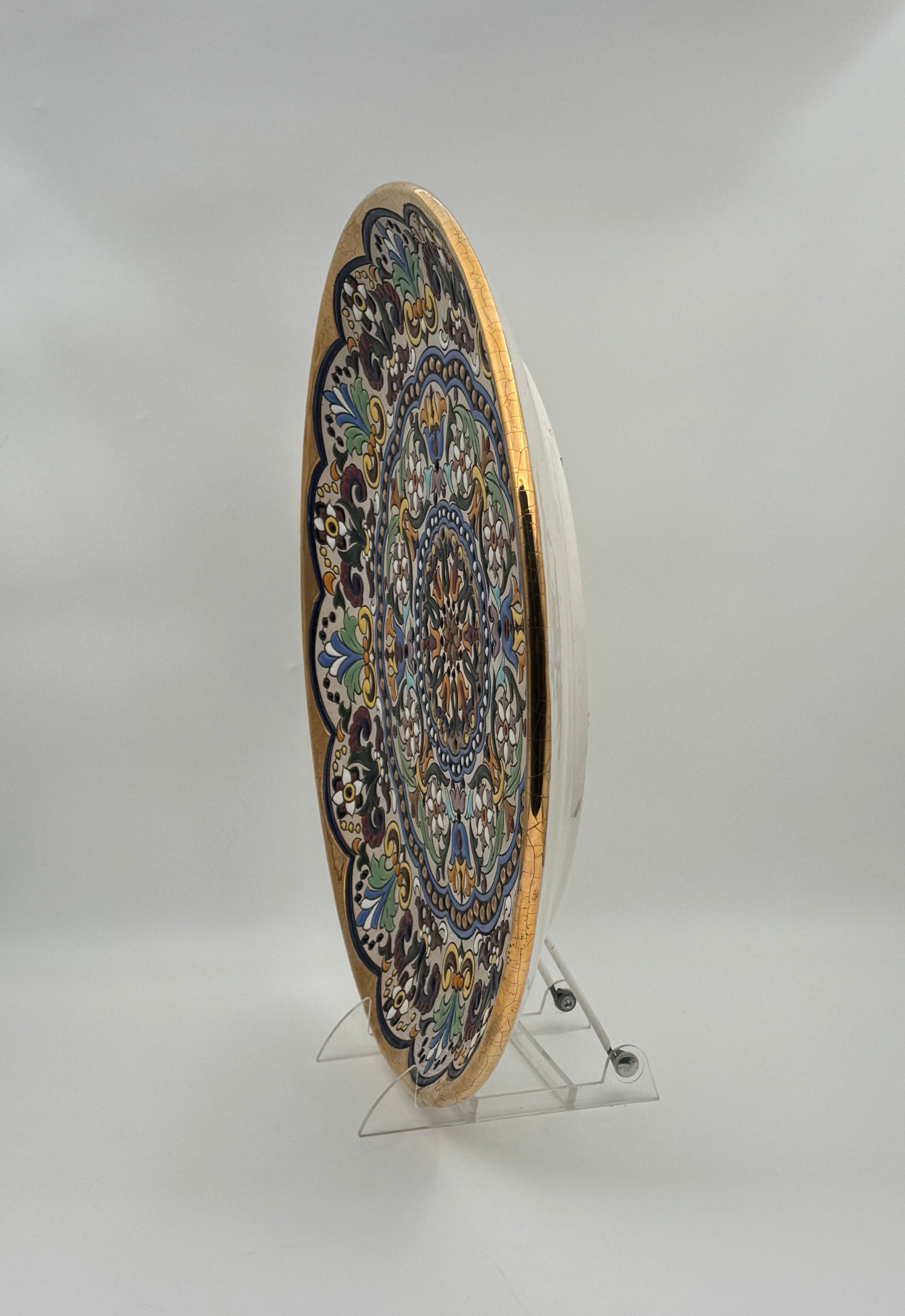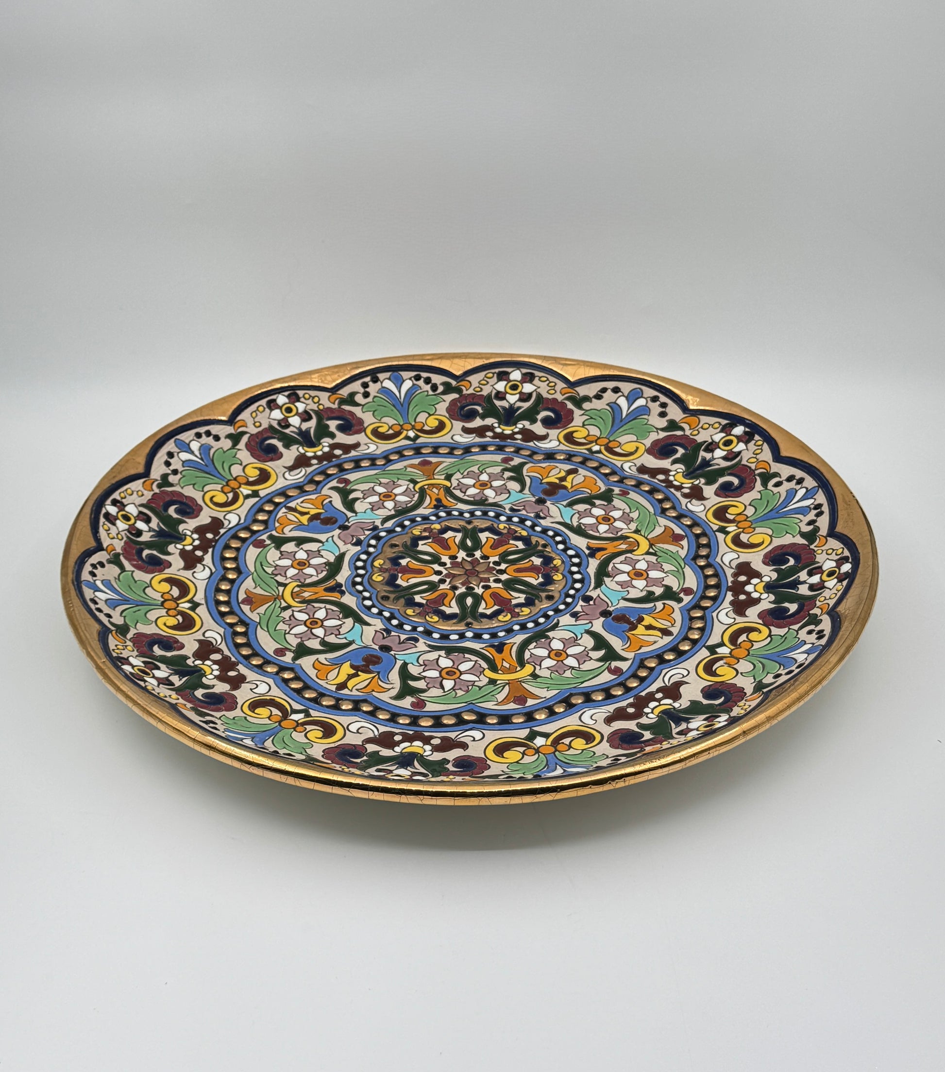 Vibrant hand-painted platter from Seville, Spain, featuring intricate floral patterns with gold trim. Prepped on the back for hanging.