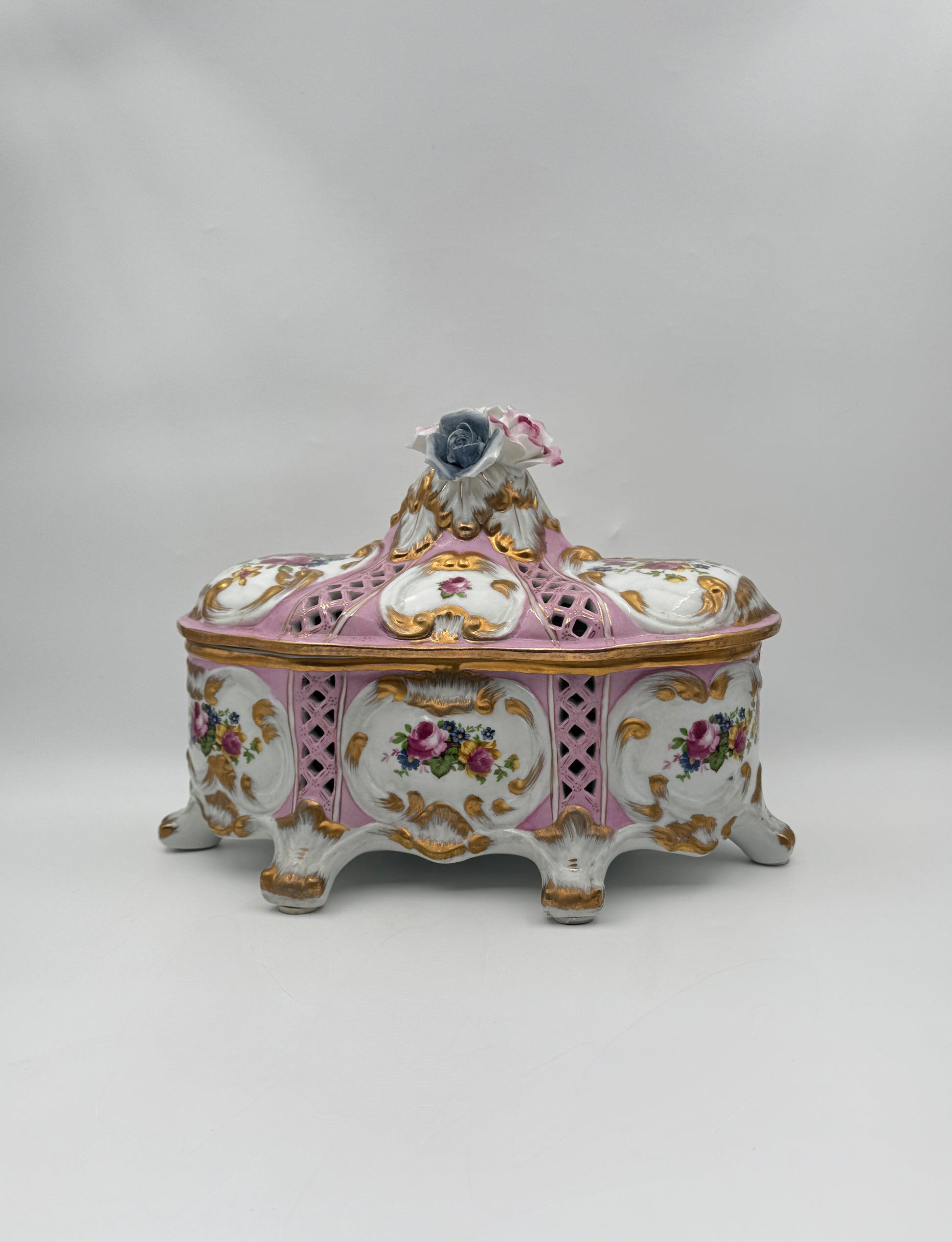 Elegant Italian porcelain centerpiece bowl with footed base and removable lid, decorated in hand-painted floral motifs with pink and gold trim.