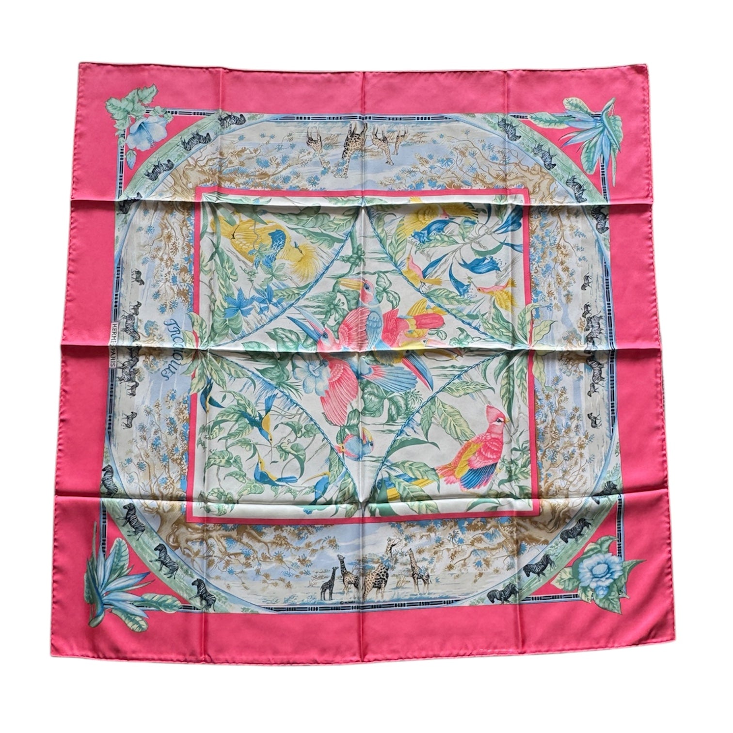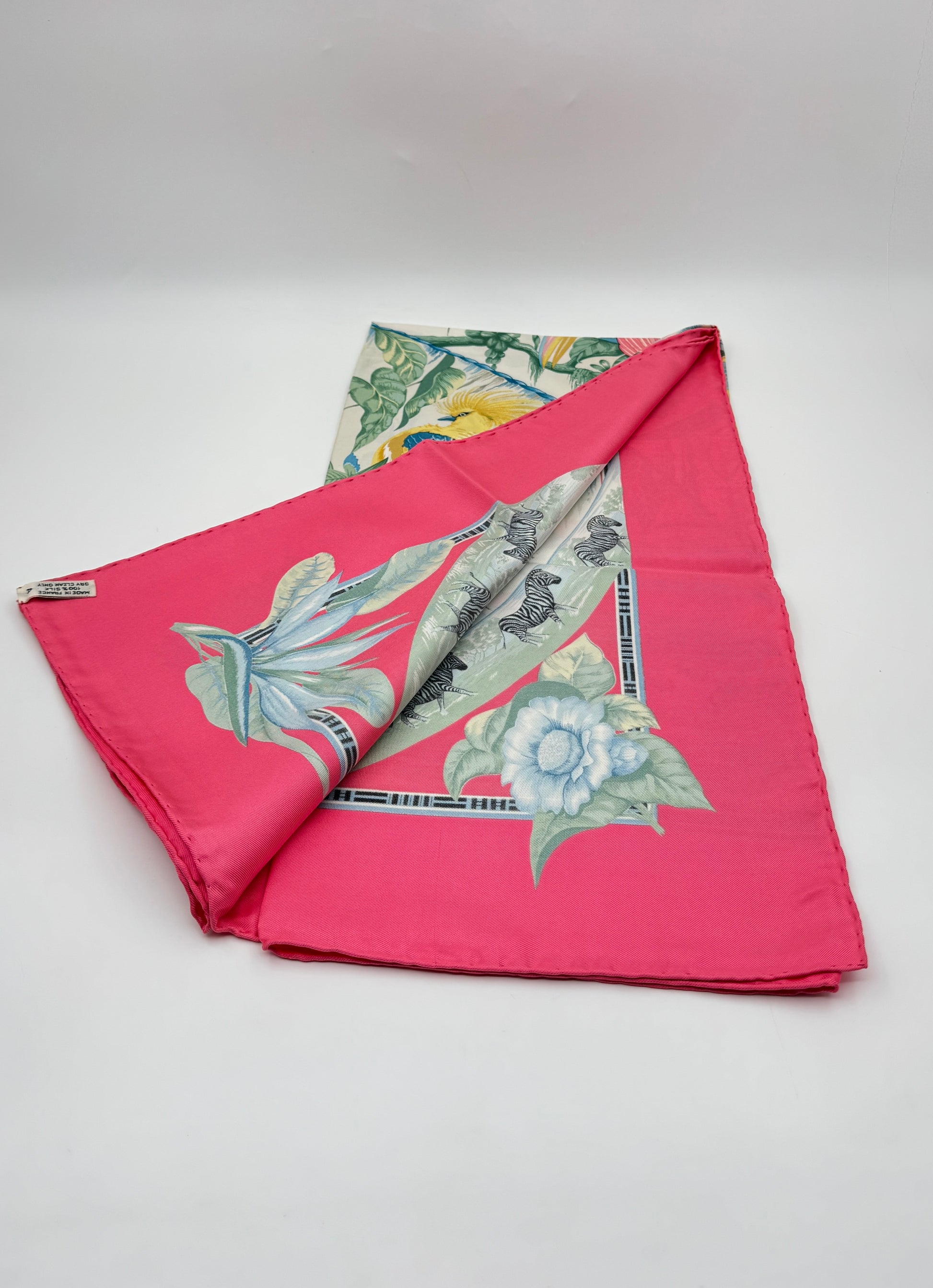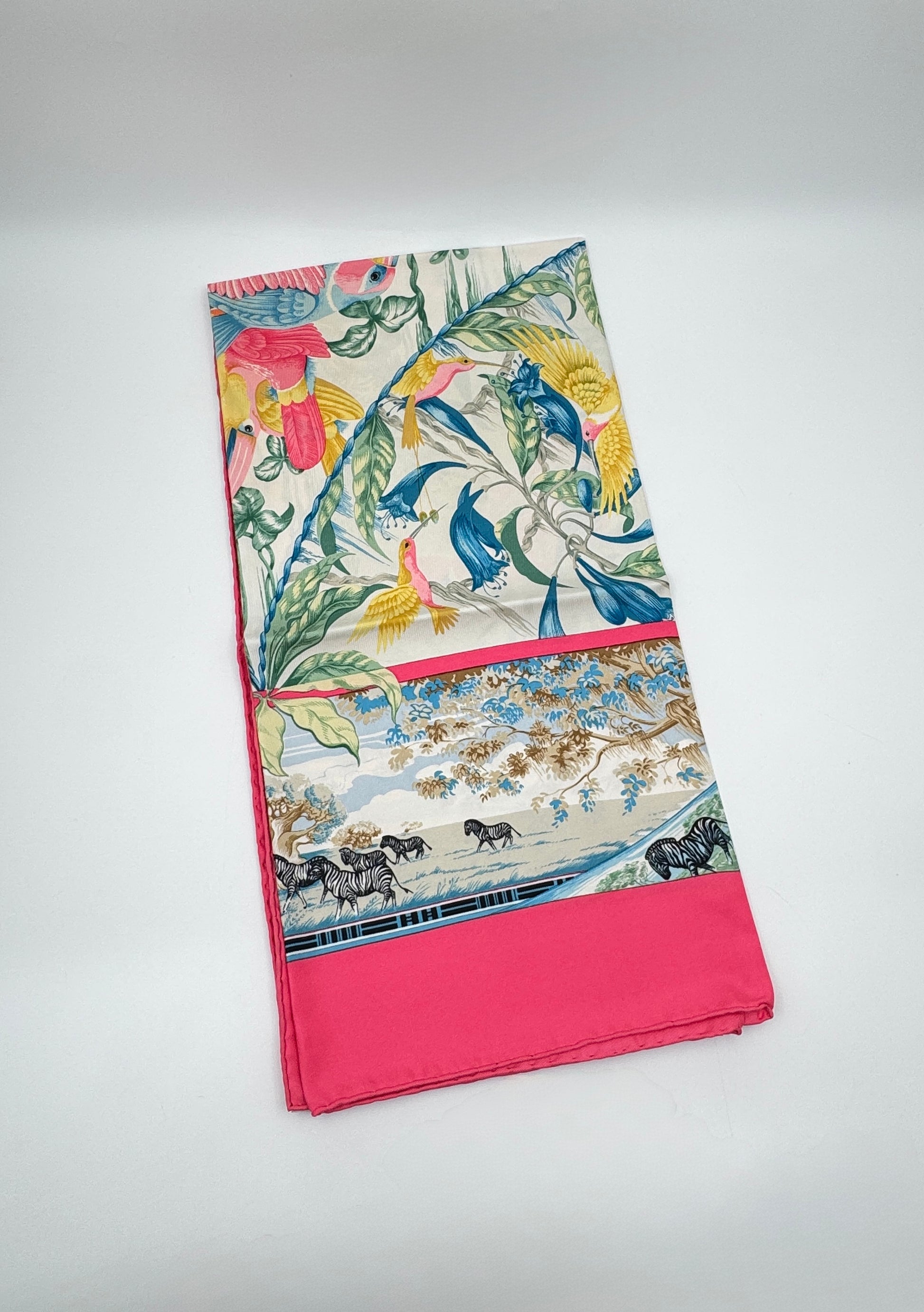 Vibrant Hermès “Tropiques” silk scarf by Laurence Bourthoumieux, featuring tropical birds, zebras, and lush foliage within a vivid pink border.