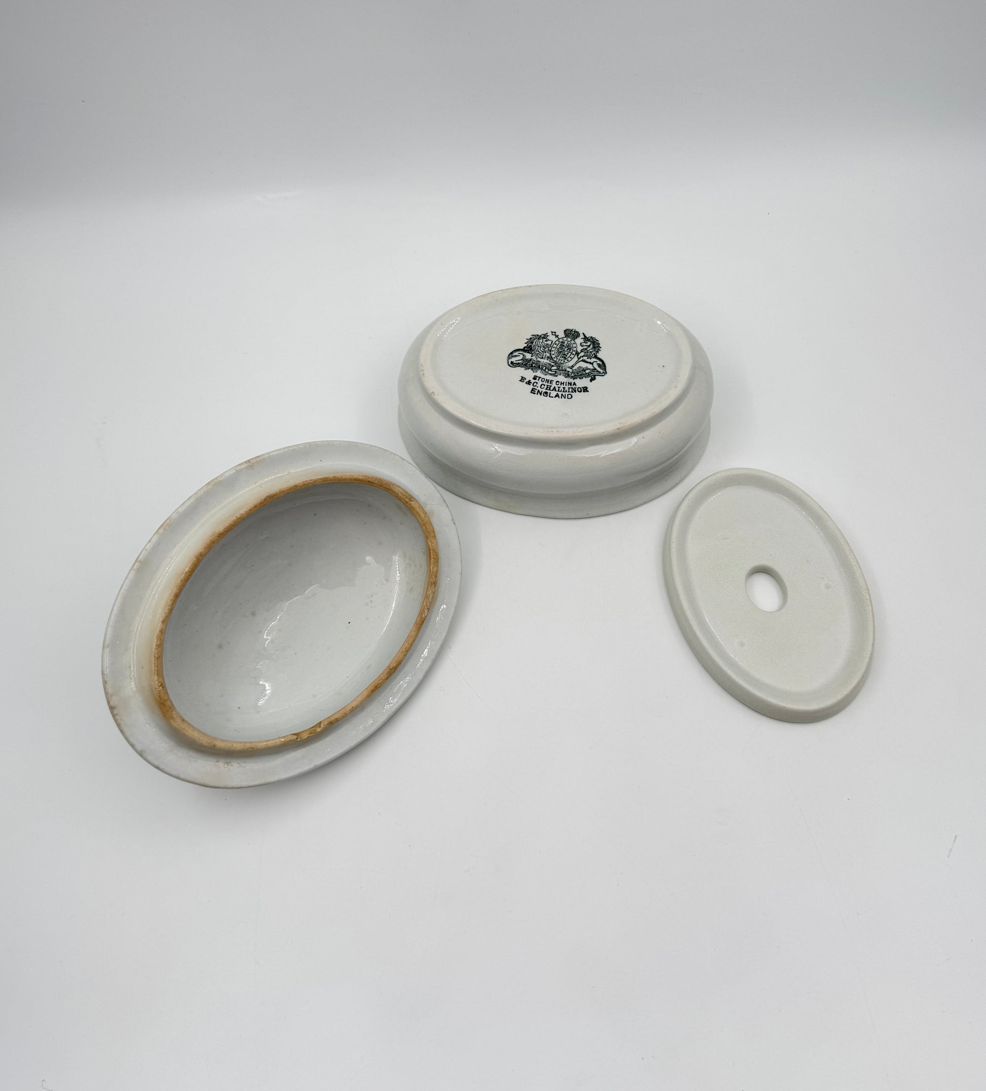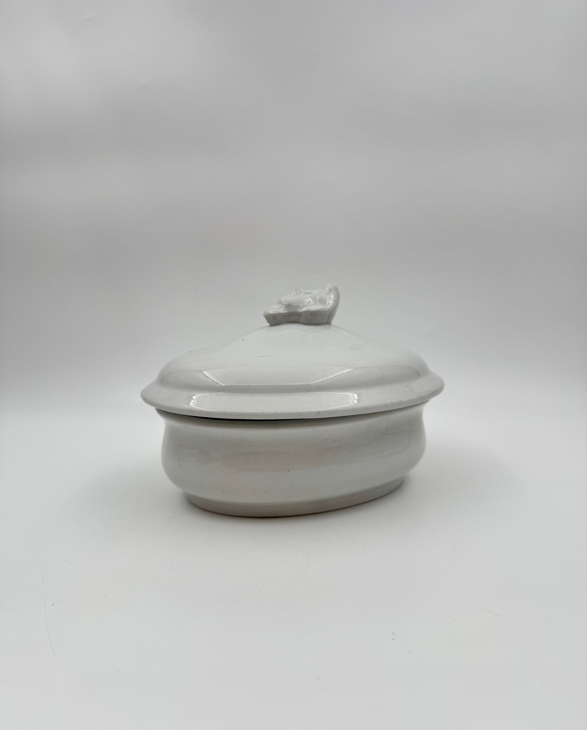 - Antique ironstone with molded face lid