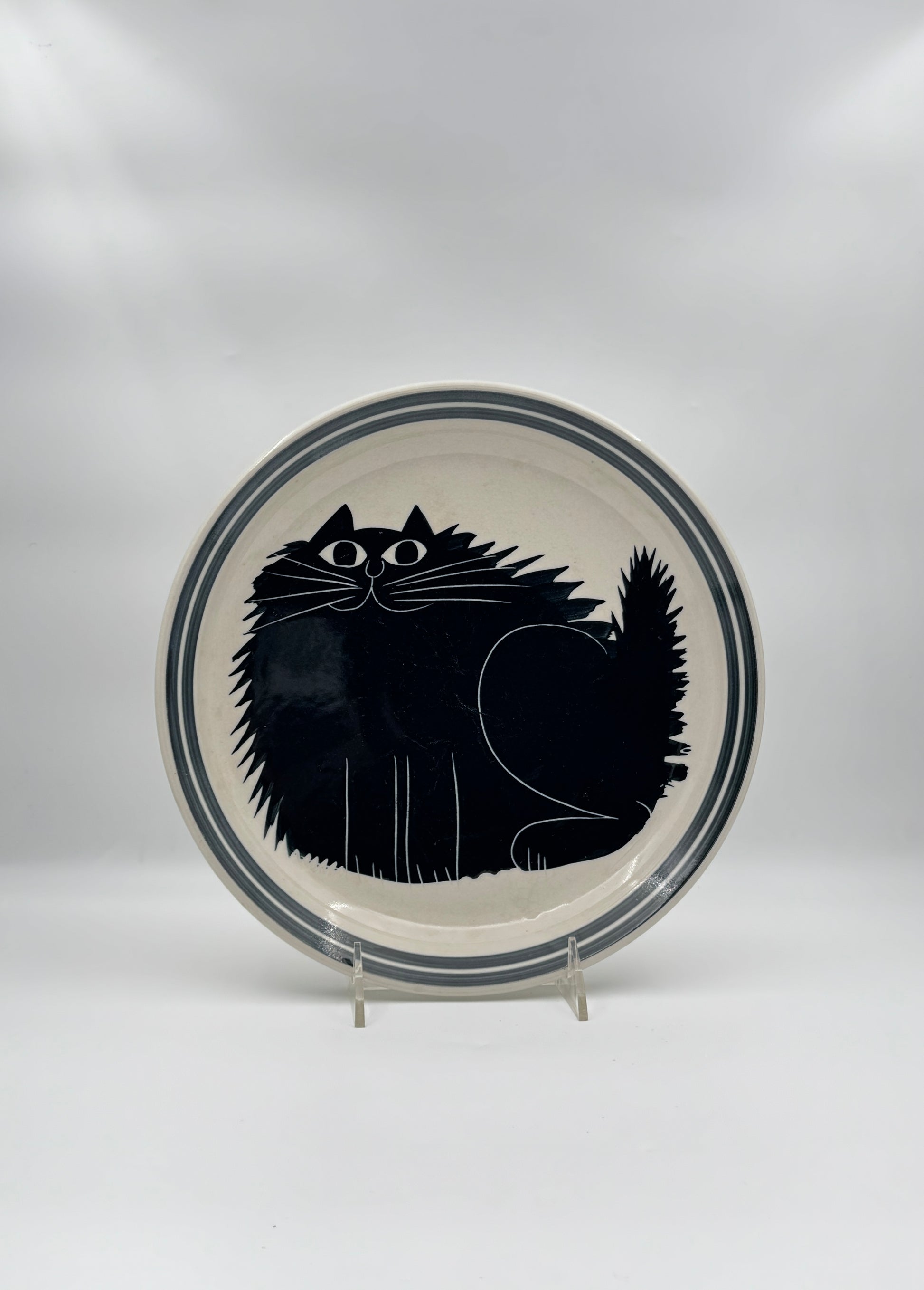 Charming hand-painted ceramic plate by Karen Donleavy featuring a whimsical sitting black cat with bold, expressive details and double gray borders.