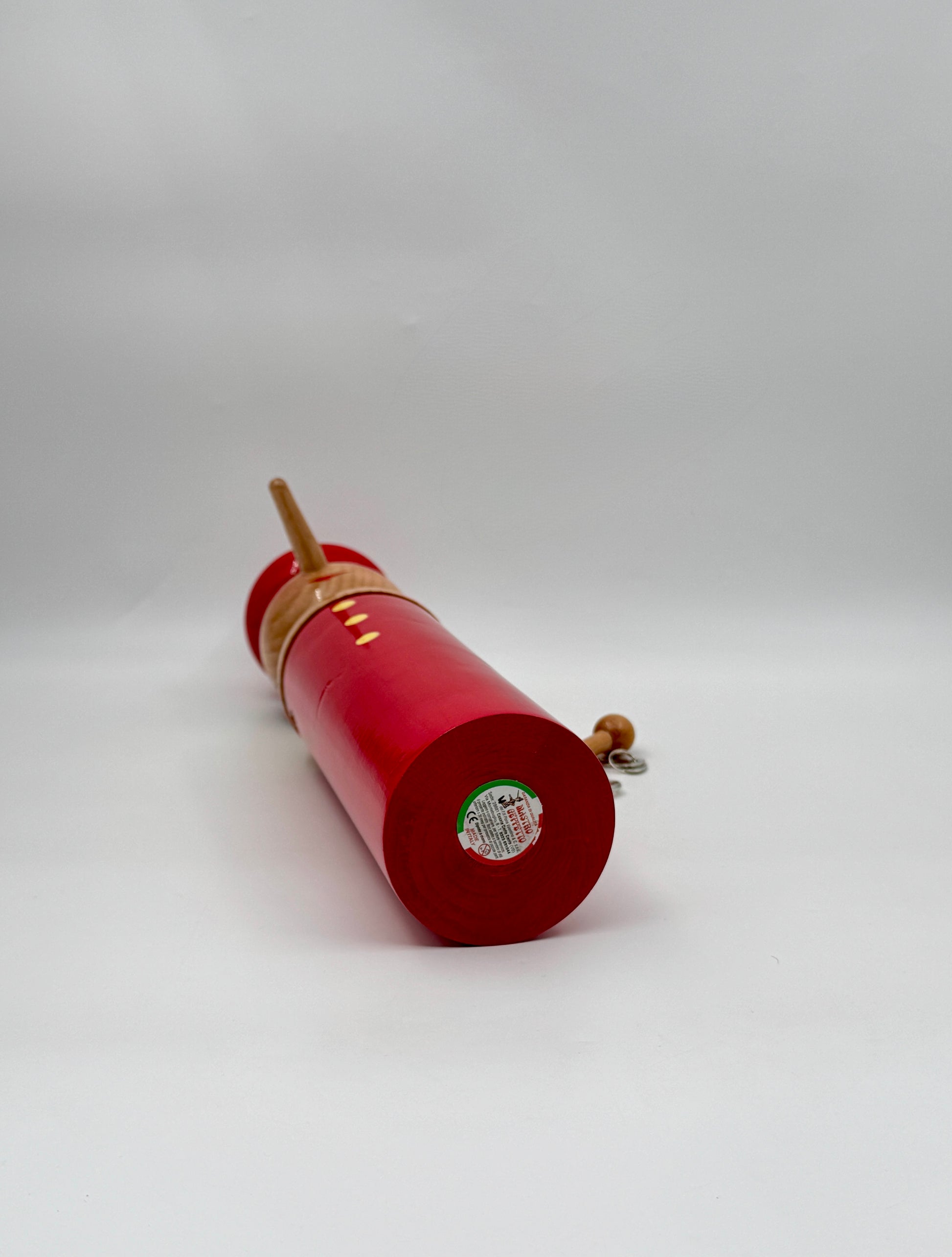 Charming wooden coin bank in the shape of Pinocchio, painted in bright red and natural wood tones. Includes a small lock and key for secure storage.