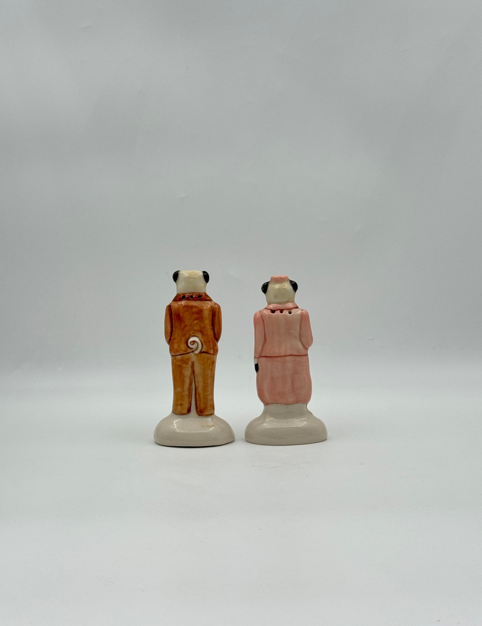 Charming ceramic salt and pepper shakers by Laura Wilensky (2004), featuring a pug couple dressed in vintage attire — a gentleman in a brown suit and a lady in a pink dress.