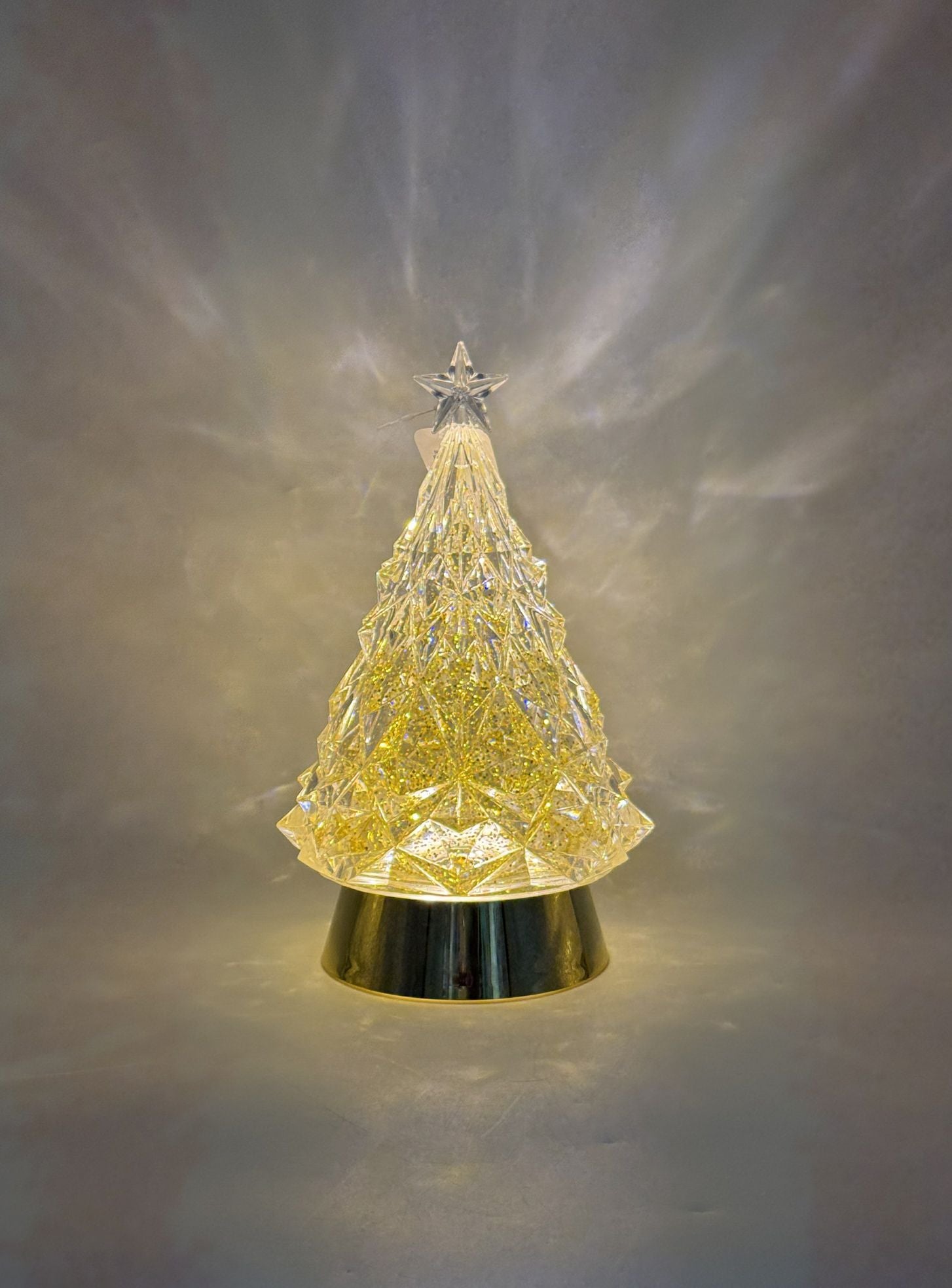 - Clear plastic tree with gold base and star topper