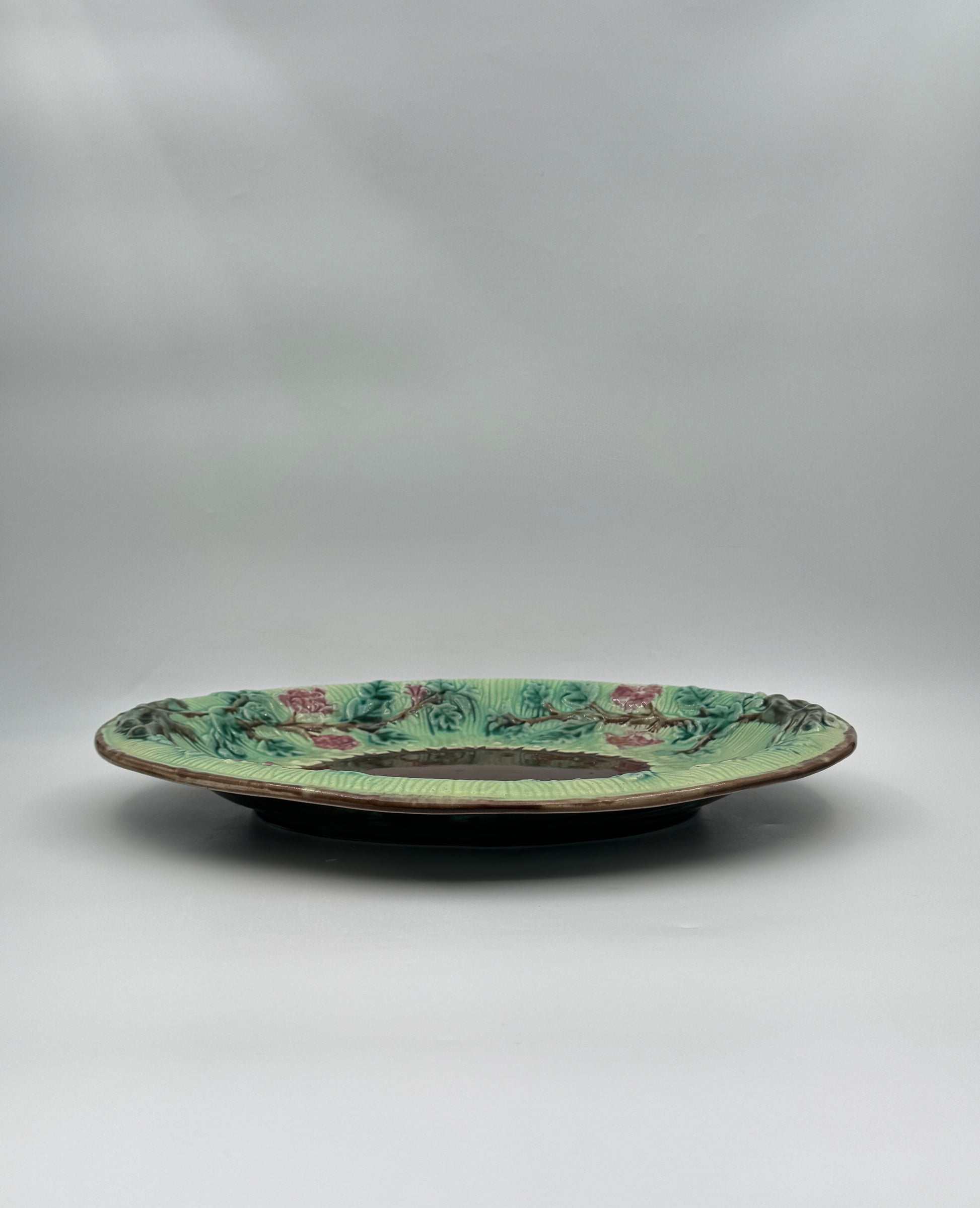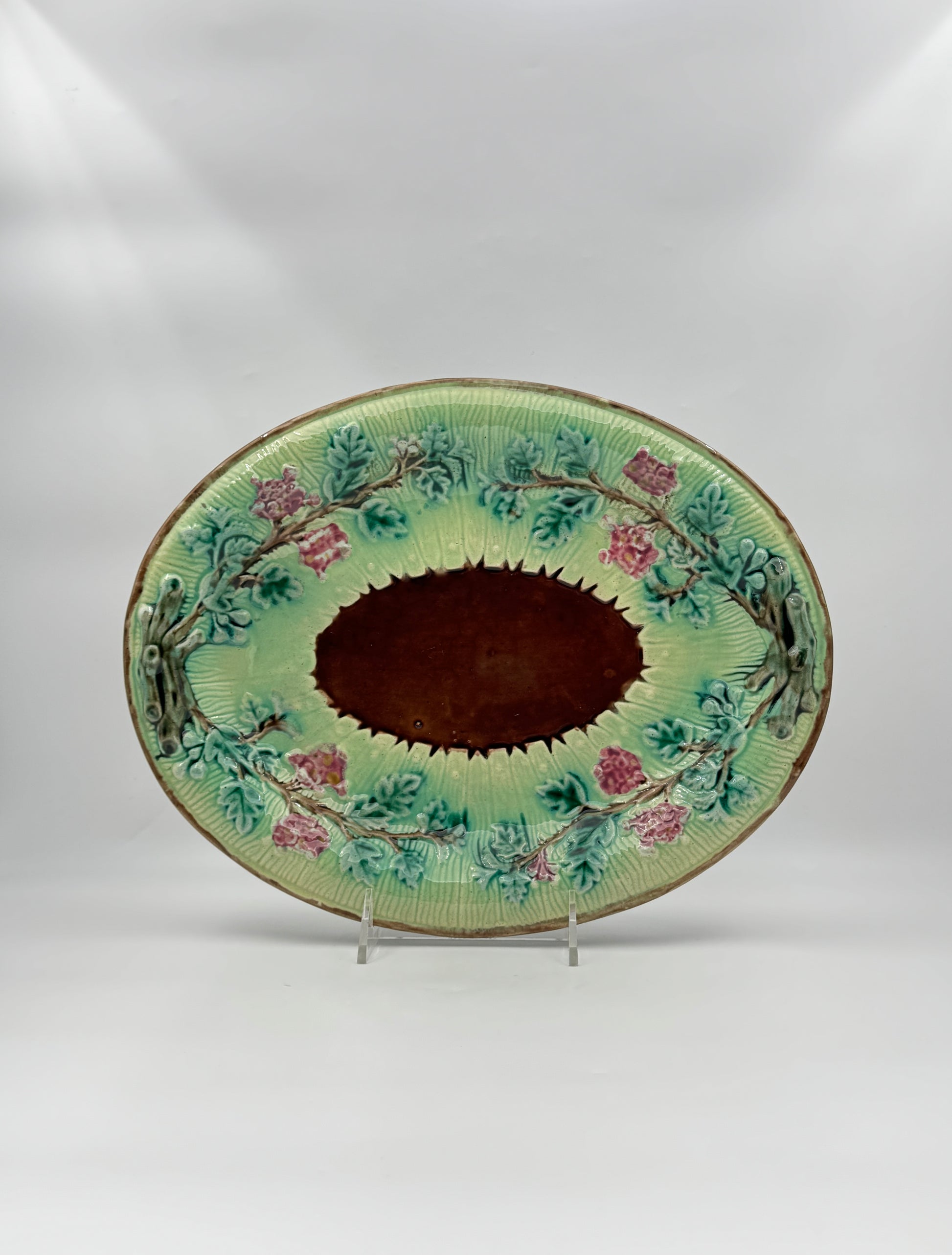 Majolica Oval Platter – Green and Brown with Pink Floral Relief