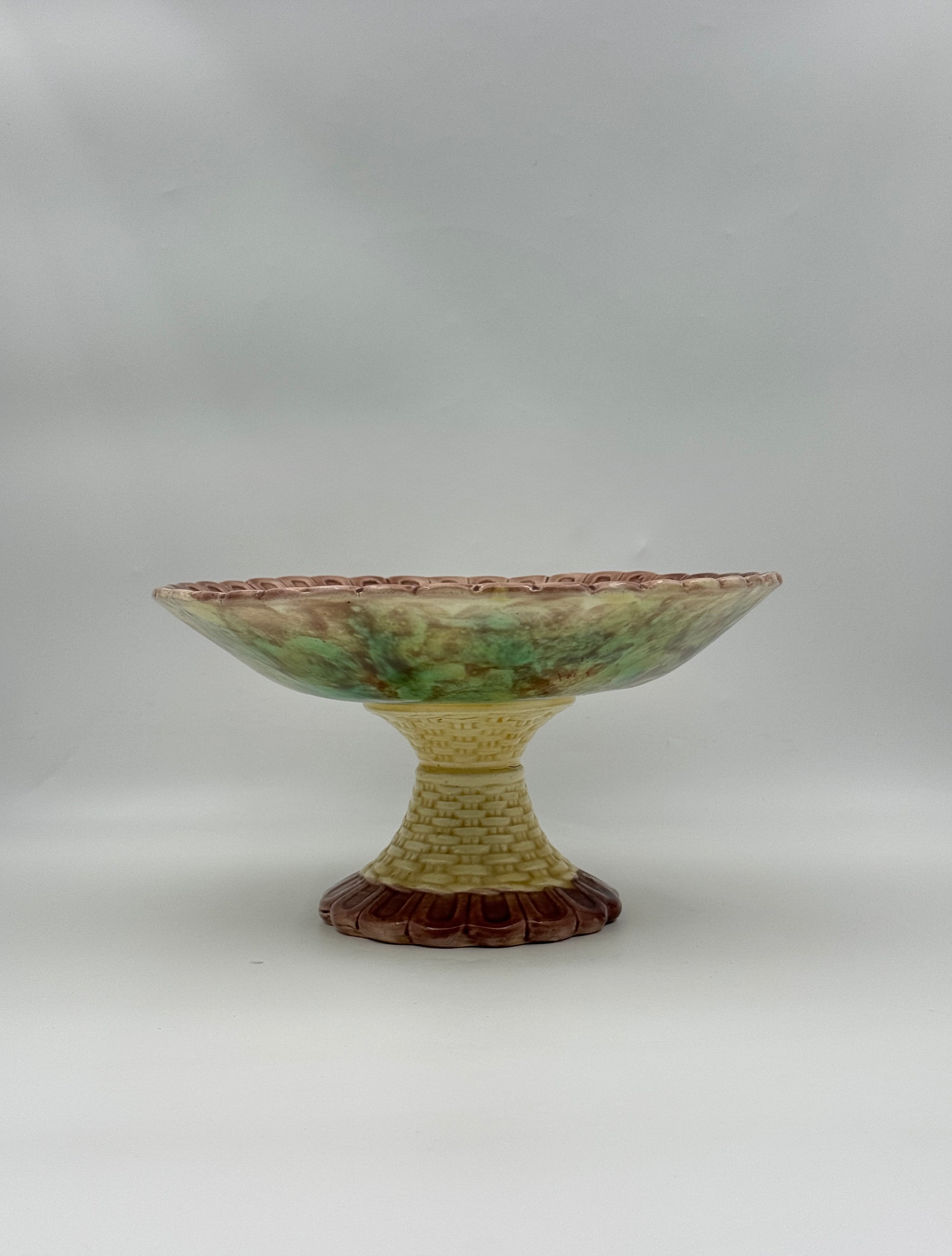 Charming majolica pedestal stand featuring a woven basket-style base in cream and brown, topped with a green leaf-patterned bowl.