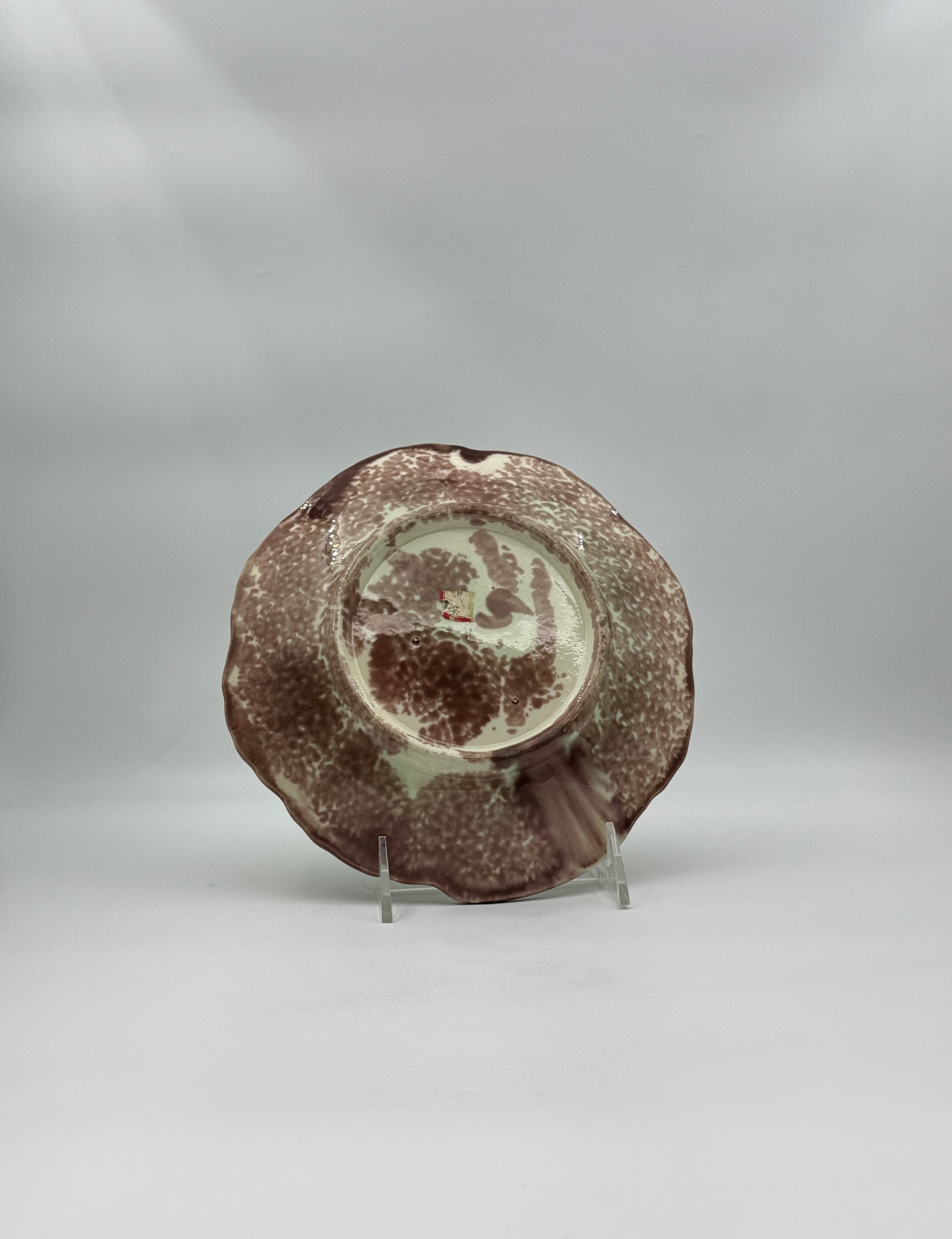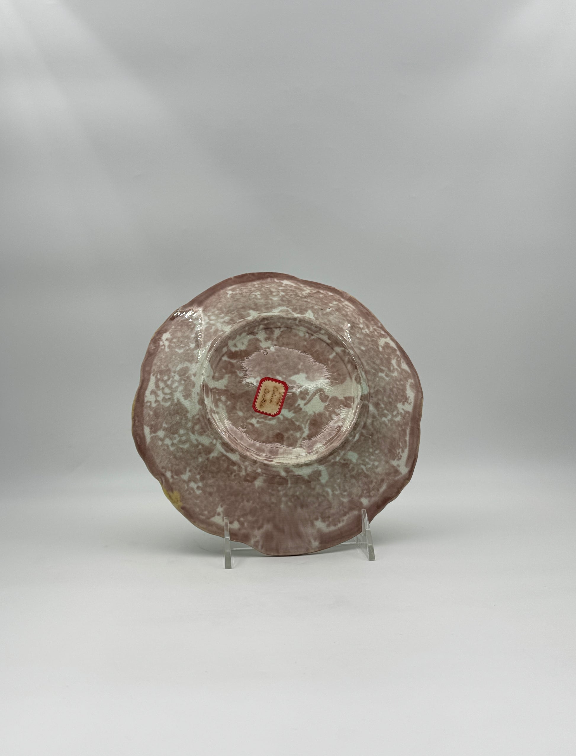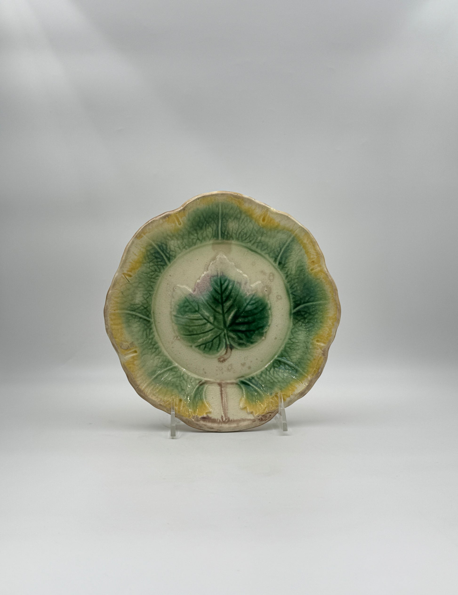Set of three antique majolica plates featuring a raised leaf design in green, yellow, and brown tones with textured details.