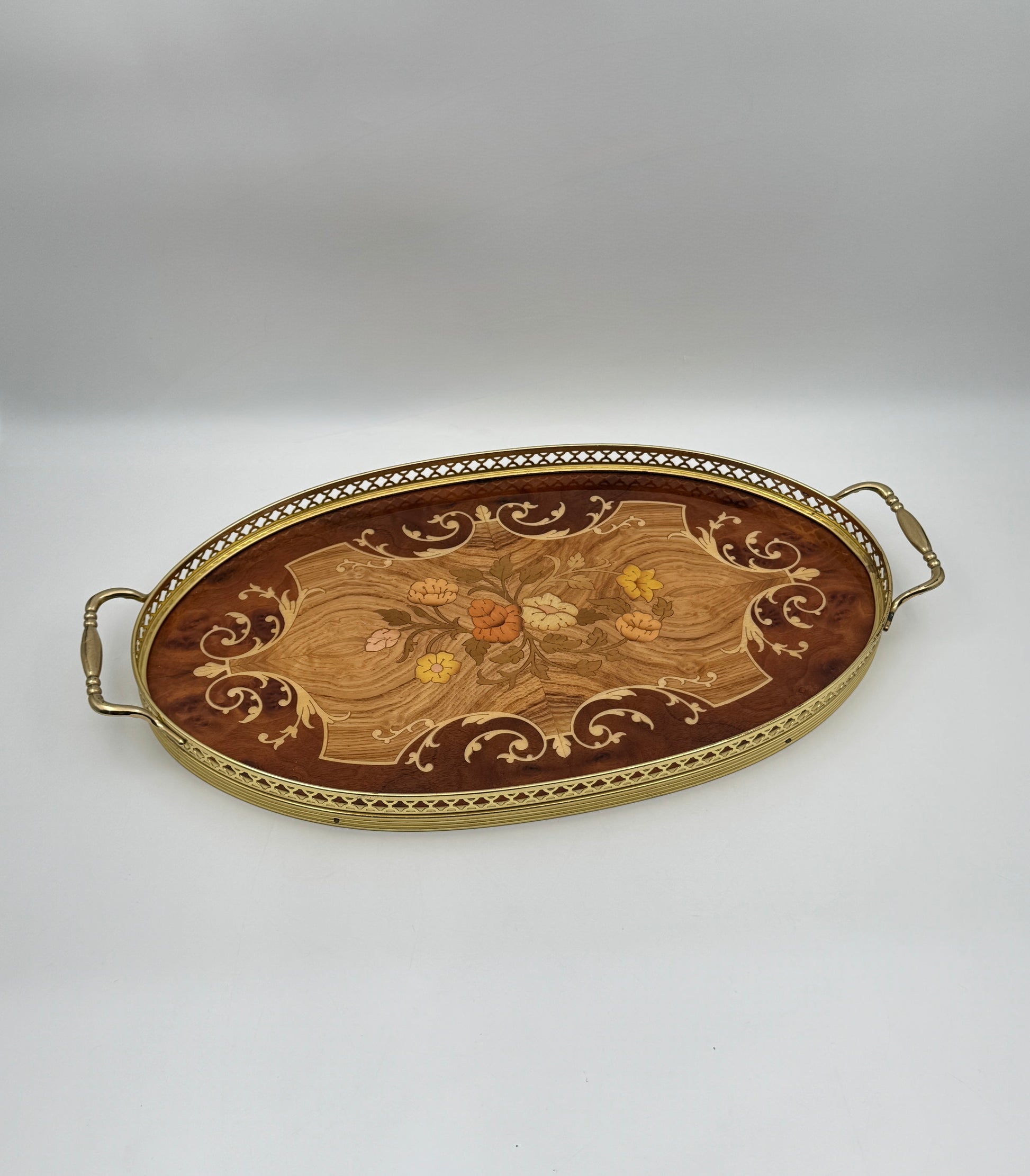 Elegant Italian marquetry oval tray by Miss Bellevue, Meta di Sorrento, featuring intricate floral inlay, framed by a pierced brass gallery and dual brass handles.