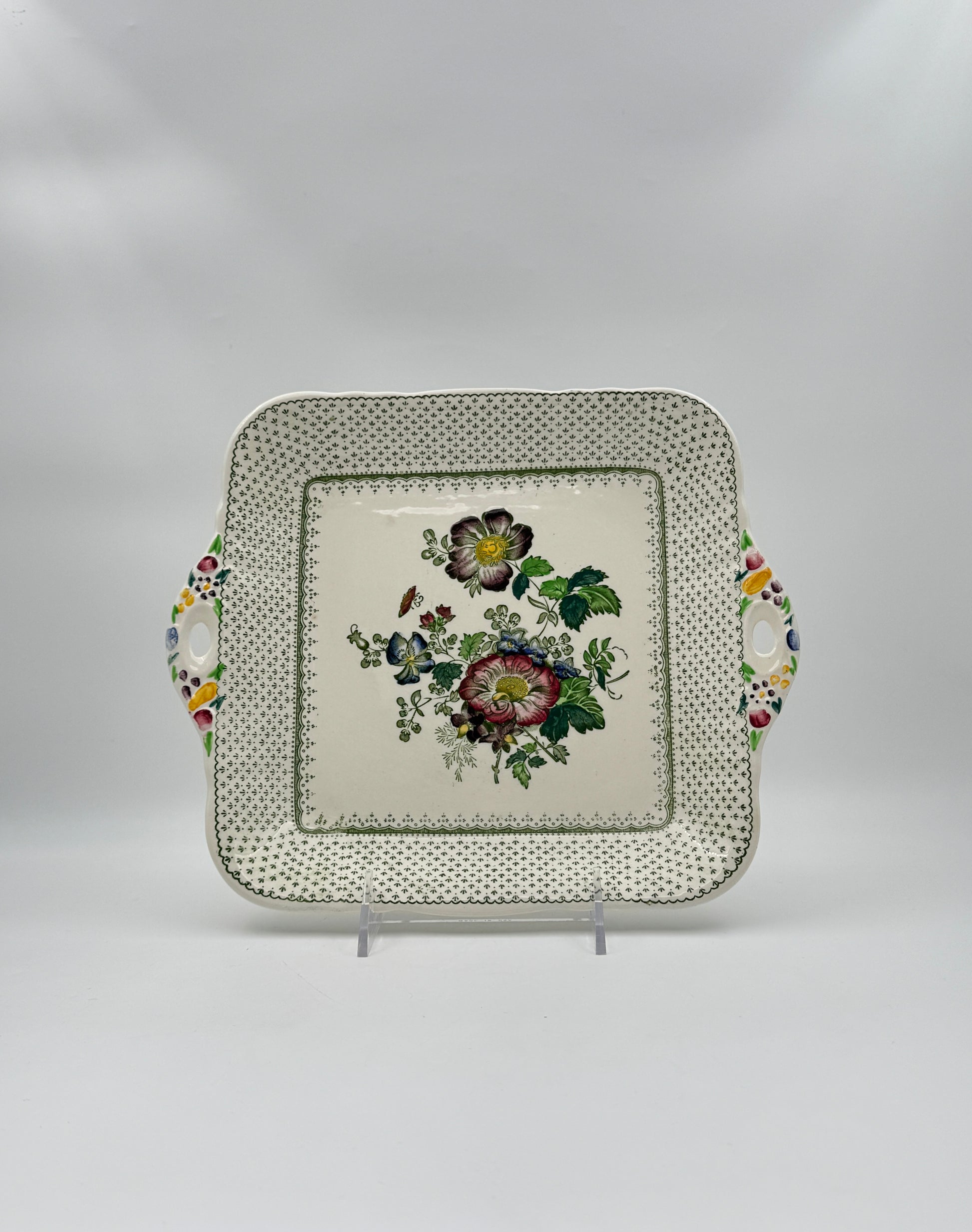 Vintage Mason’s Ironstone square cake plate in the "Paynsley" pattern, featuring colorful floral decoration, green border, and twin side handles.