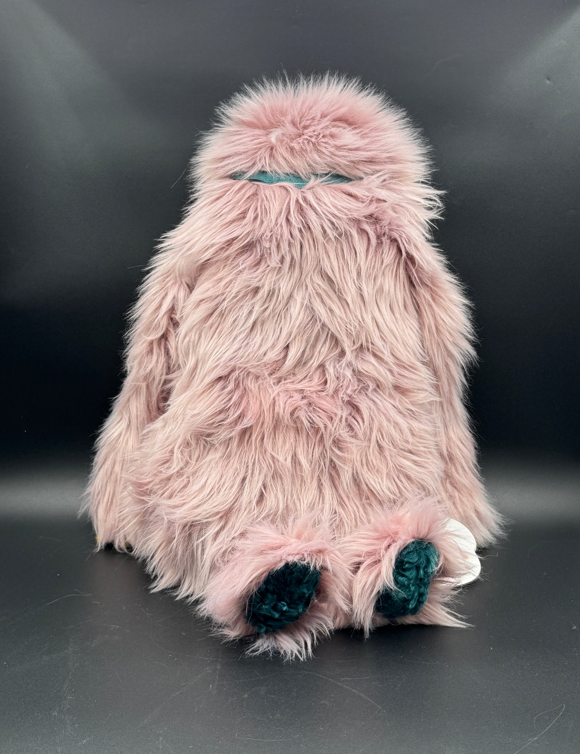 Whimsical plush from Moulin Roty’s Schmouk collection featuring mauve long fur, blue fleece mouth, and playful embroidered eyes.