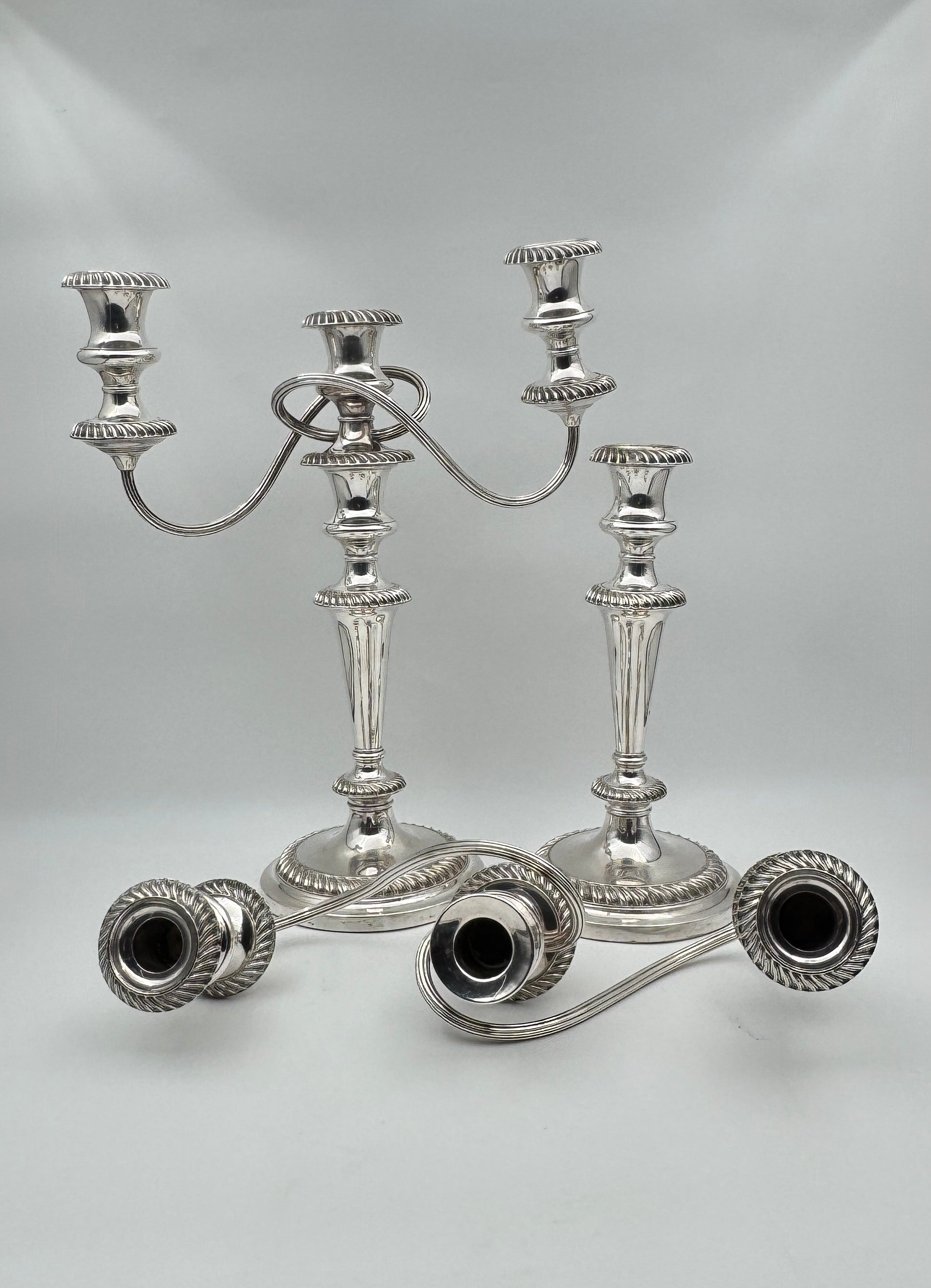 Elegant pair of silverplate three-arm candelabras by Elkington & Co., England, featuring neoclassical fluted design with detachable tops for versatility. The tops detach, allowing use as either three-arm candelabras or single candlesticks.