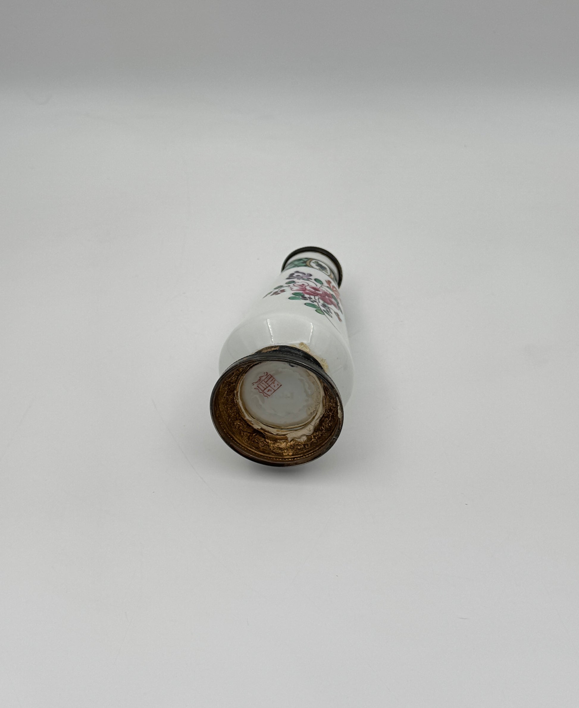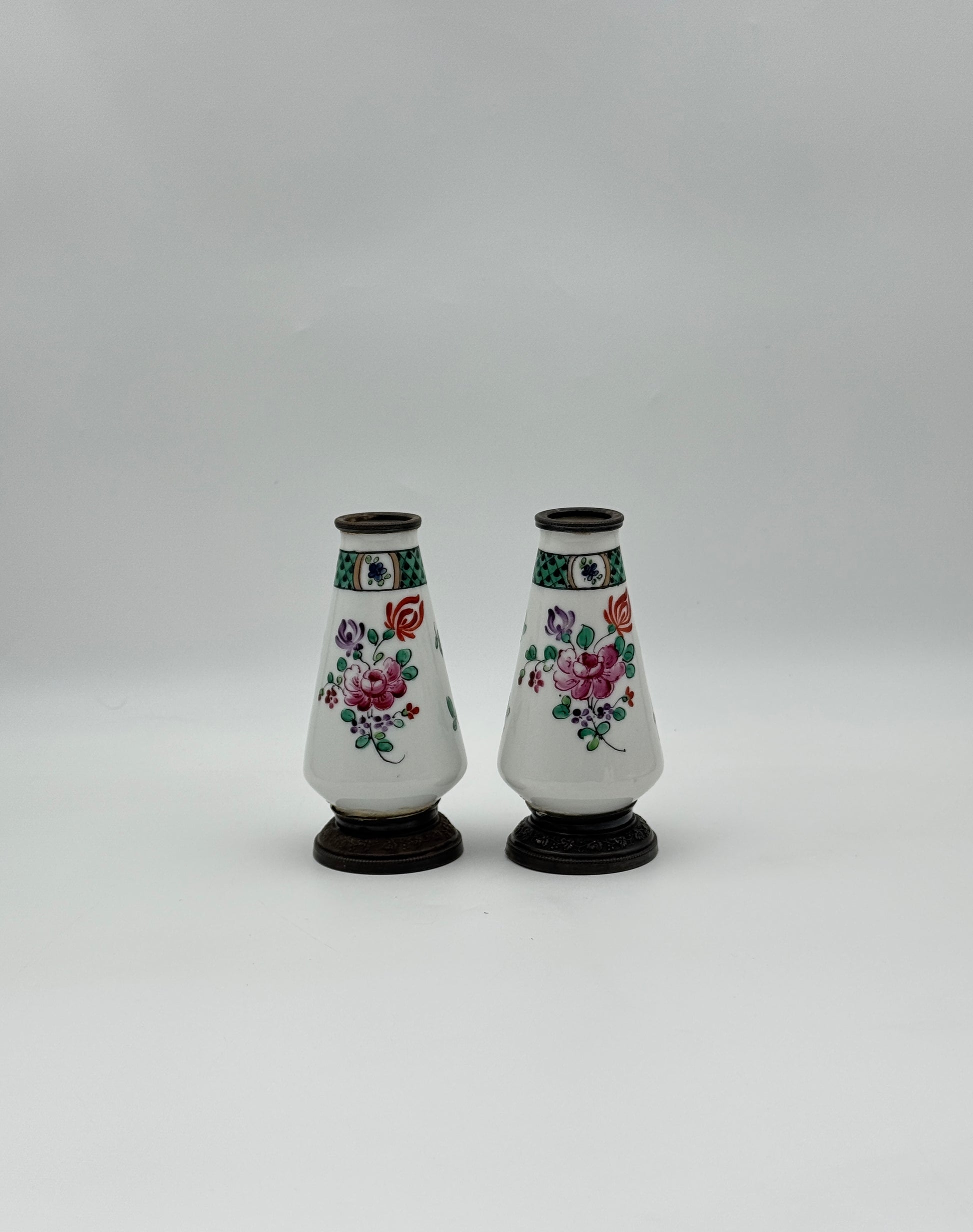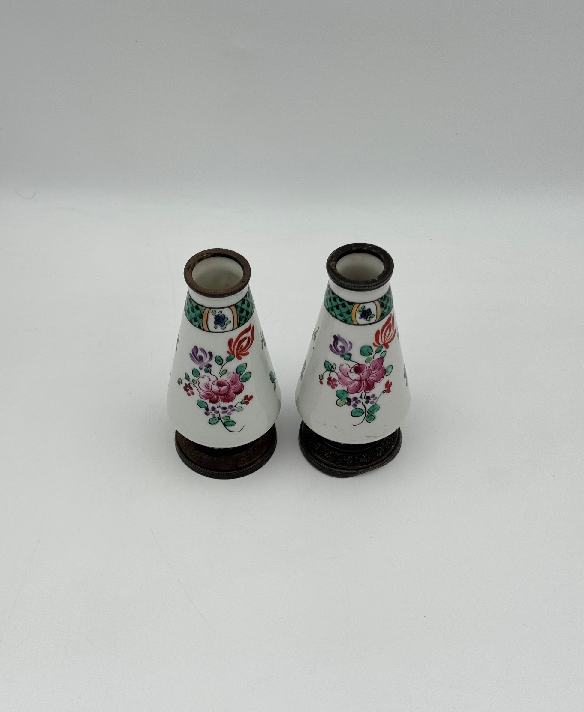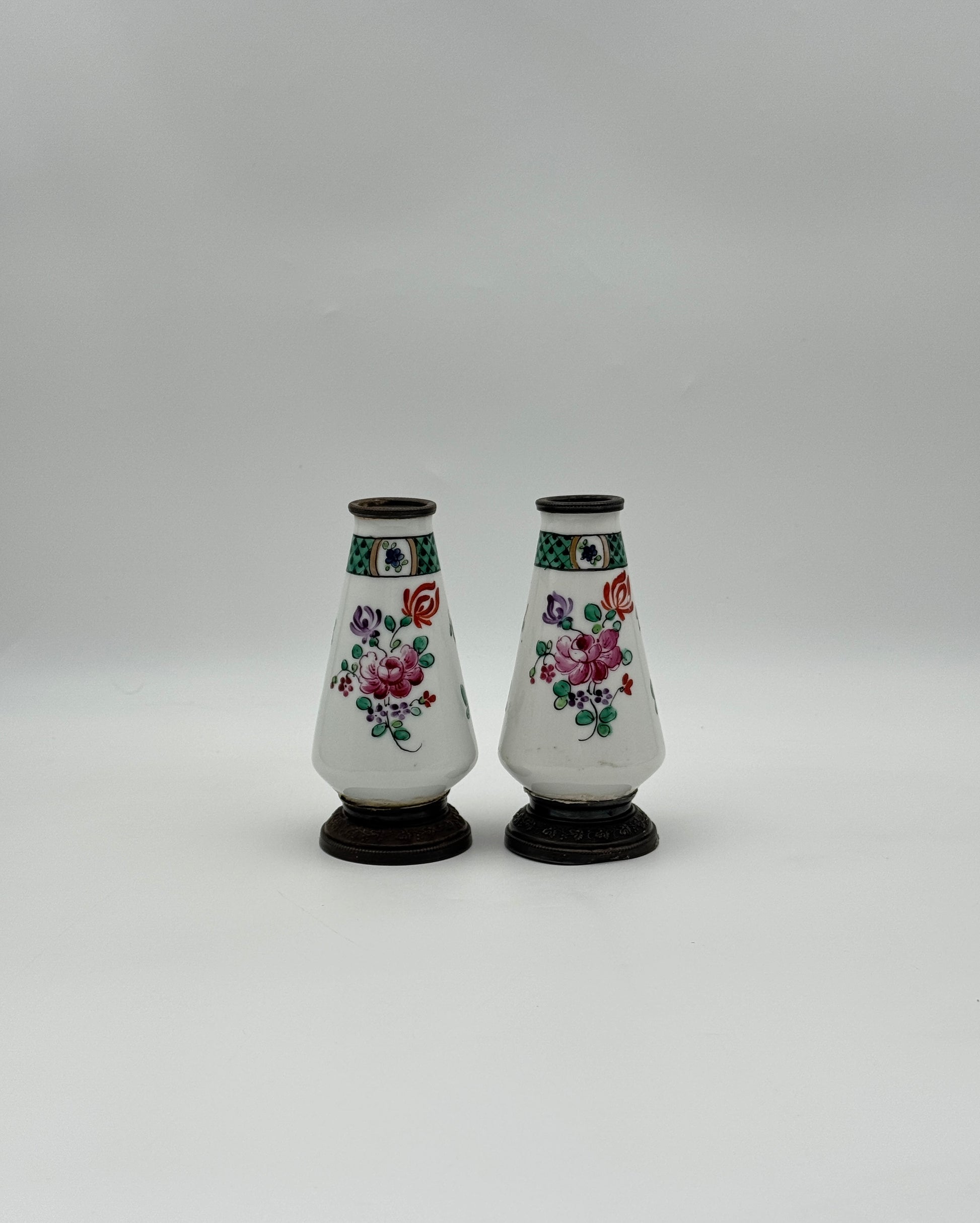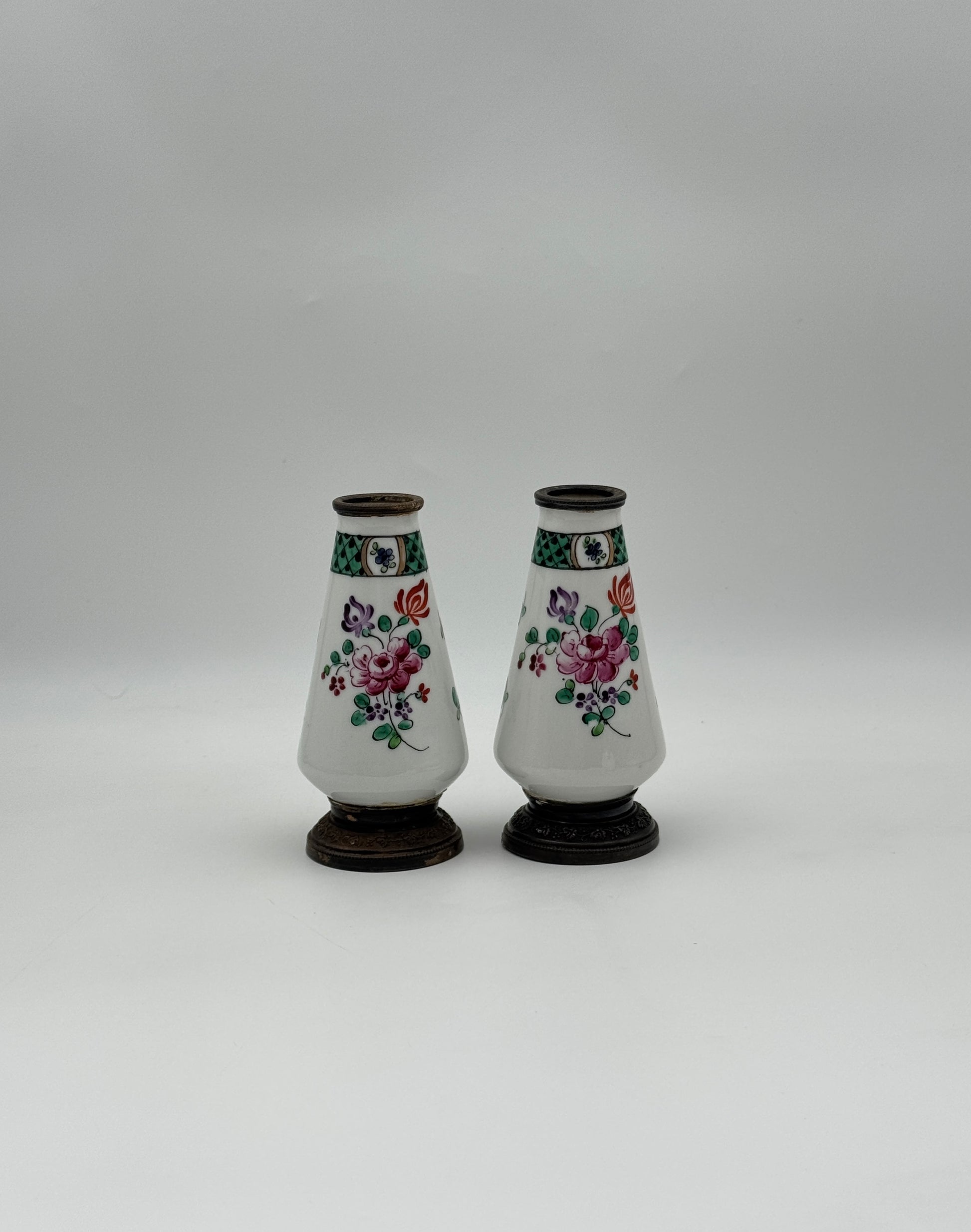 Charming pair of porcelain bud vases decorated with colorful handpainted floral motifs, mounted on metal bases with unidentified maker’s marks.