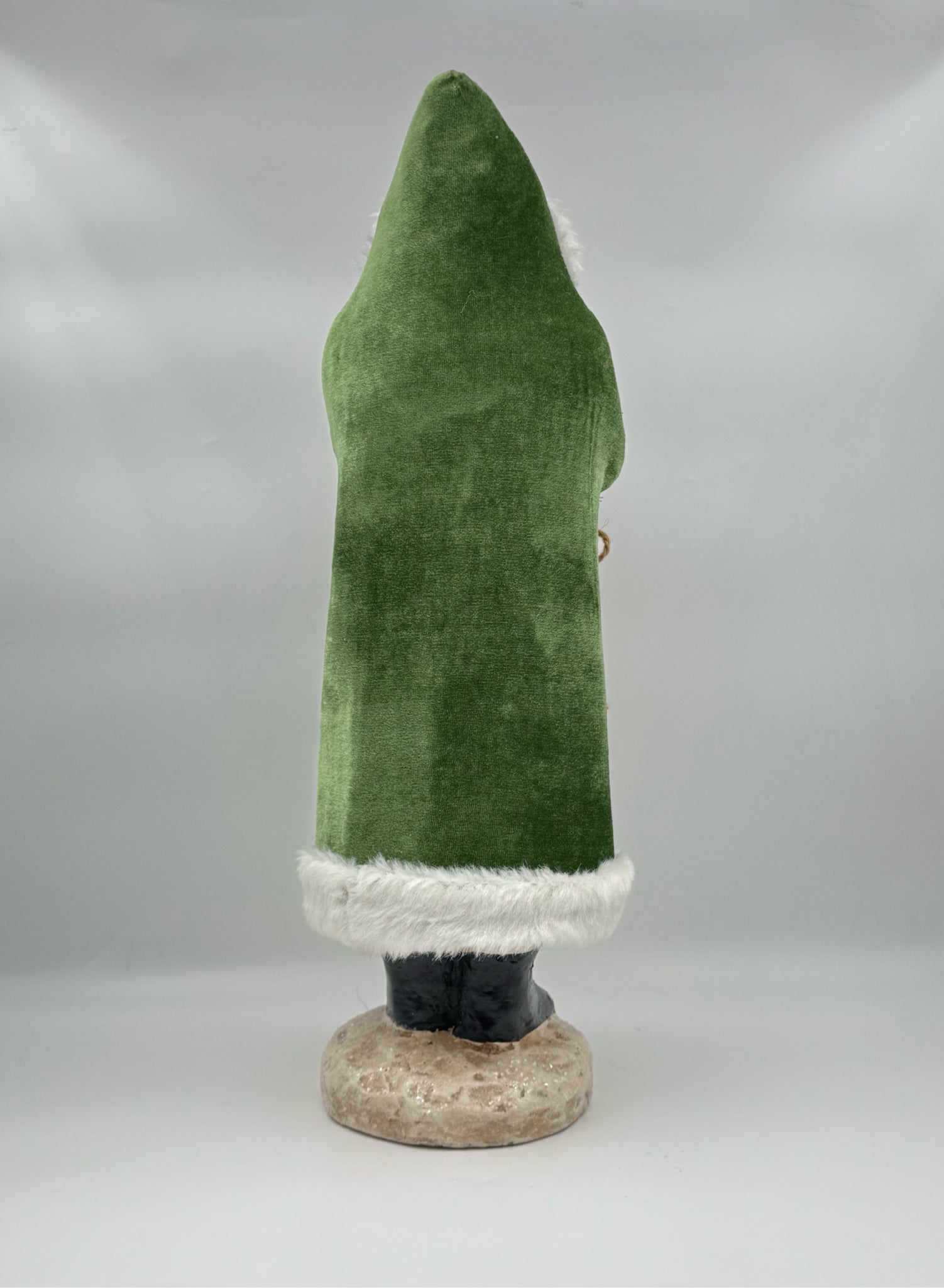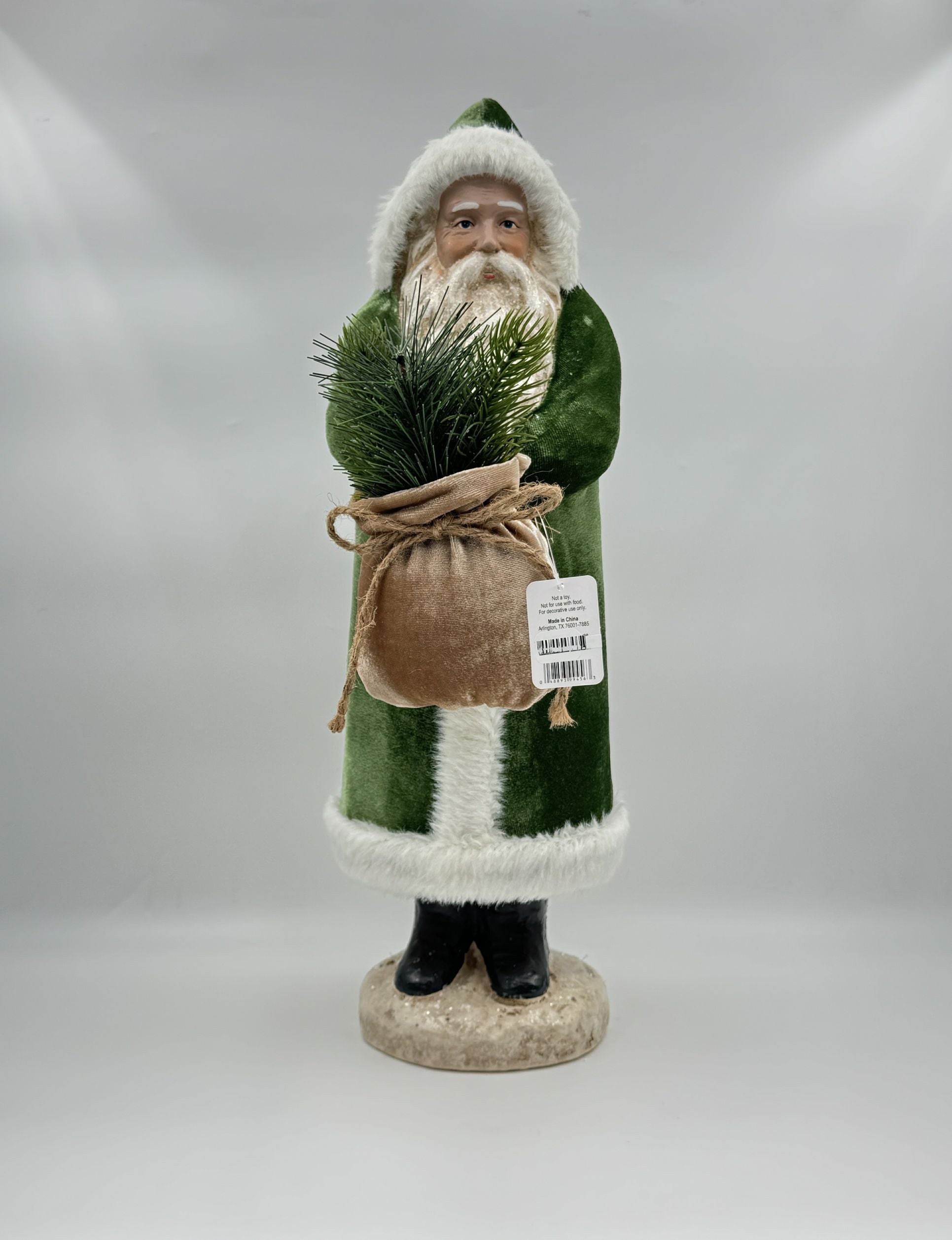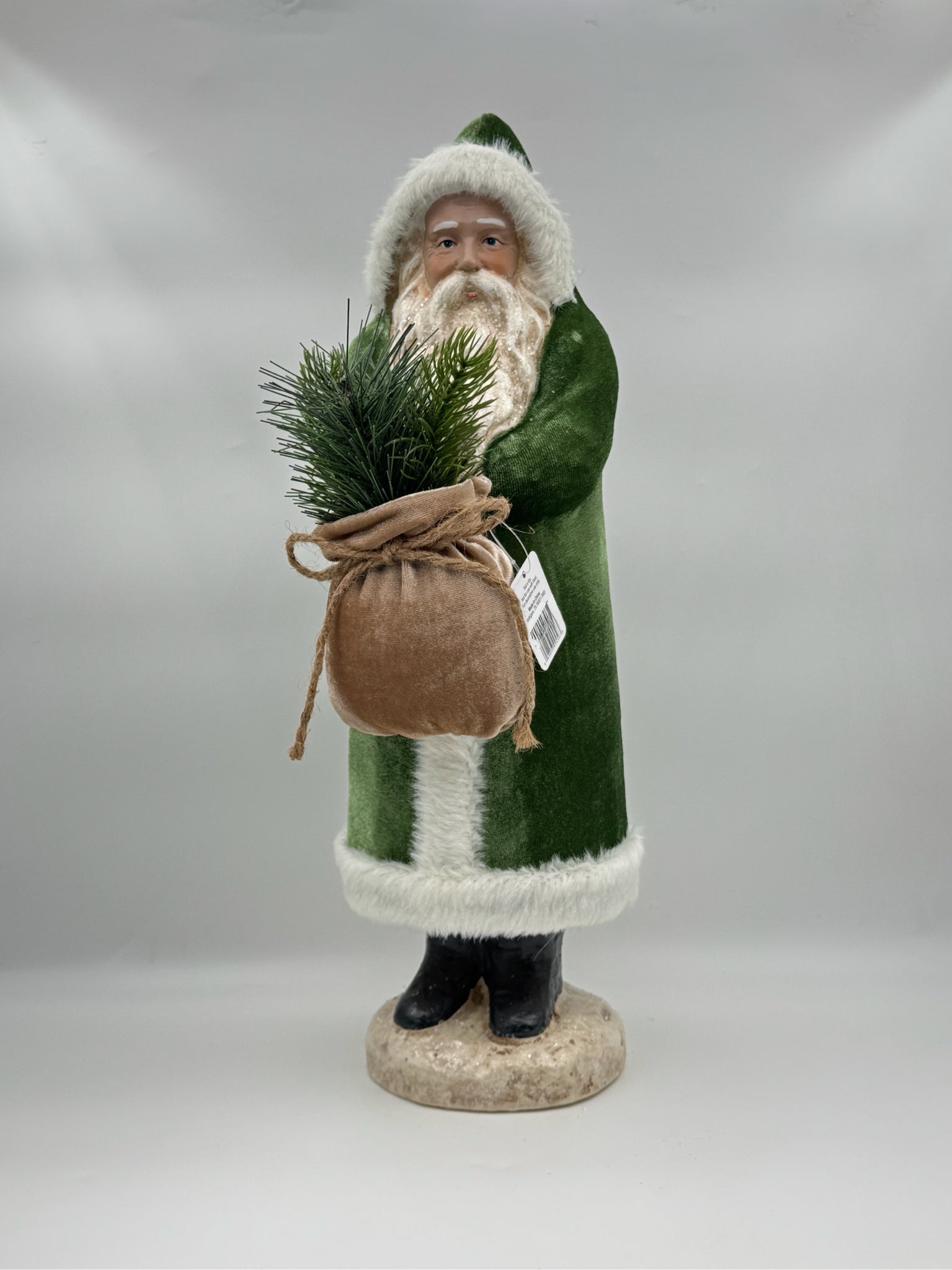 Elegant RAZ Imports Santa Claus dressed in a lush green velvet coat with faux fur trim, holding a burlap sack filled with pine branches.