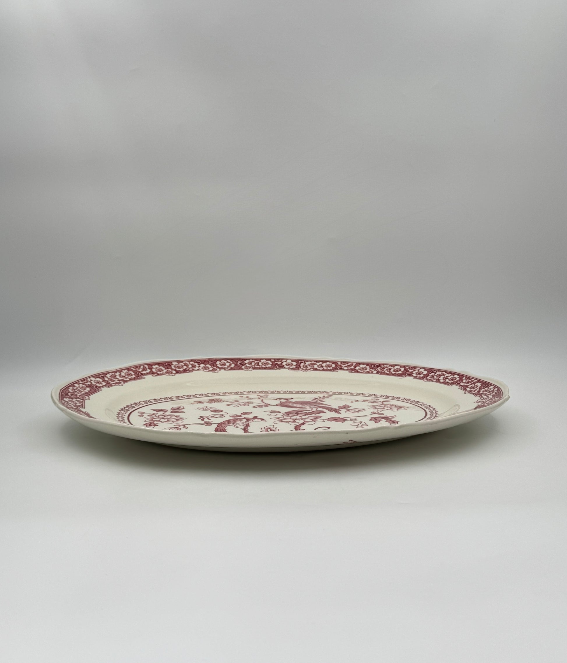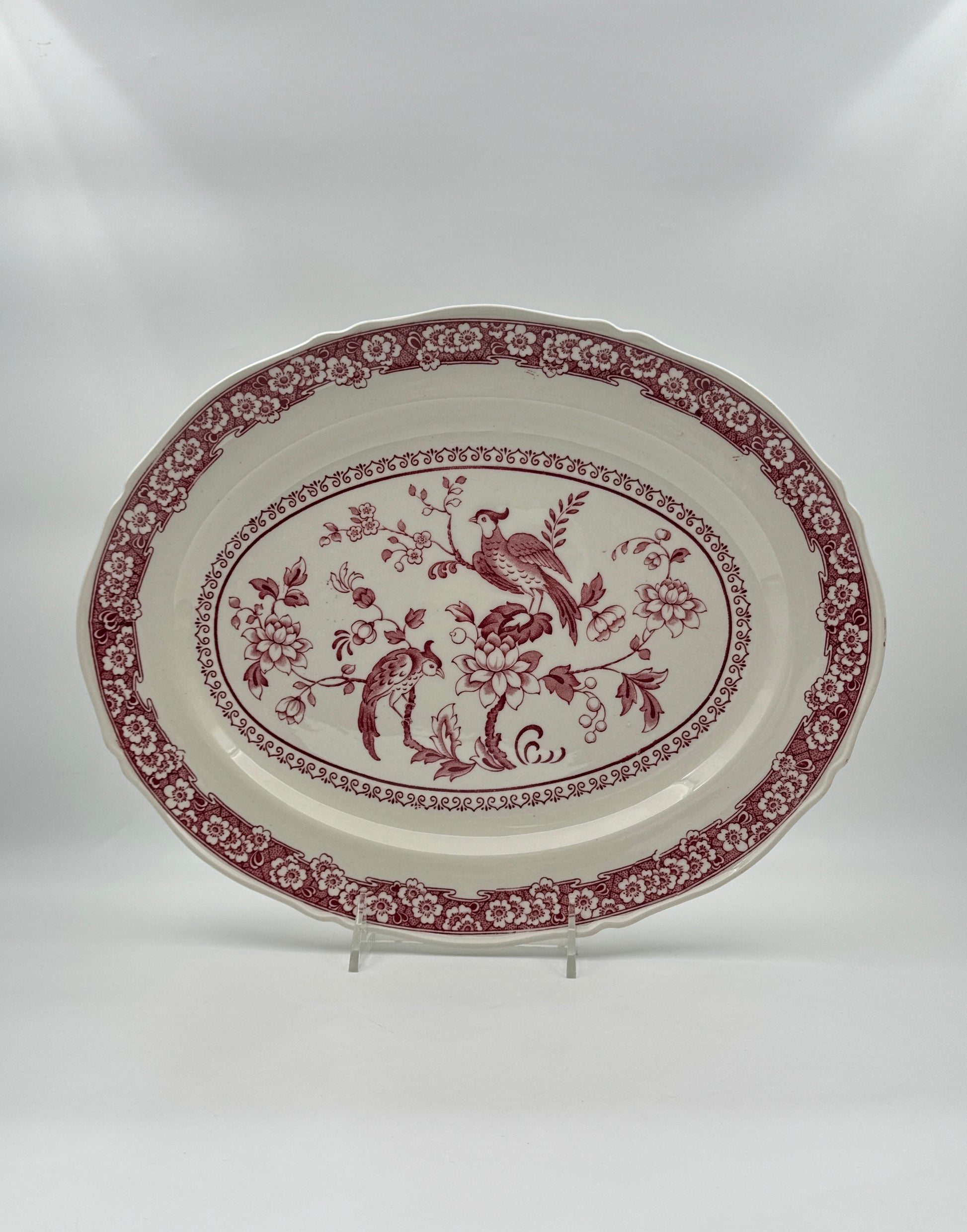 Vintage English transferware platter in deep red with bird and floral motifs, crafted by John Steventon & Sons under the "Carmen" Royal Venton Ware line.