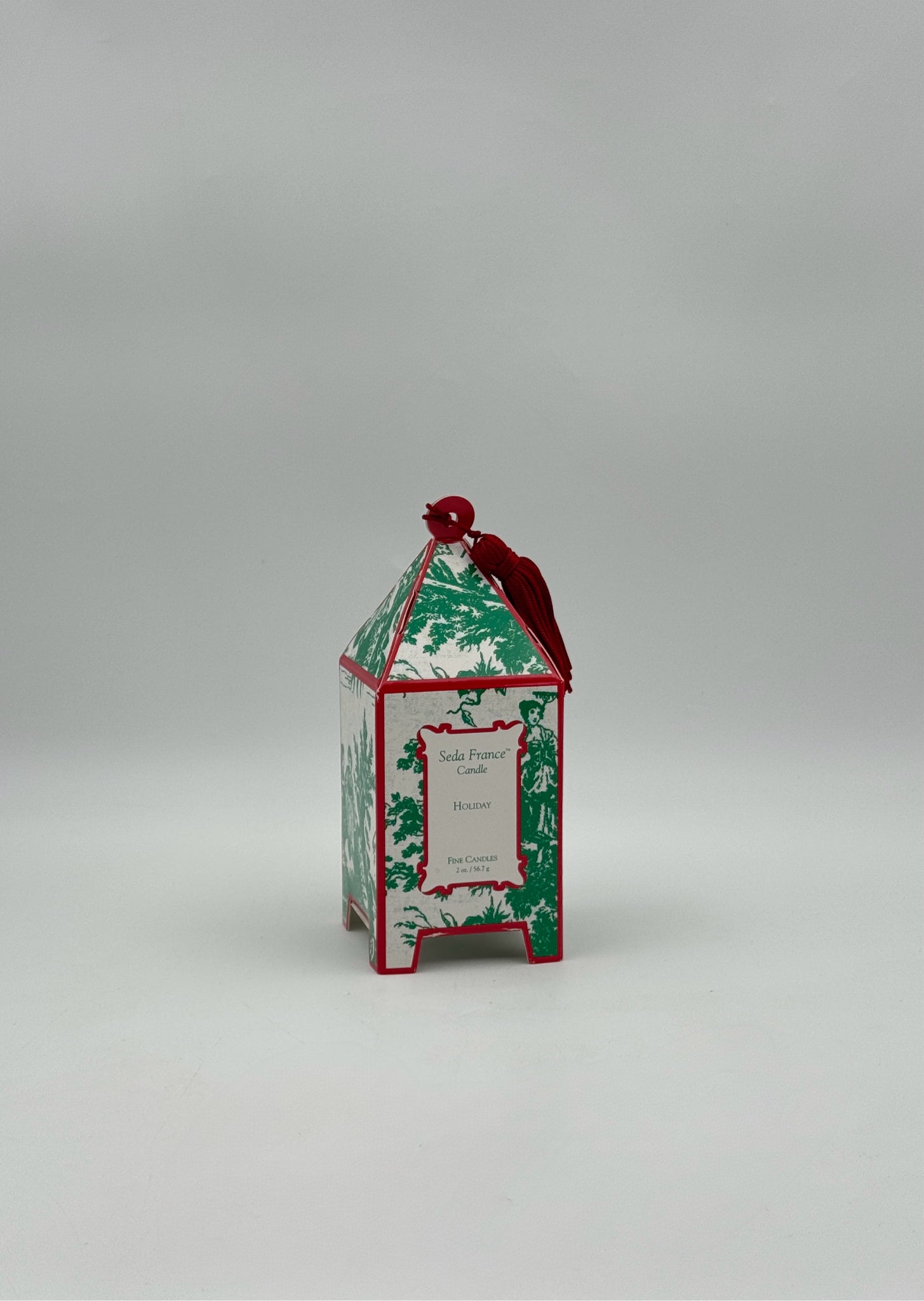 Festive Seda France Holiday Mini Pagoda Candle featuring notes of fir balsam, cedarwood, citrus, and eucalyptus for a fresh, pine-filled aroma.
