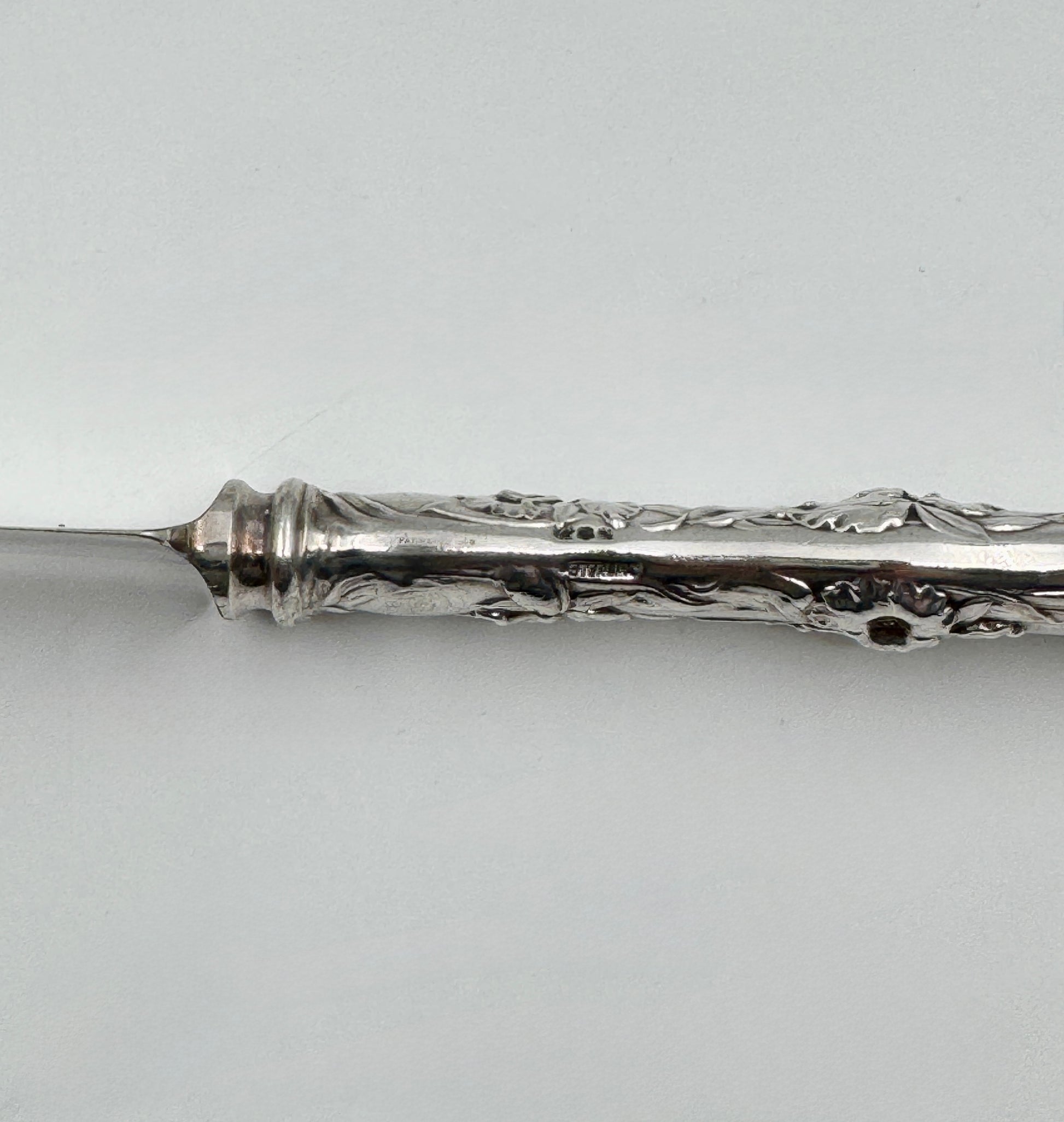 - Sterling silver handles with intricate floral motif