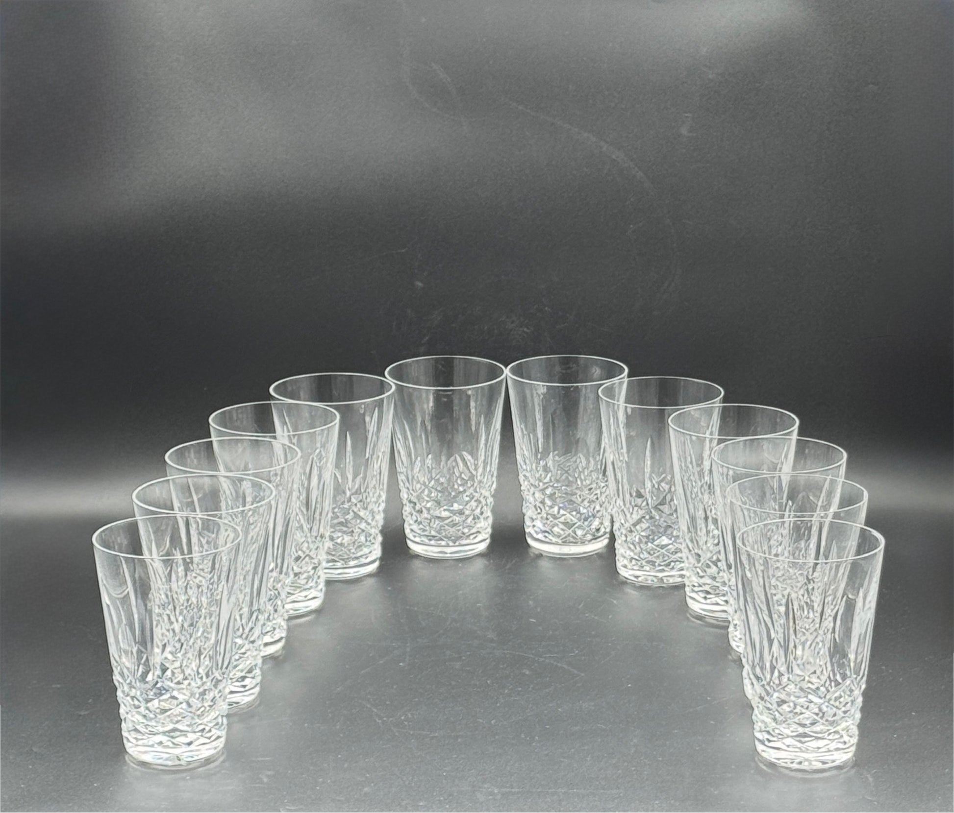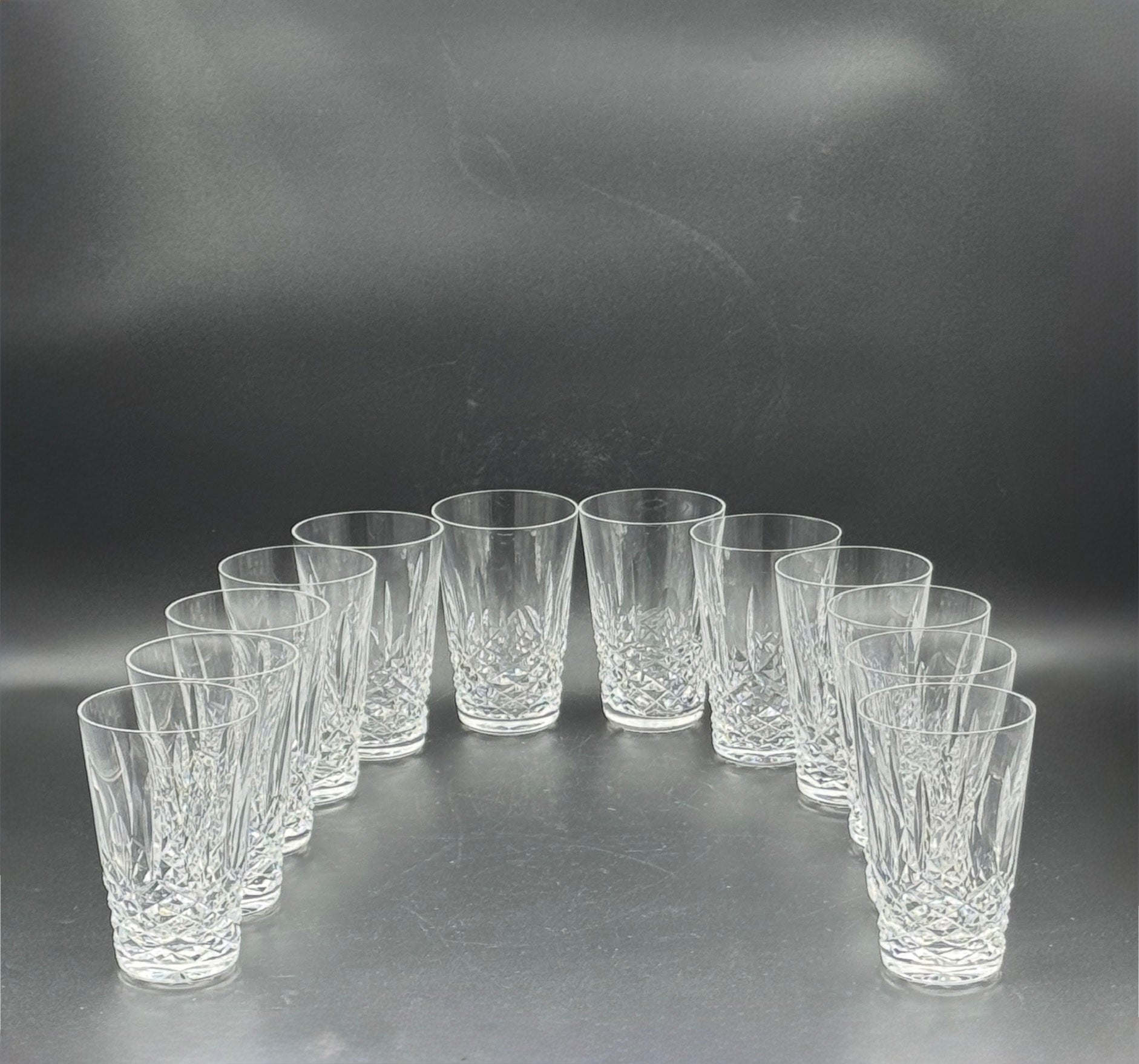 Elegant set of 12 Waterford crystal highball glasses in the “Kenmare” pattern, featuring brilliant diamond and vertical cuts. Perfect for cocktails or everyday drinks.