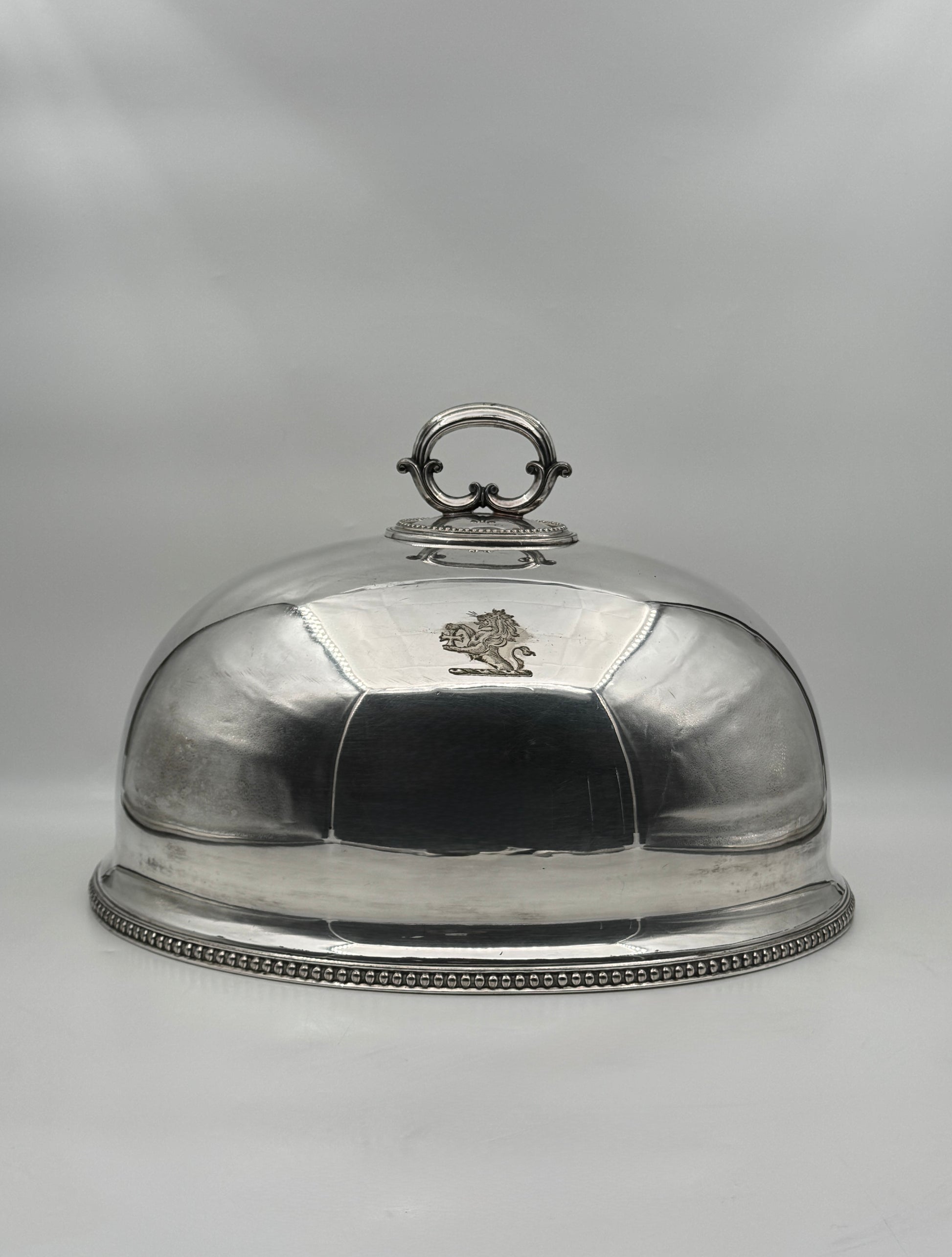 Refined silverplate meat dome by Goldsmiths & Silversmiths Co., London, with a scrolled handle, beaded edge, and engraved lion crest.