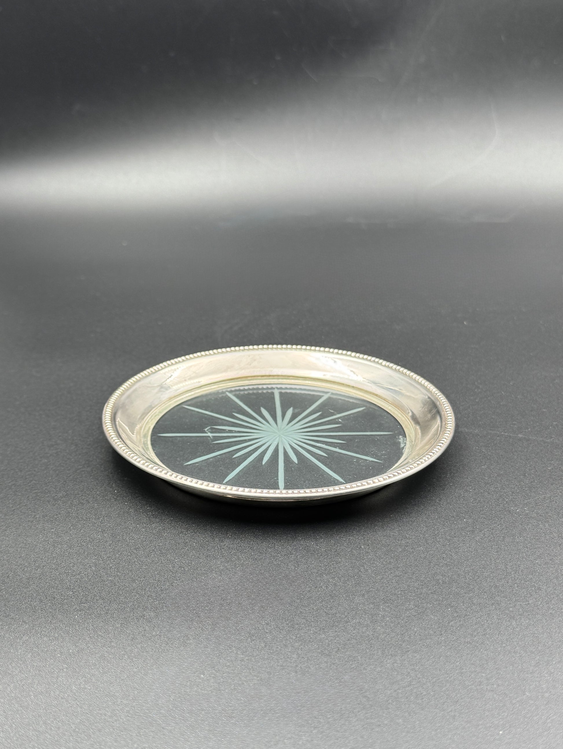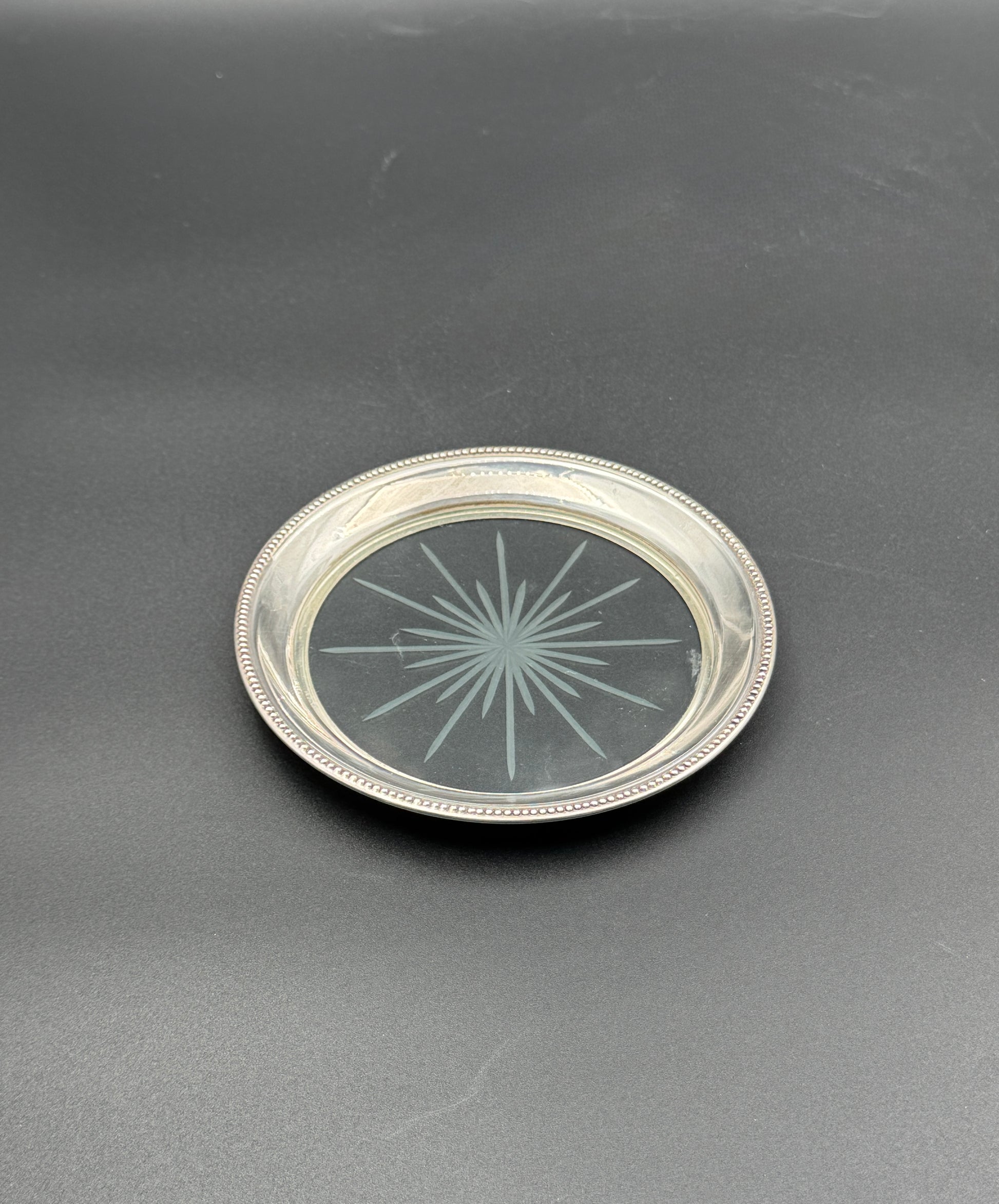 Elegant sterling silver rimmed wine coaster with etched starburst glass base, crafted by Frank M. Whiting & Co., USA, circa 1925.
