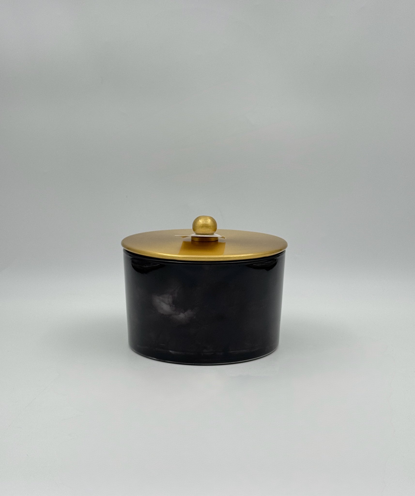 - Striking black glass with gold lid