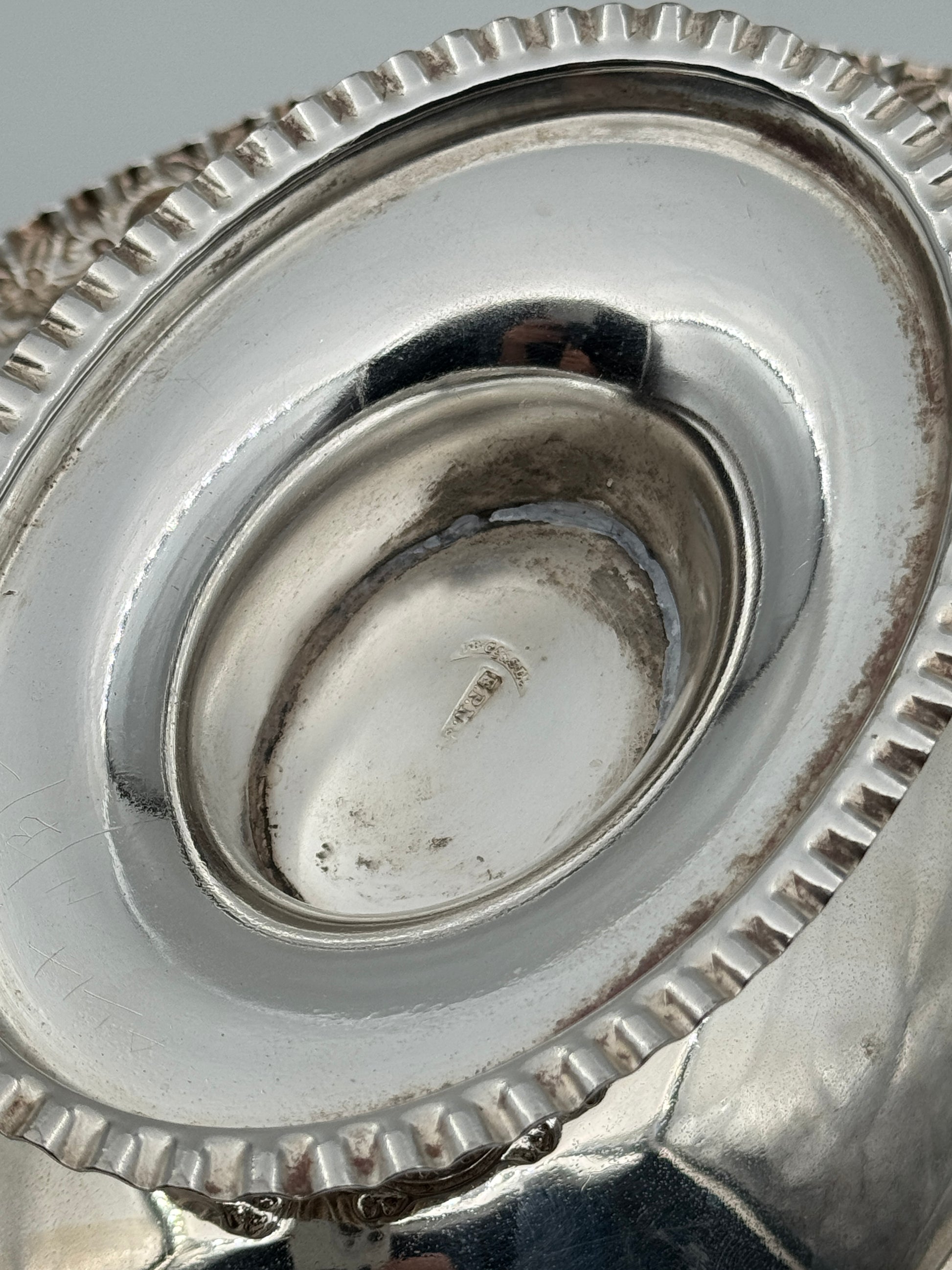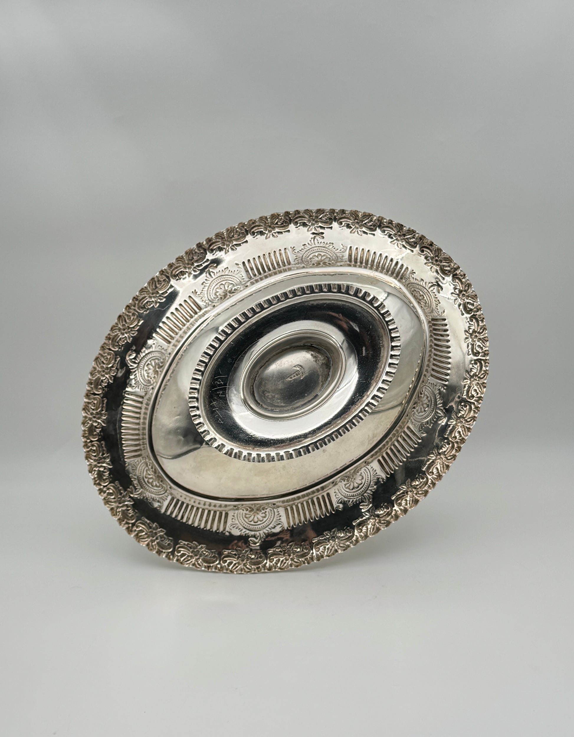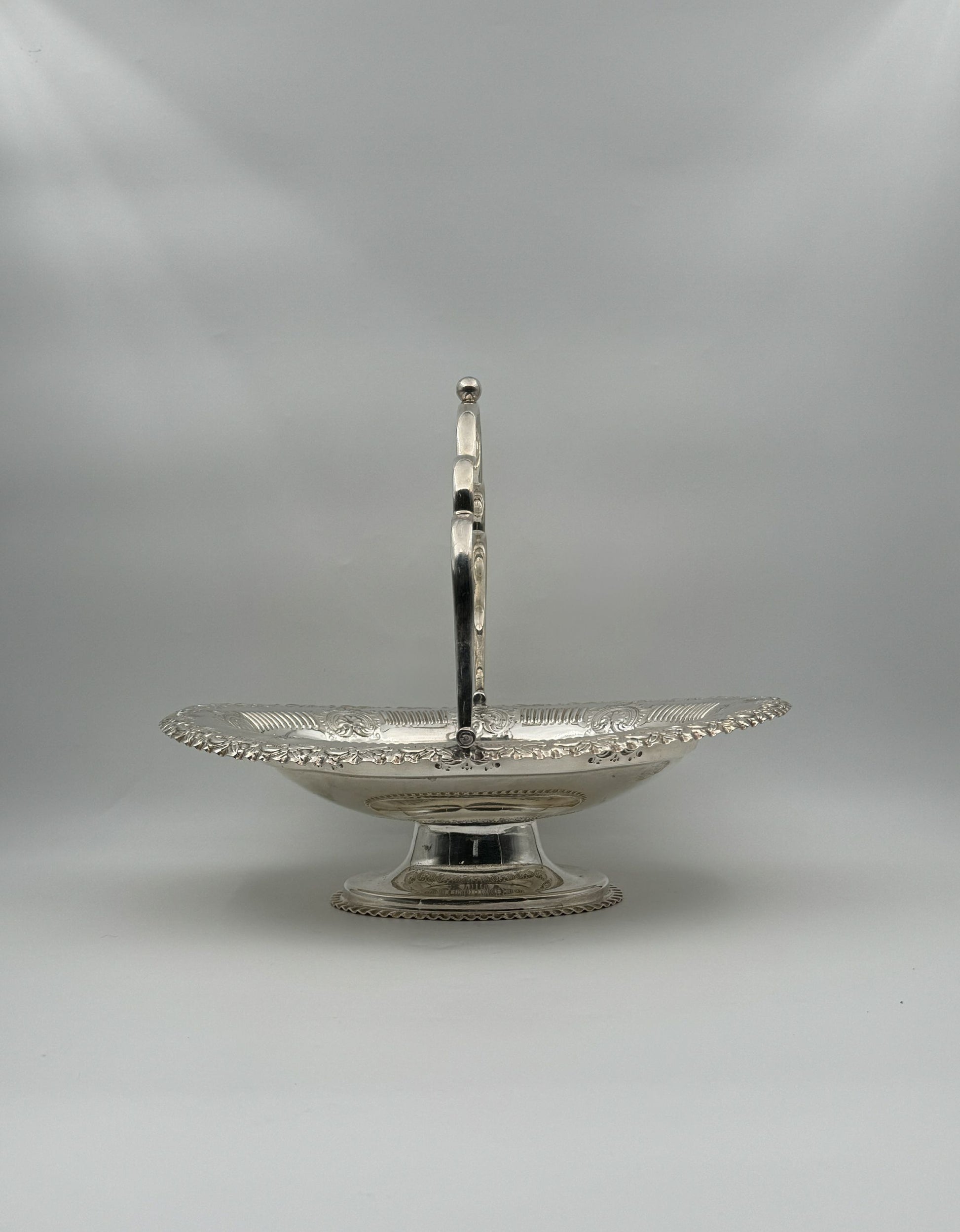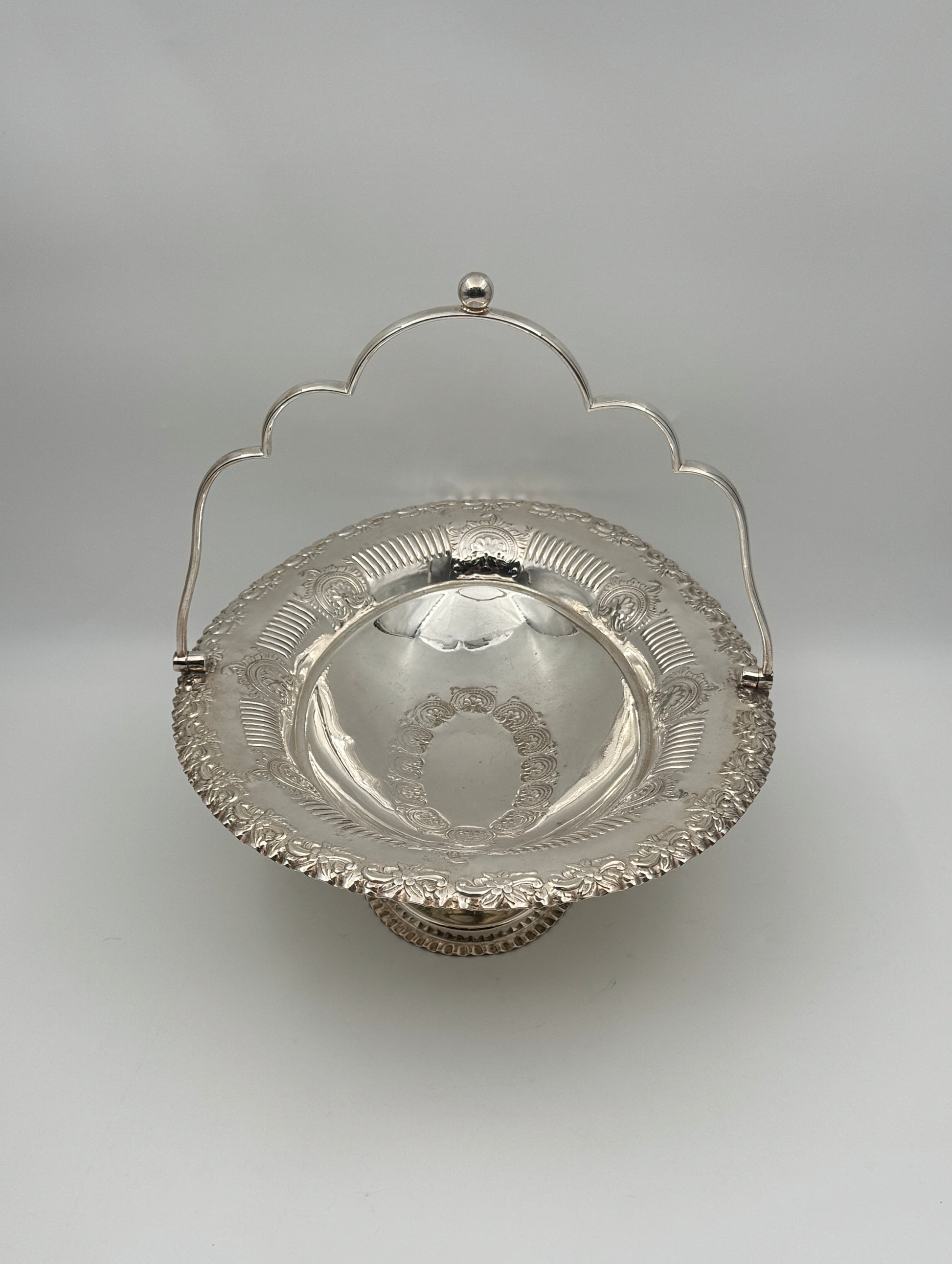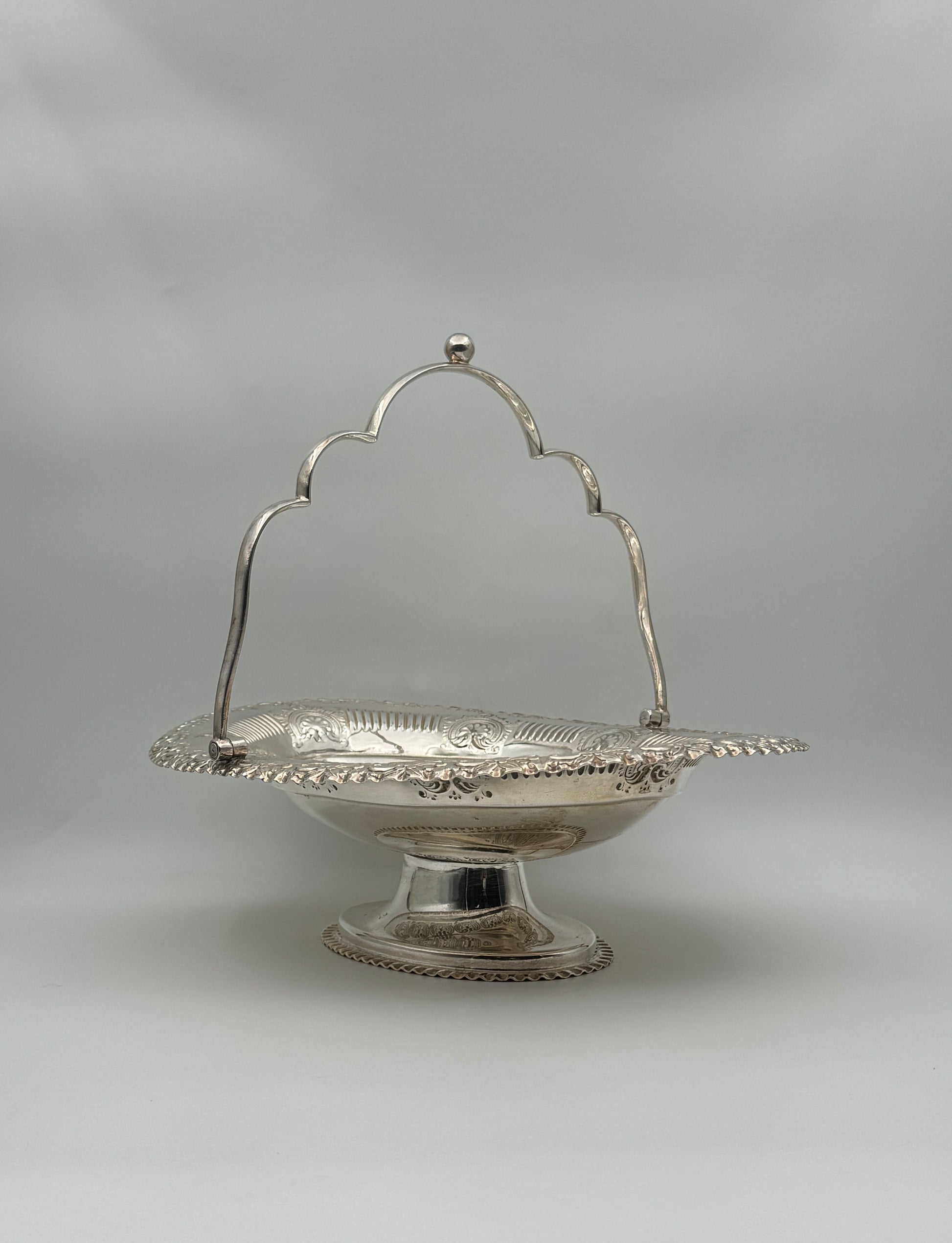 Elegant vintage silver-plated basket with a scalloped handle, chased floral and scroll engravings, and a raised pedestal base—ideal as a centerpiece or serving dish.