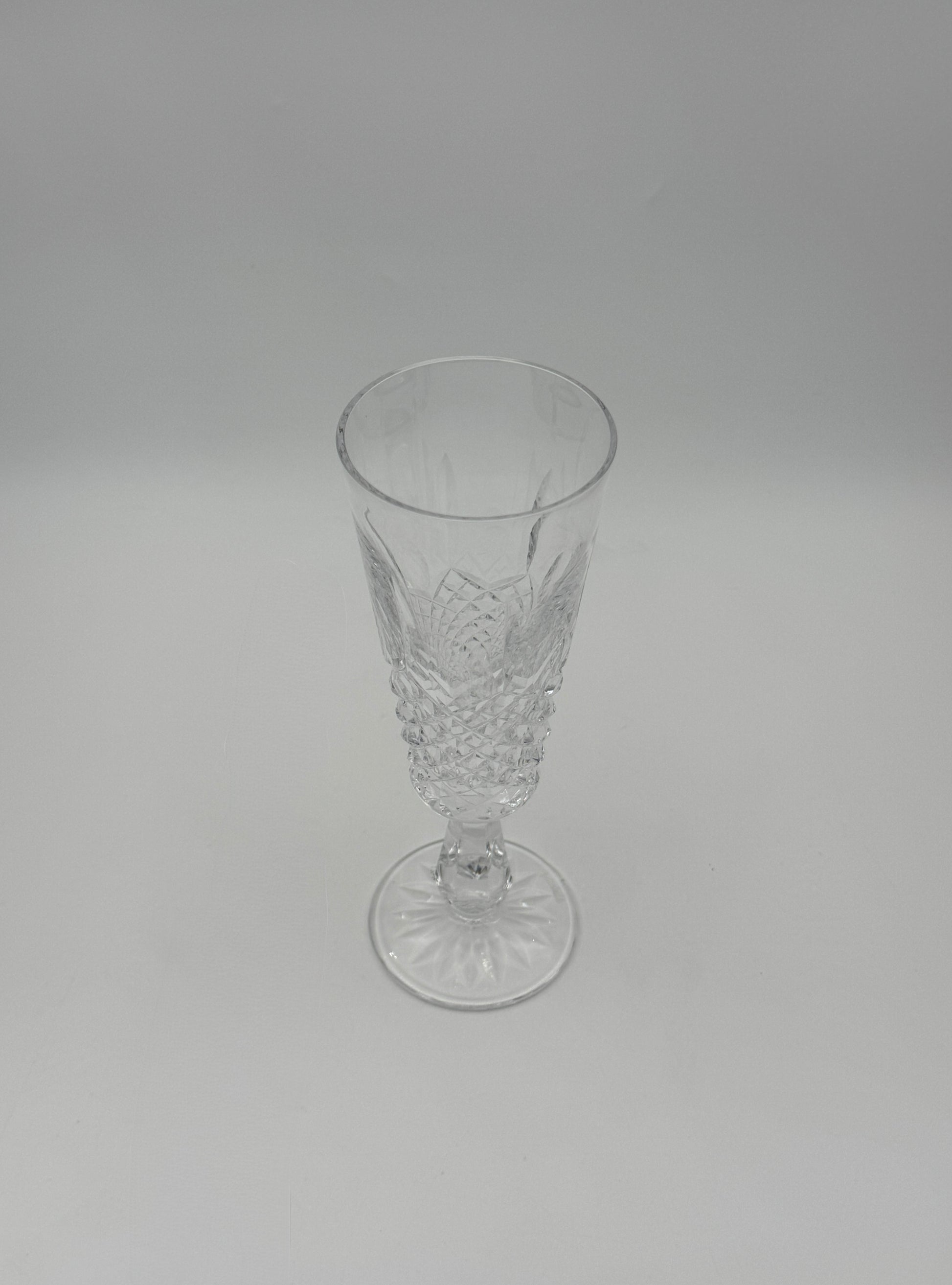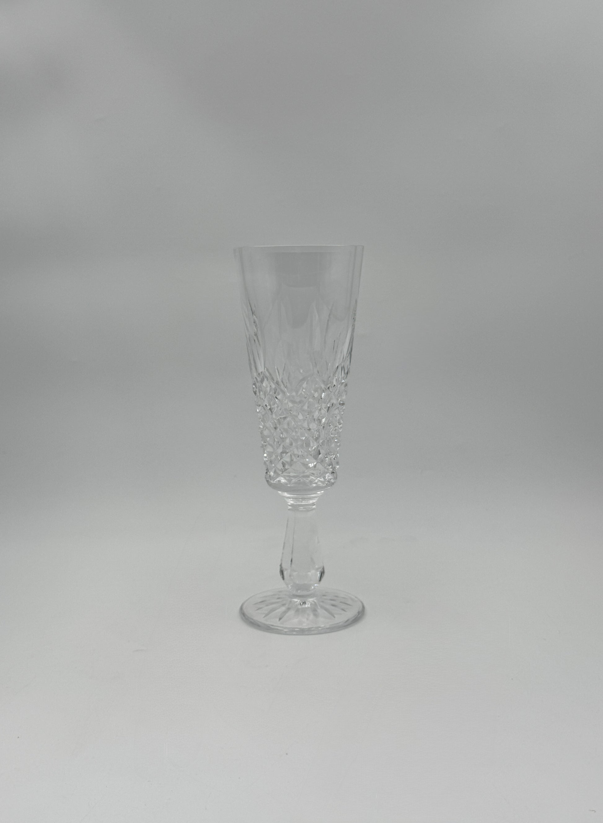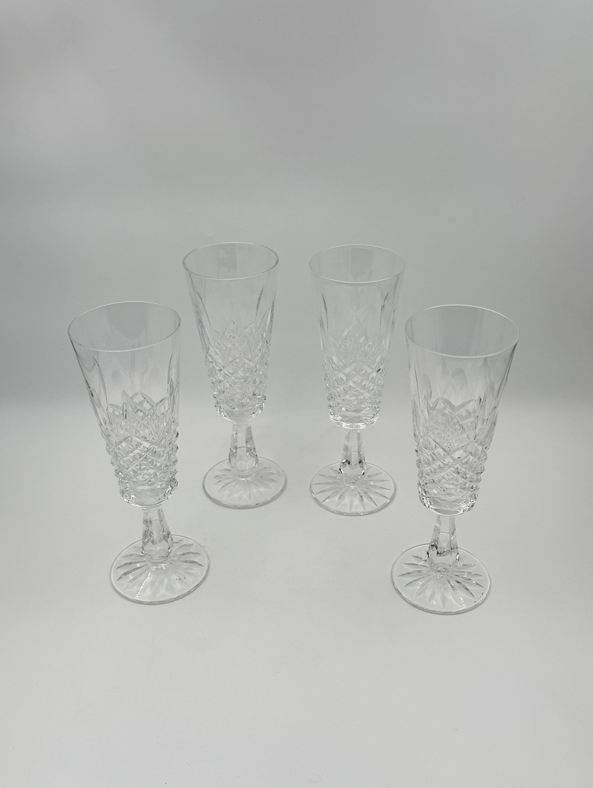 Elegant set of 4 Waterford "Kenmare" crystal champagne flutes, featuring a classic diamond and wedge cut design with a starburst base. Perfect for formal dining or special occasions.